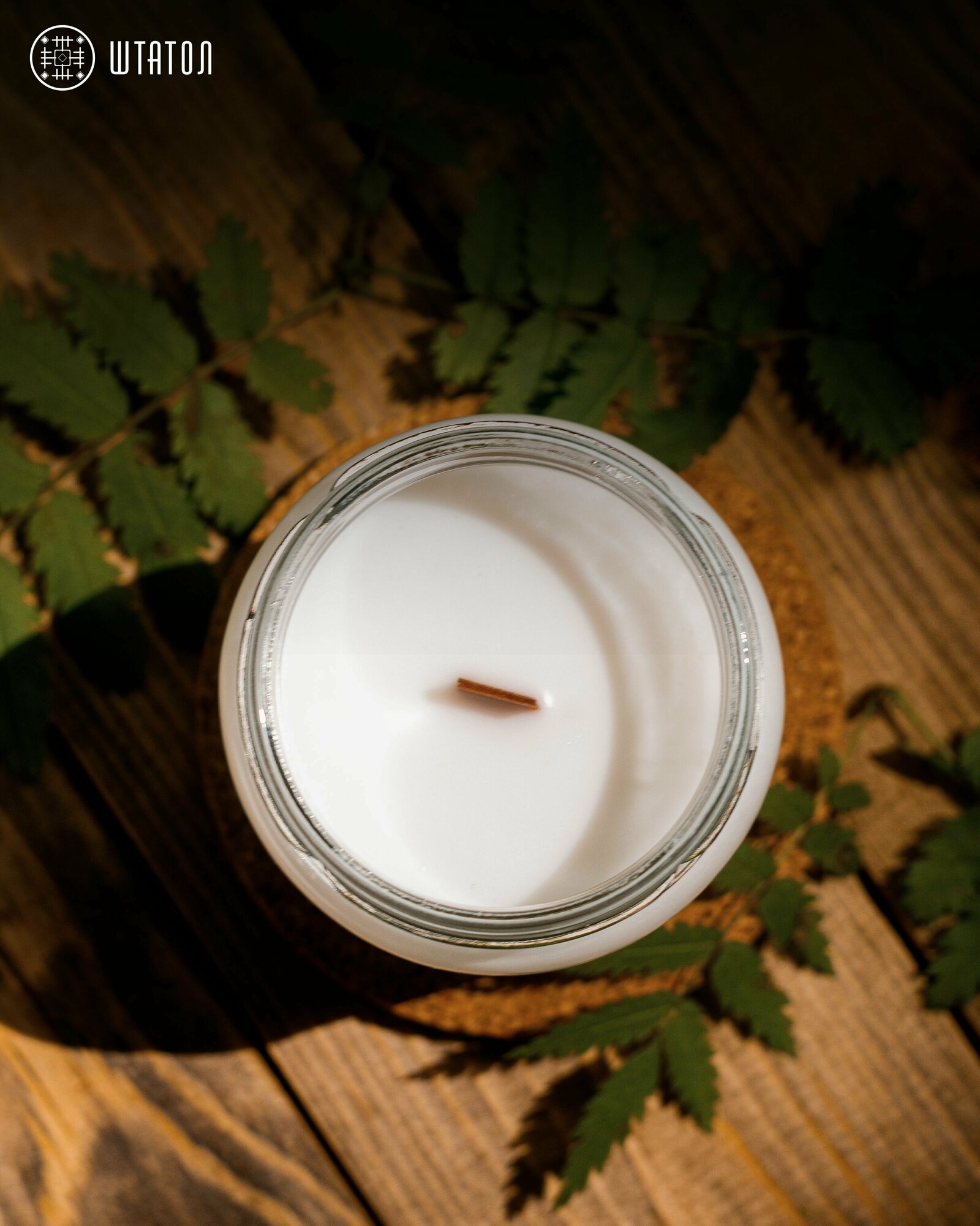 Сохранить"Бамбуковый крем" / свечи штатол с ароматом / свеча ароматическая с деревянным фитилем в стеклянной банке с крышкой 220 мл. / свечка аромавоск интересное: