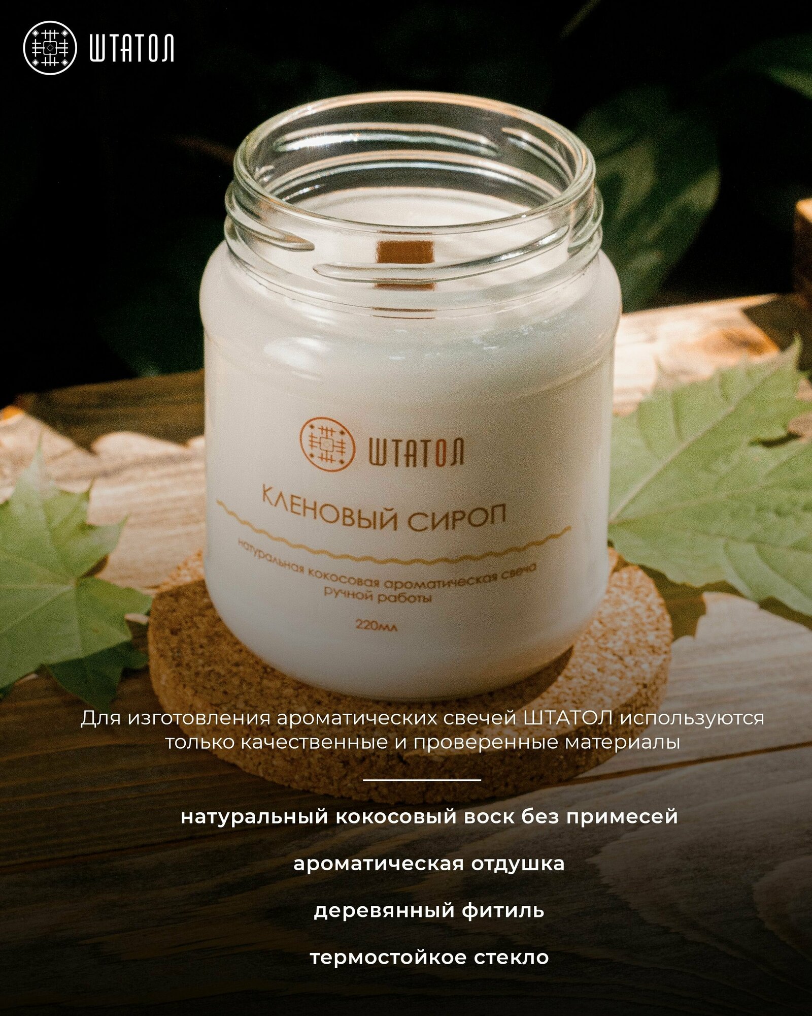 Купить "Кленовый сироп" / свечи штатол с ароматом / свеча ароматическая с деревянным фитилем в стеклянной банке с крышкой 220 мл. / свечка аромавоск
