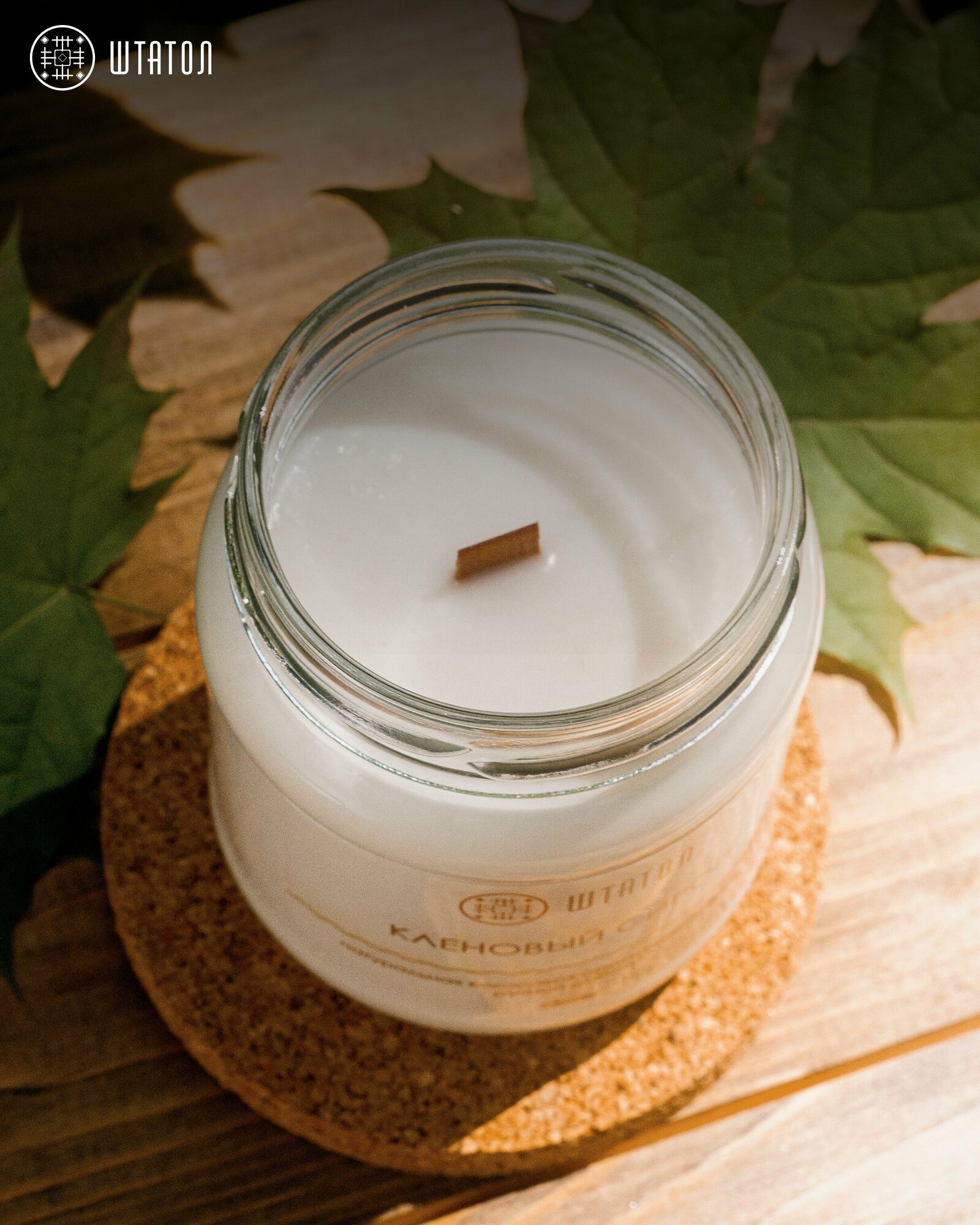 Сохранить"Кленовый сироп" / свечи штатол с ароматом / свеча ароматическая с деревянным фитилем в стеклянной банке с крышкой 220 мл. / свечка аромавоск интересное: