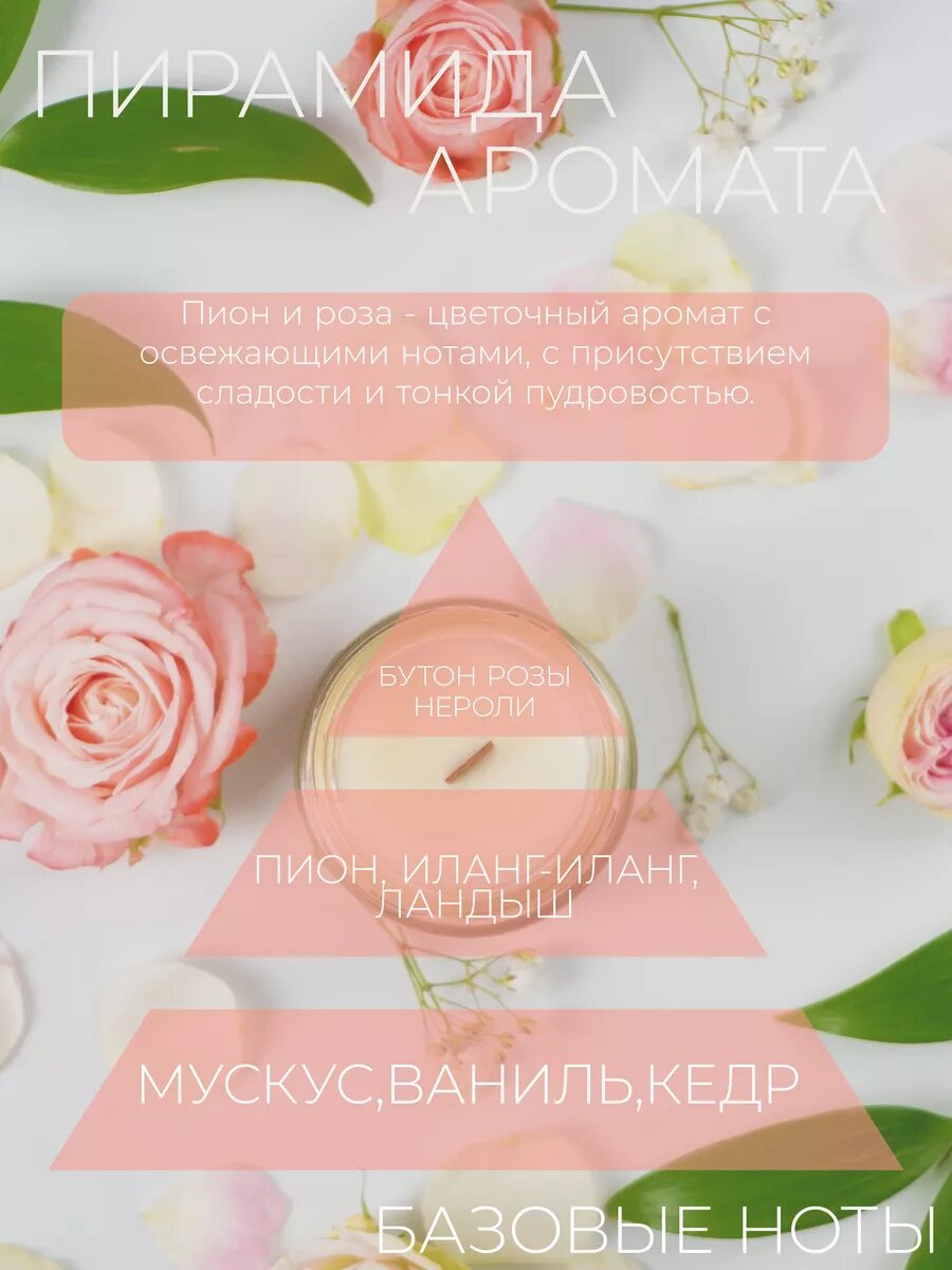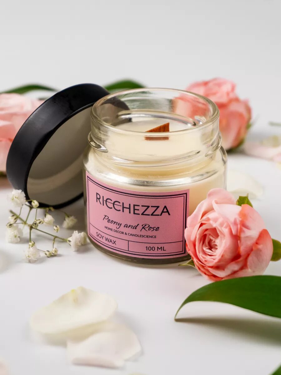 Купить Ароматизированная свеча RICCHEZZA с запахом Пион и Роза / Деревянный фитиль с треском /100мл / 25ч горения / Ручная работа / Handmade