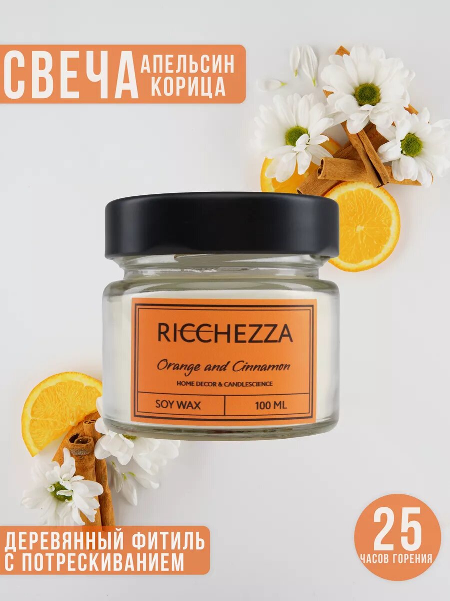 Купить Ароматизированная свеча RICCHEZZA с запахом Апельсин и корица / Деревянный фитиль с треском /100мл / 25ч горения / Ручная работа / Handmade