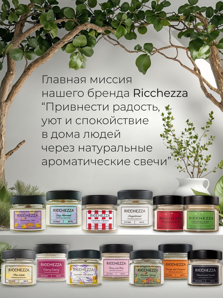 Ароматизированная свеча RICCHEZZA с запахом Пион и Роза / Деревянный фитиль с треском /100мл / 25ч горения / Ручная работа / Handmade