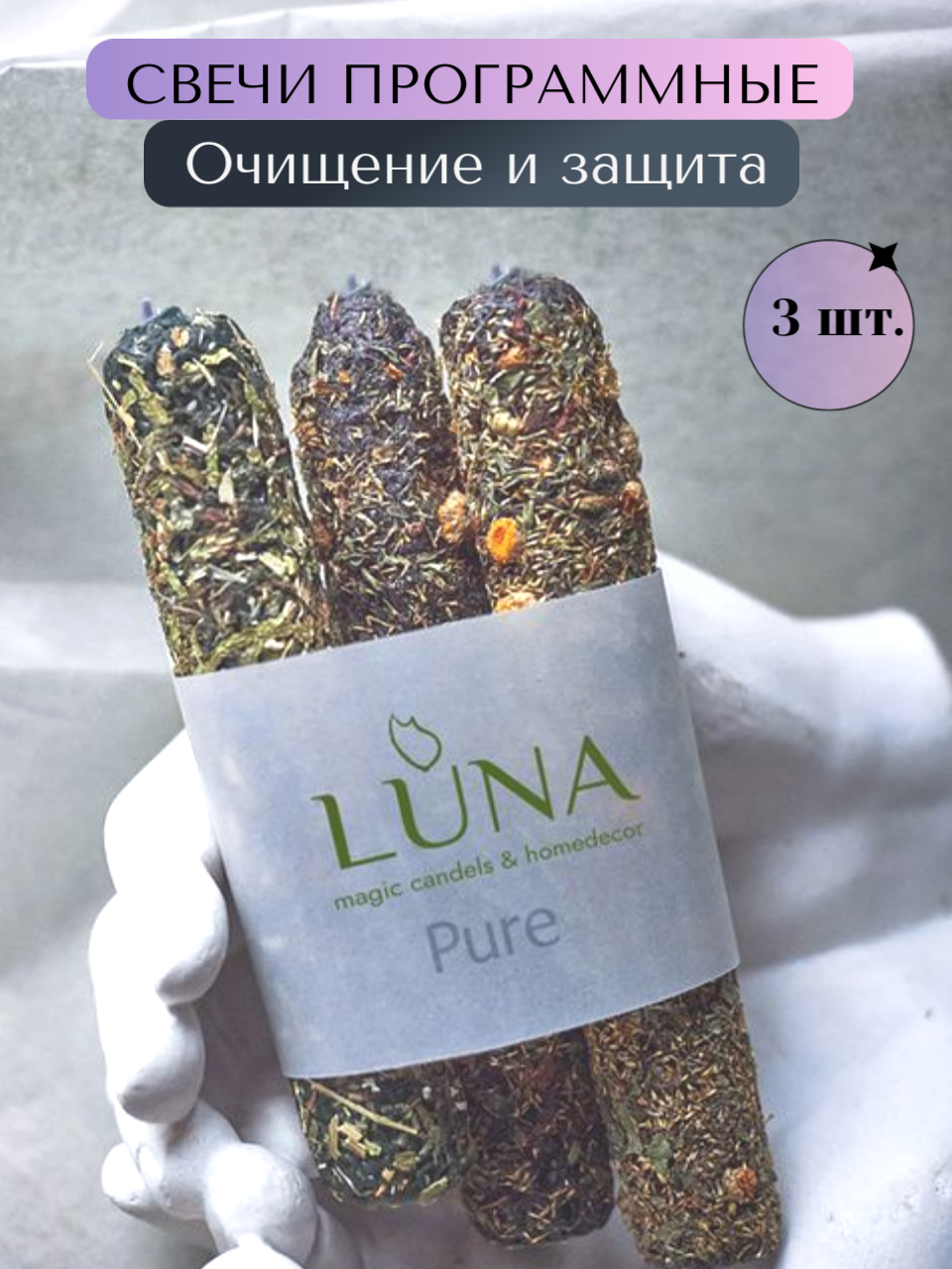 Купить Программные магические свечи с травами и скруткой, 3 шт "Очищение и защита", 13х2 см, черные, 100% ручная работа