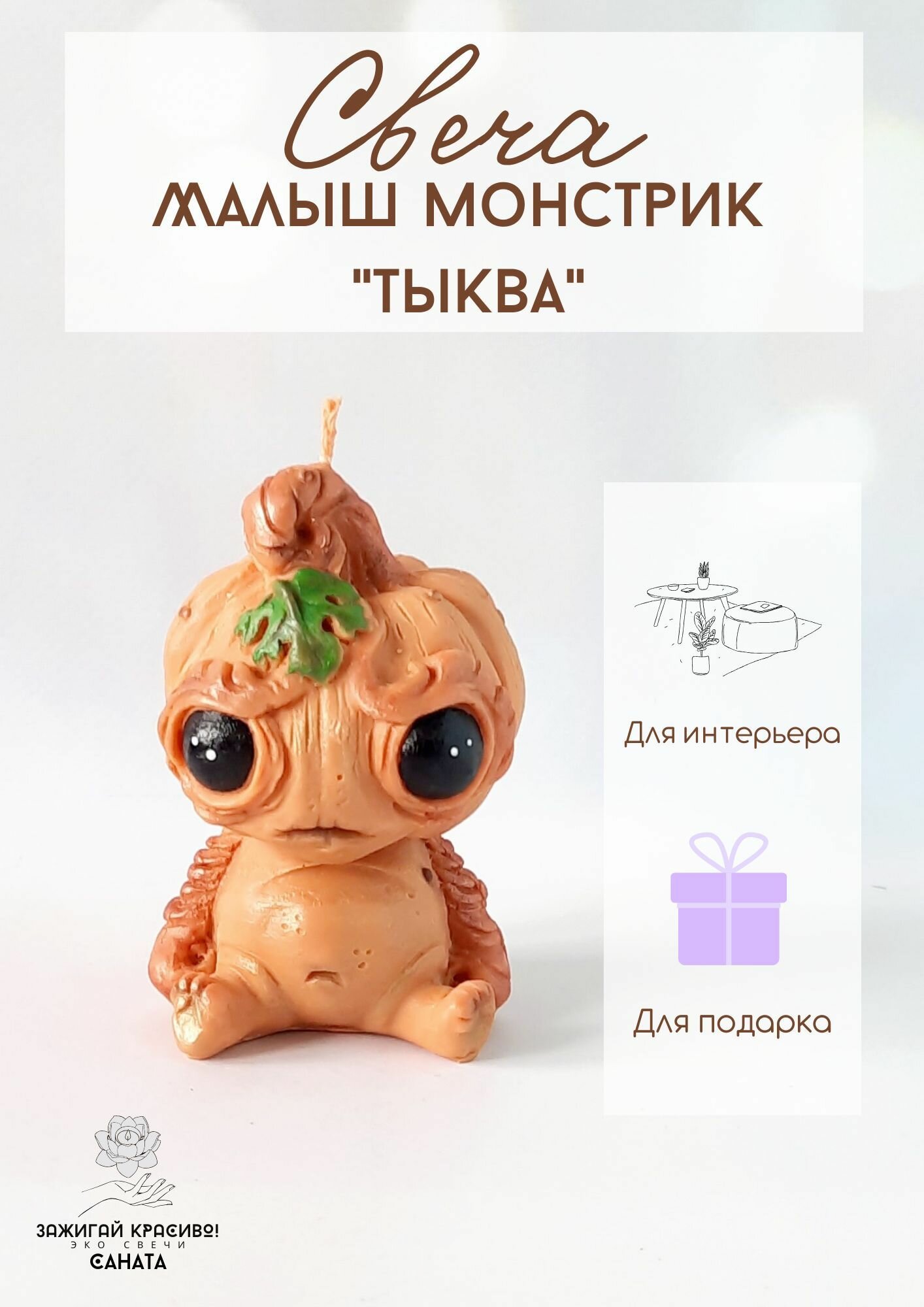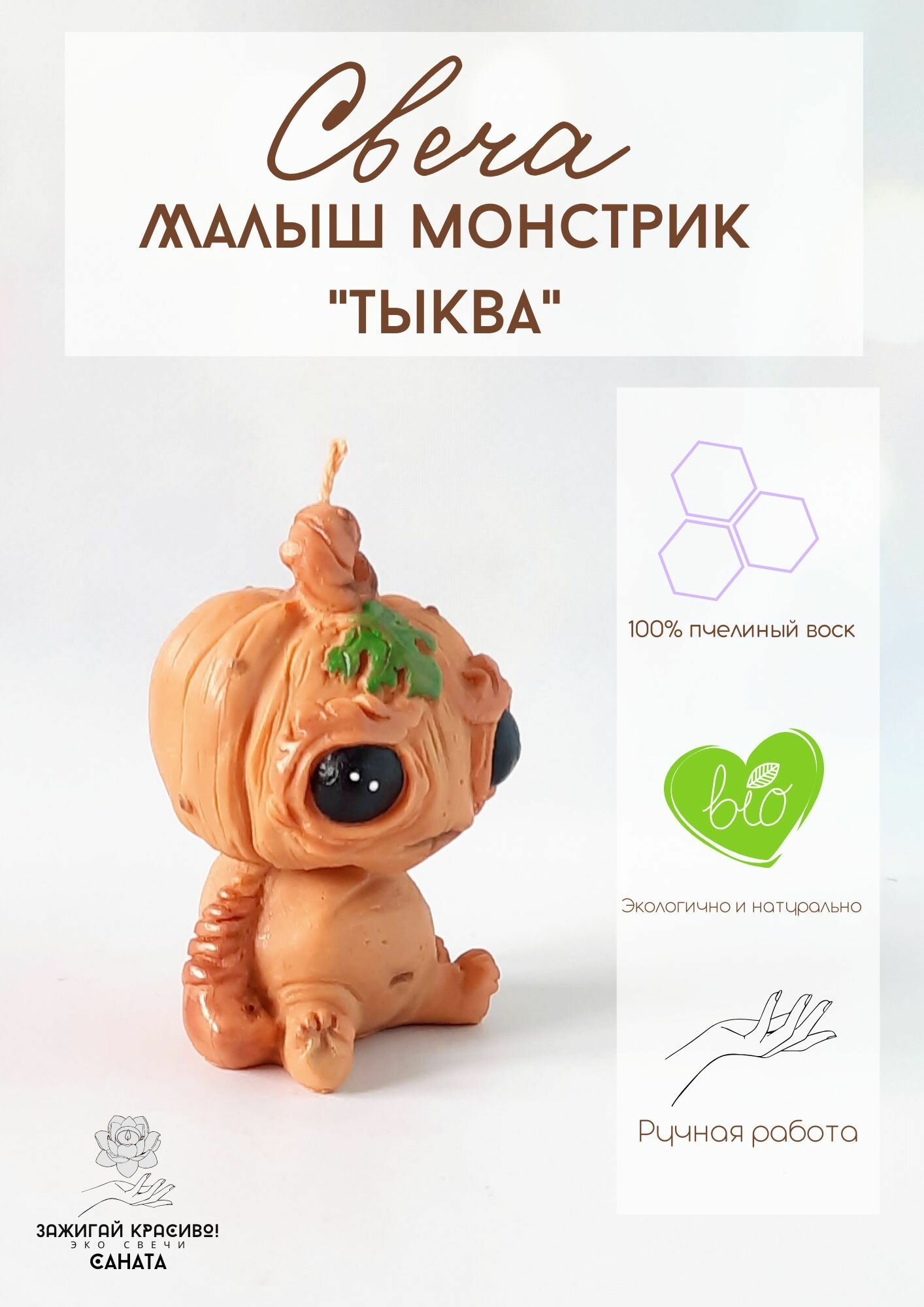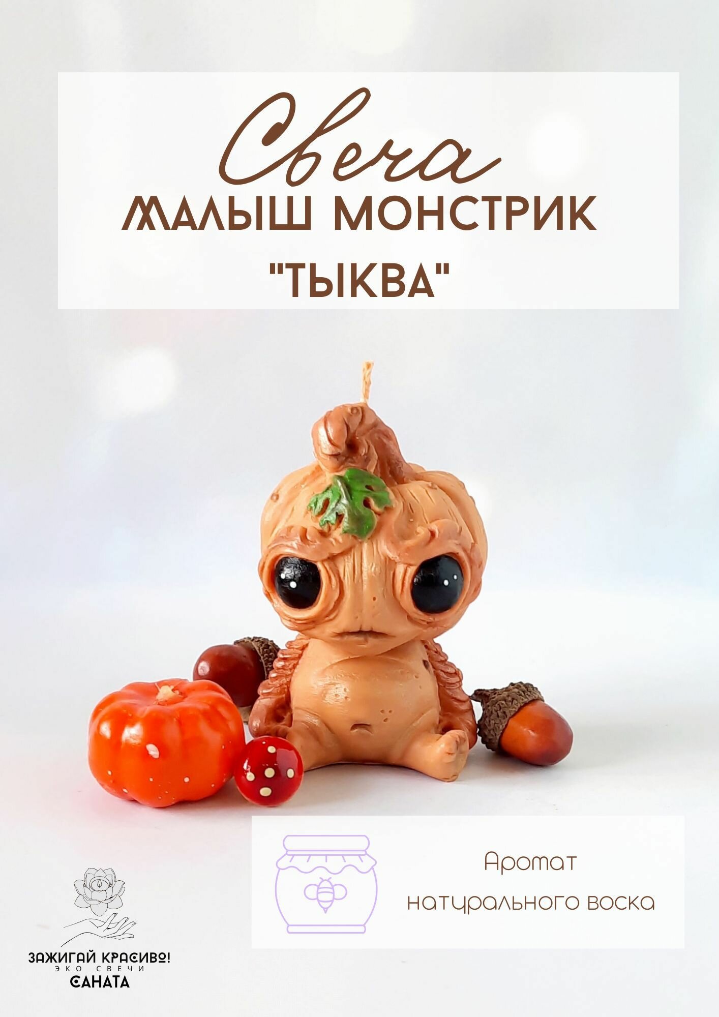 Малыш монстрик "Тыква" , подарочная интерьерная восковая свеча ручной работы интересное: