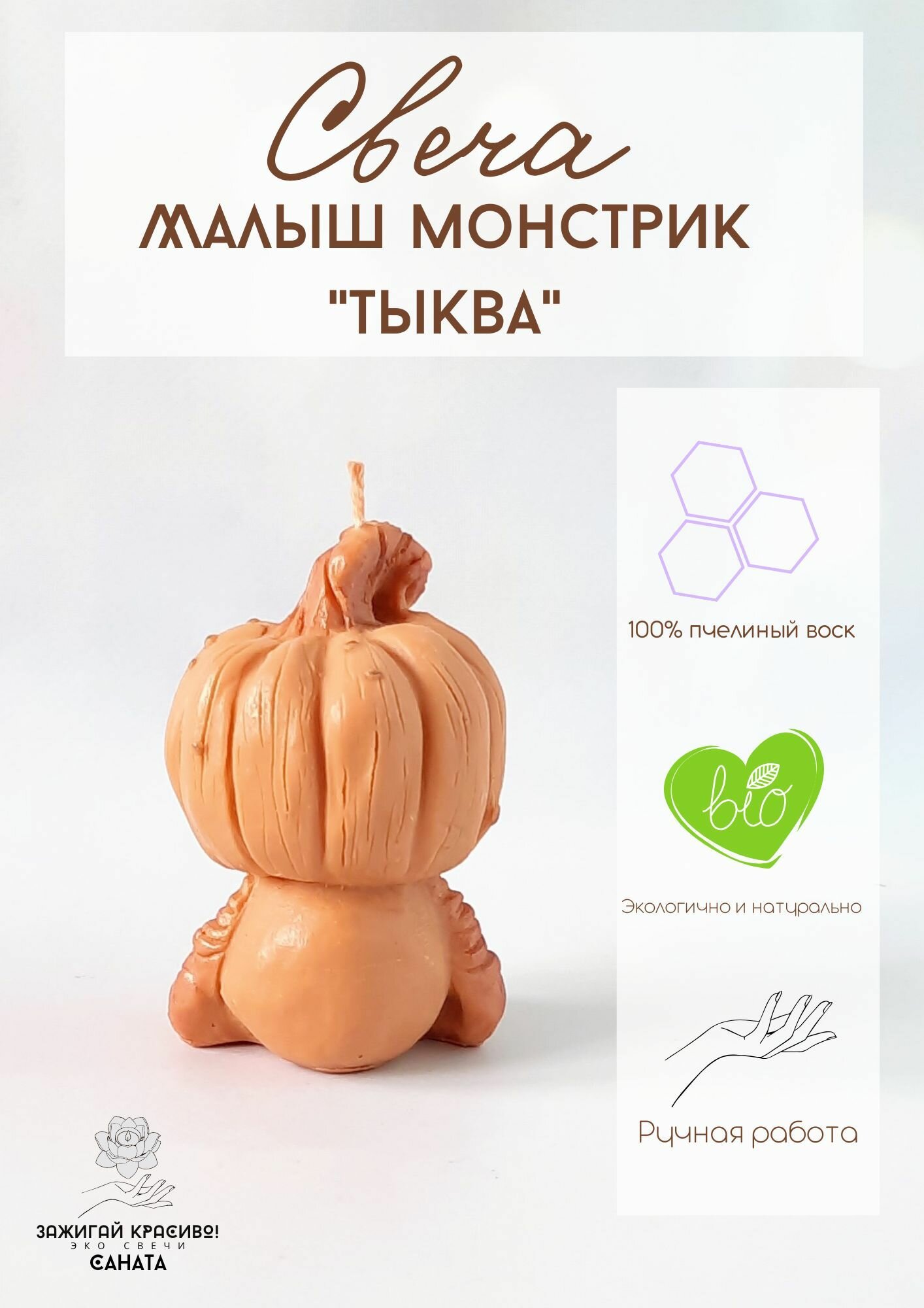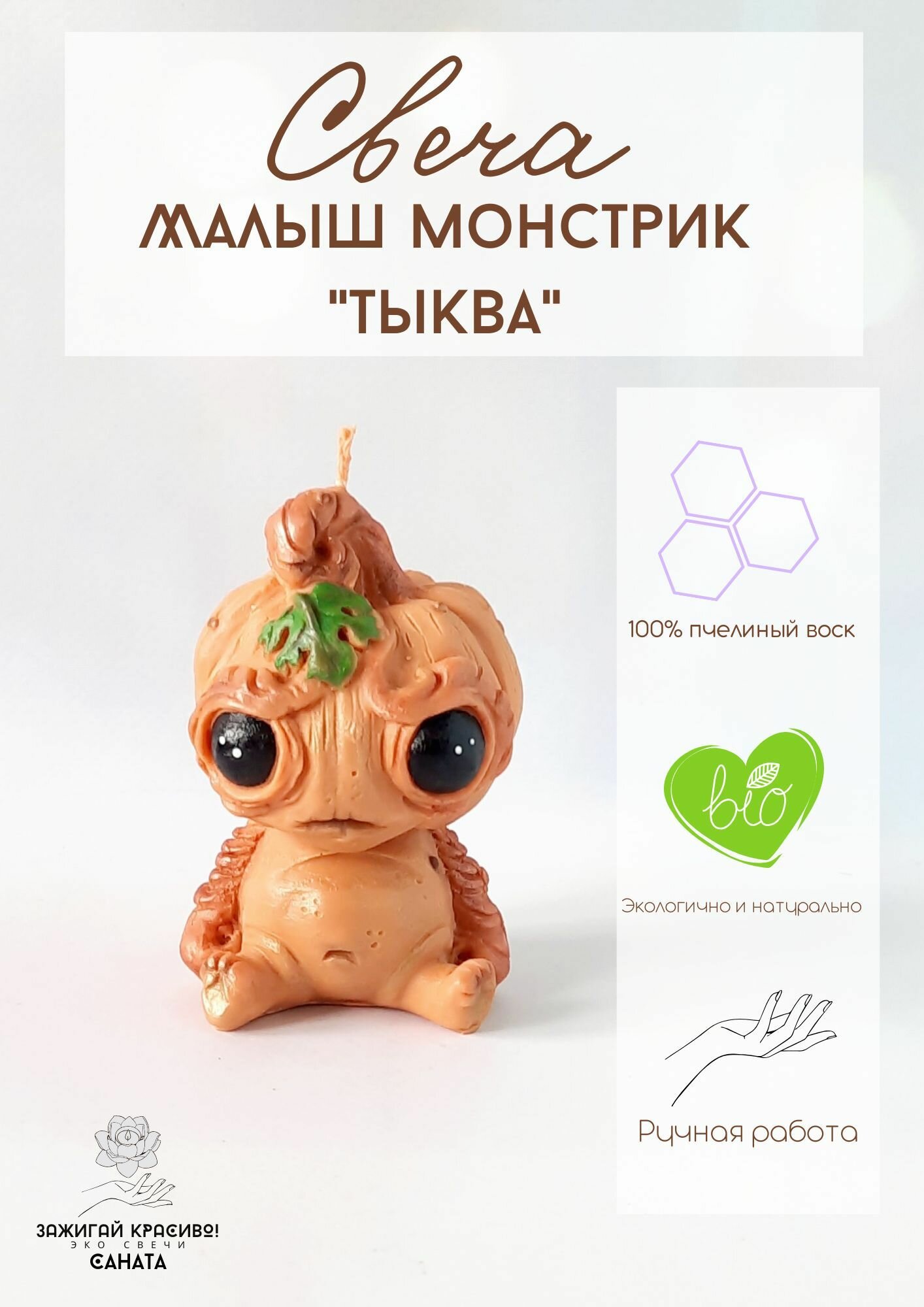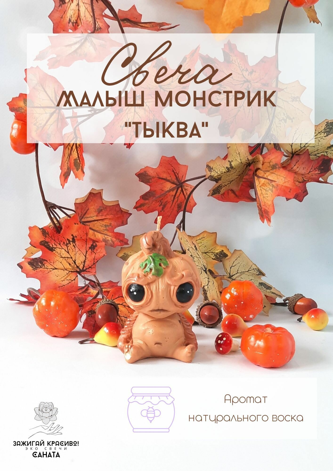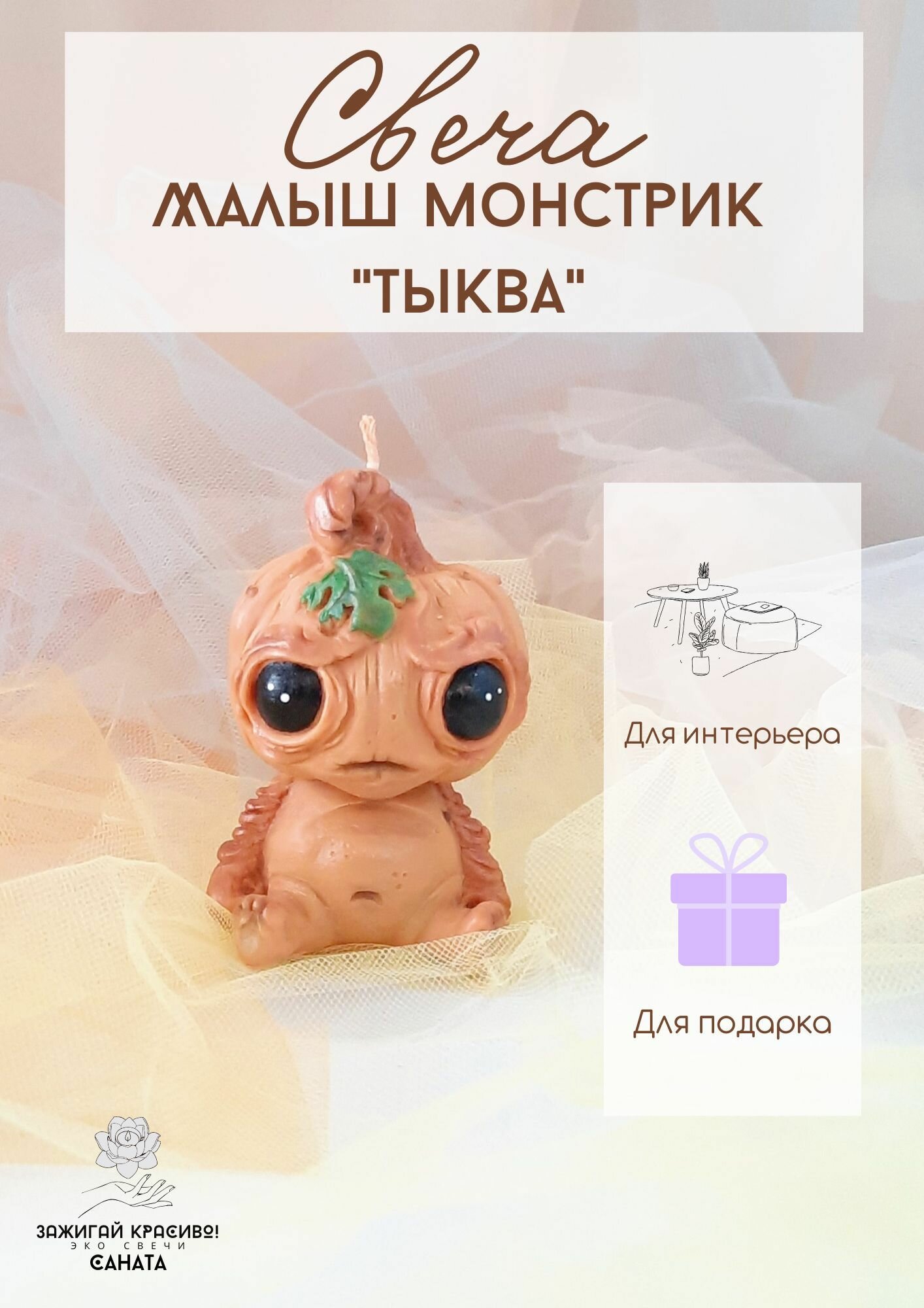 Малыш монстрик "Тыква" , подарочная интерьерная восковая свеча ручной работы интересное: