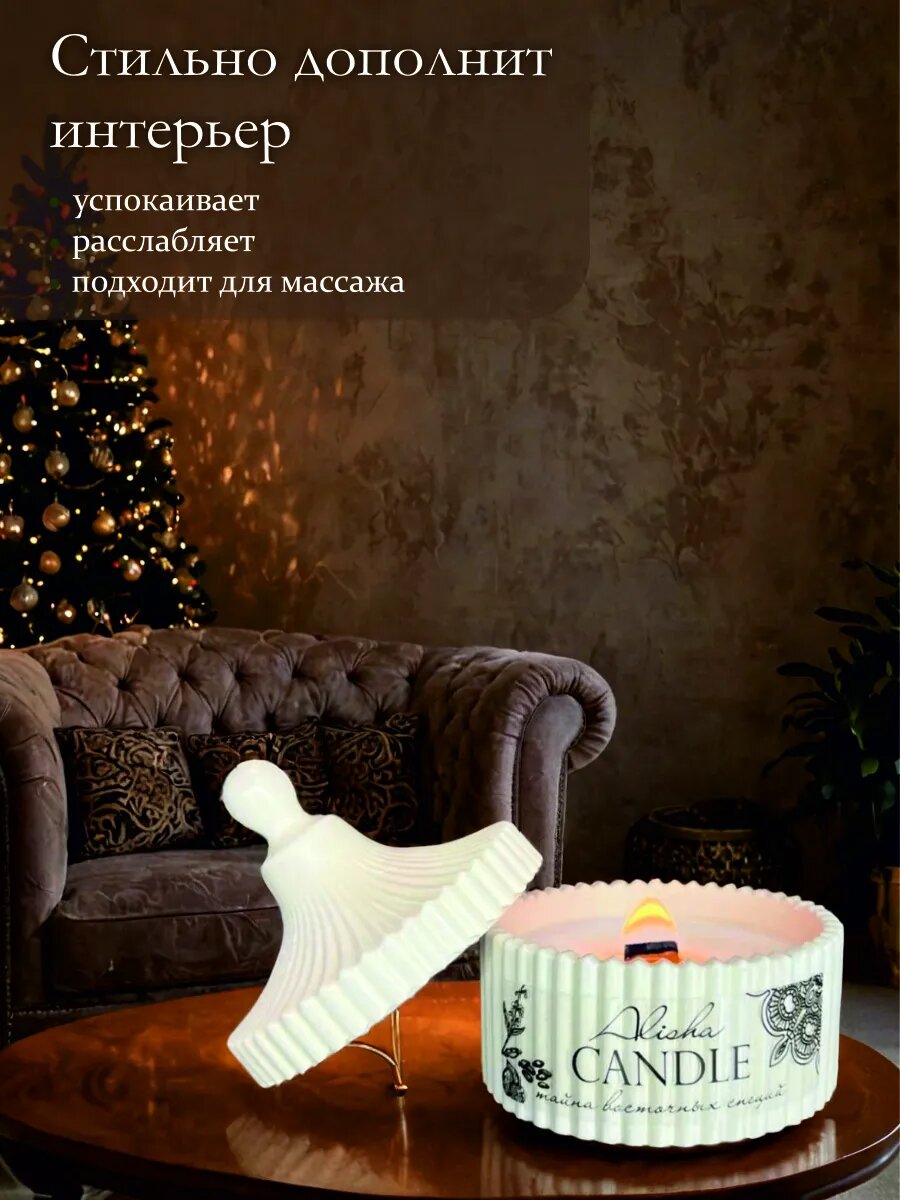 Свеча ароматическая из кокосового воска с деревянным фитилем в гипсовой шкатулке, с древесным сладким ароматом