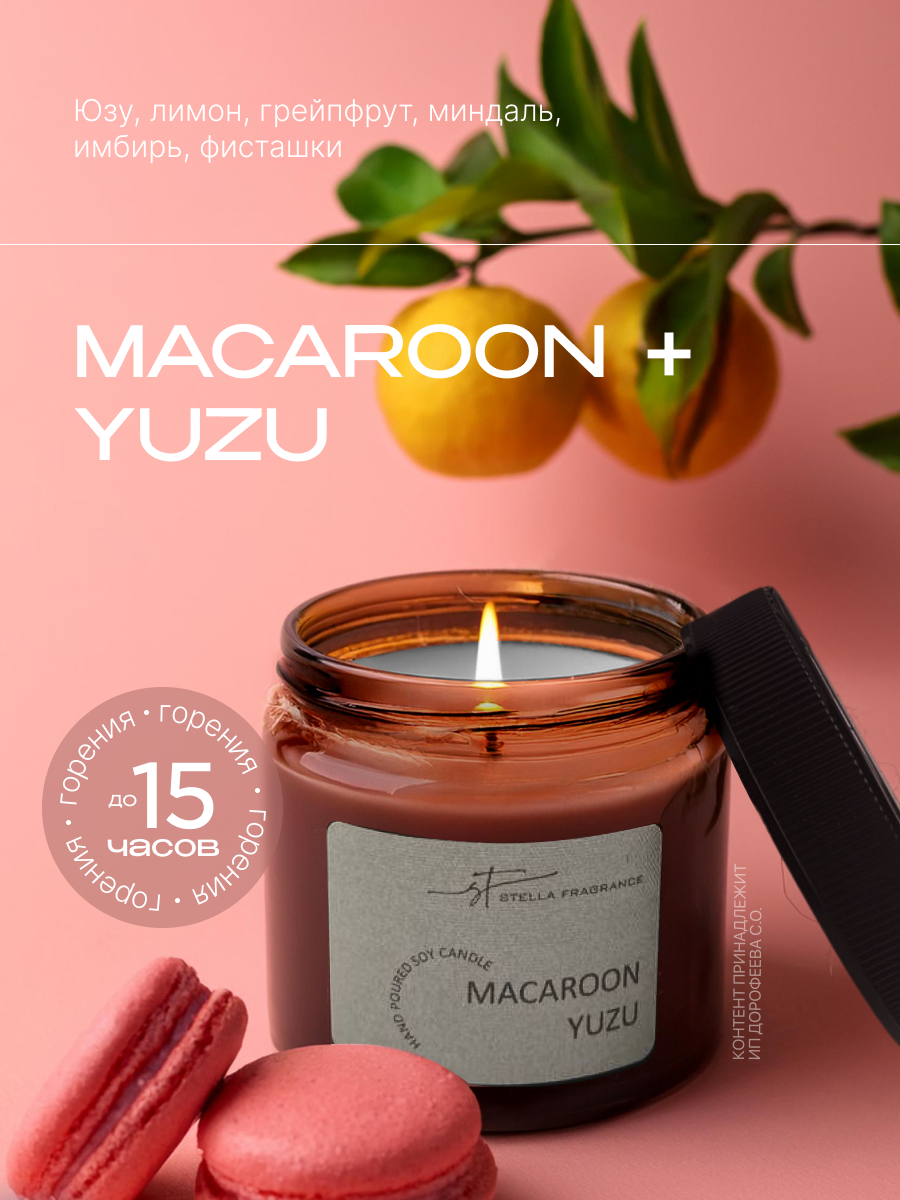 Свеча ароматическая декоративная с фитилем Stella Fragrance с ароматом MACAROON YUZU, Макарун и Юзу, 50 гр. интересное: