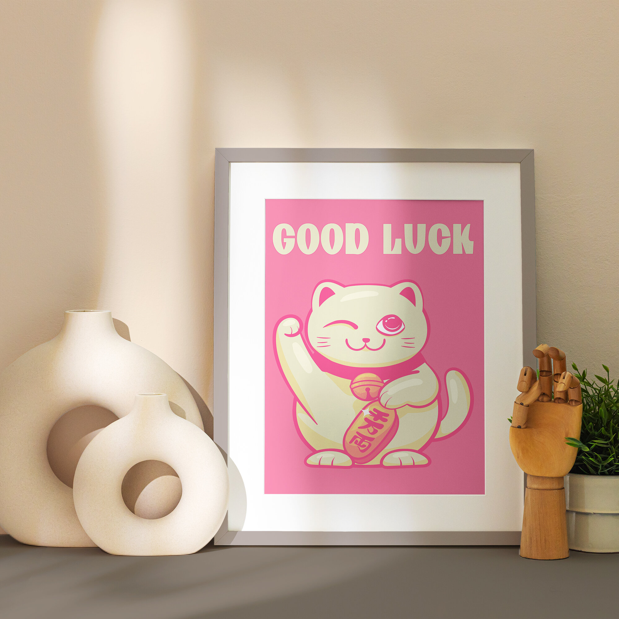 MISHKA POSTER Постер для интерьера "Good luck/ Удачи" с манэки-нэко, А3 / Подарок на день рождения