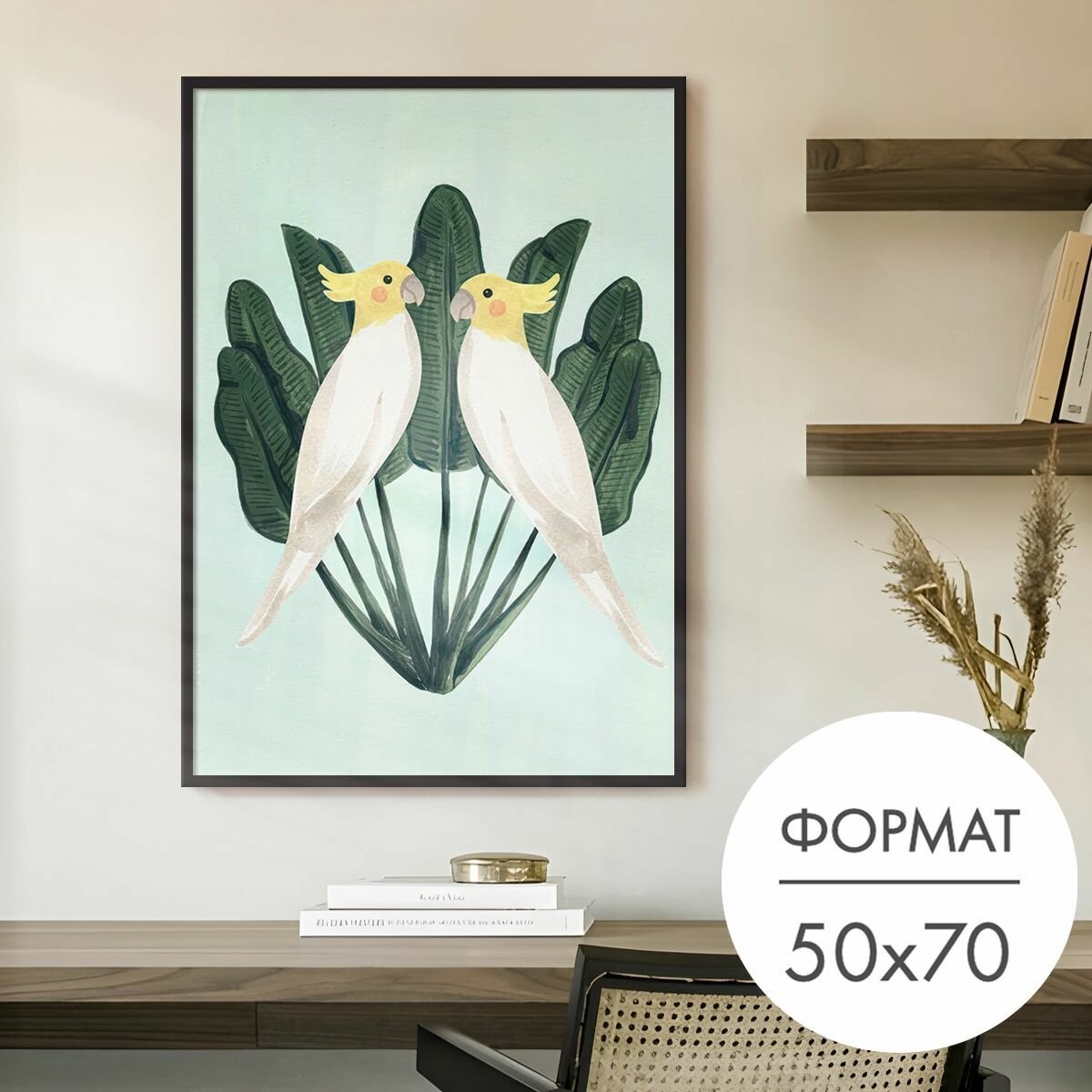 Купить Постер "Попугаи на тропических листья" 50x70 без рамки на стену для интерьера