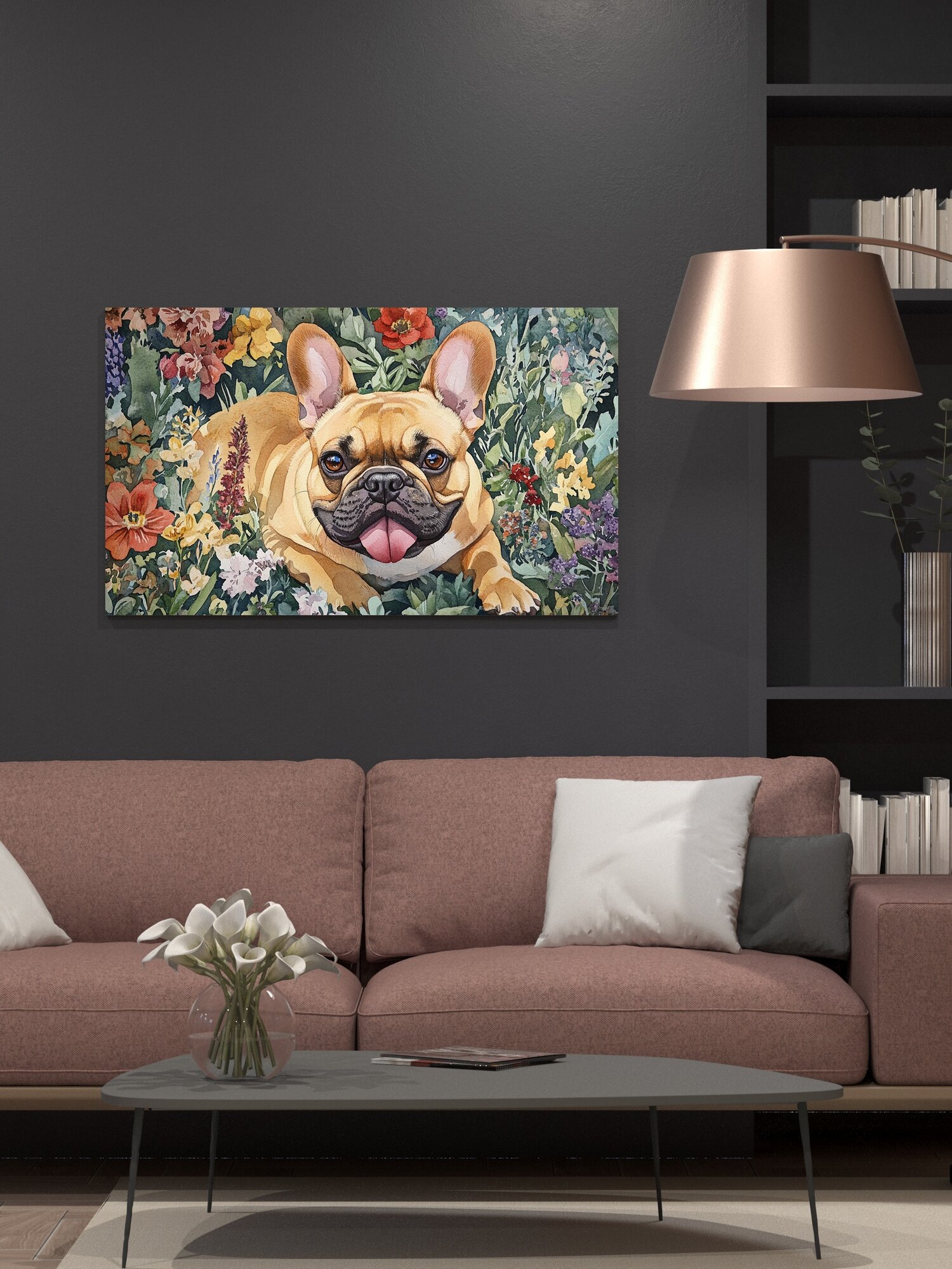 Купить Картина на холсте интерьерная 100х60 см, акварель, французский бульдог, верность, преданность, сад, яркие цвета, зелень