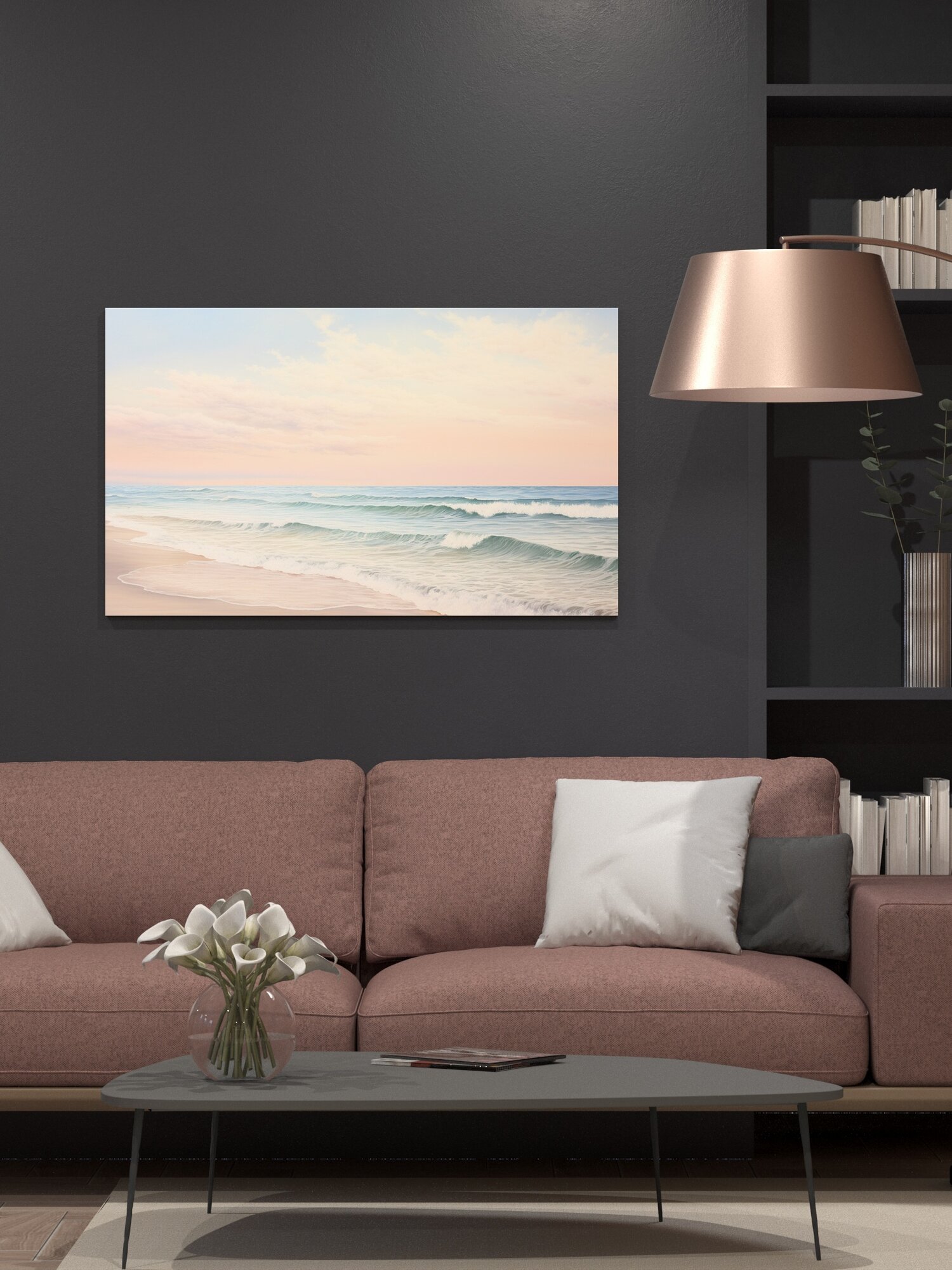 Купить Картина на холсте интерьерная 100х60 см, рассвет, пляж, пейзаж, волны, берег, небо, пастельные тонов, сияние