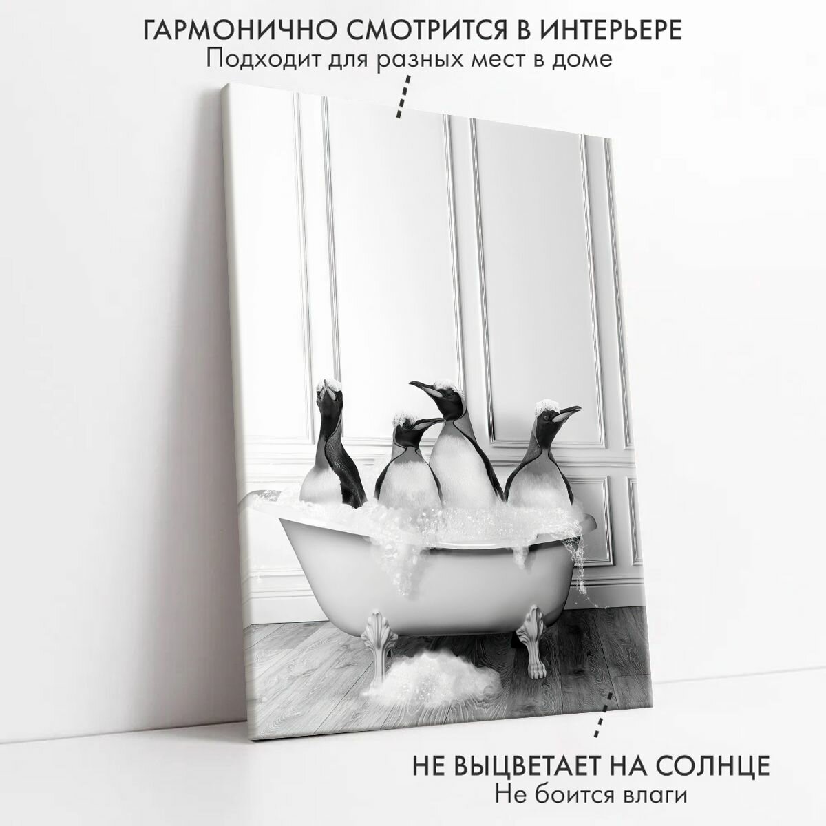 СохранитьКартина на холсте "Четыре пингвина в ванной" 40x50 на стену для интерьера интересное: