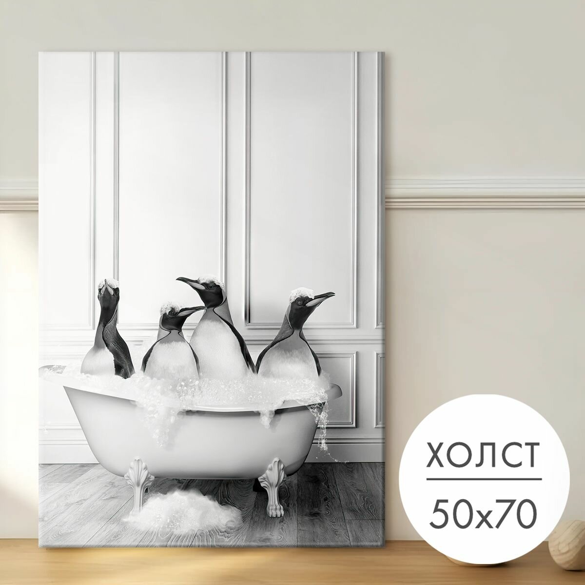 Купить Картина на холсте "Четыре пингвина в ванной" 50x70 на стену для интерьера