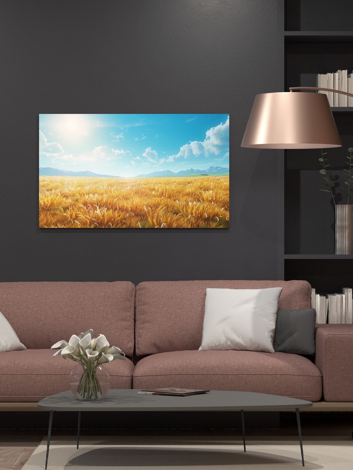 Картина на холсте интерьерная 100х60 см, пейзаж, лето, солнце, пшеница, поле, горы, небо, разрешение, живописный интересное: