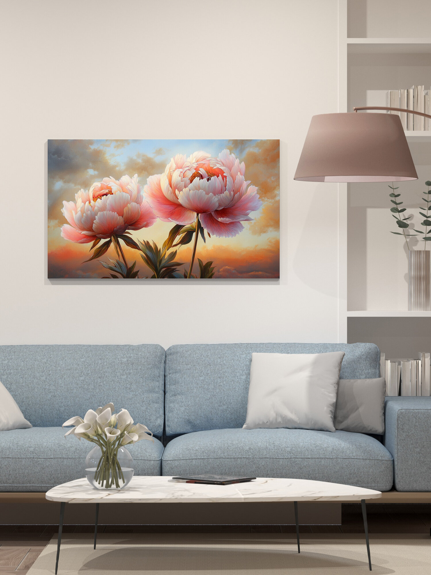 Купить Картина на холсте интерьерная 100х60 см, пионы, закат, акрил, яркие краски, мазки кисти, пленительная красота, цветы