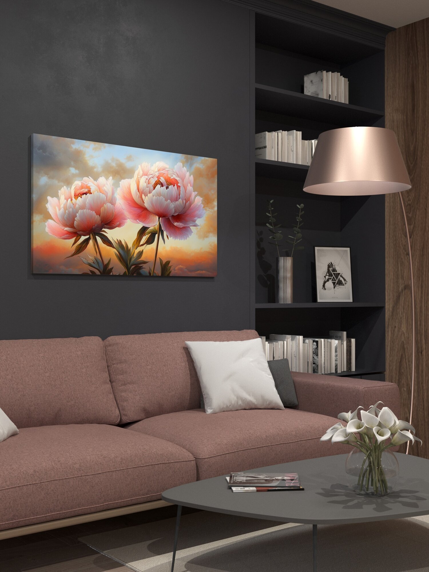 Картина на холсте интерьерная 100х60 см, пионы, закат, акрил, яркие краски, мазки кисти, пленительная красота, цветы интересное: