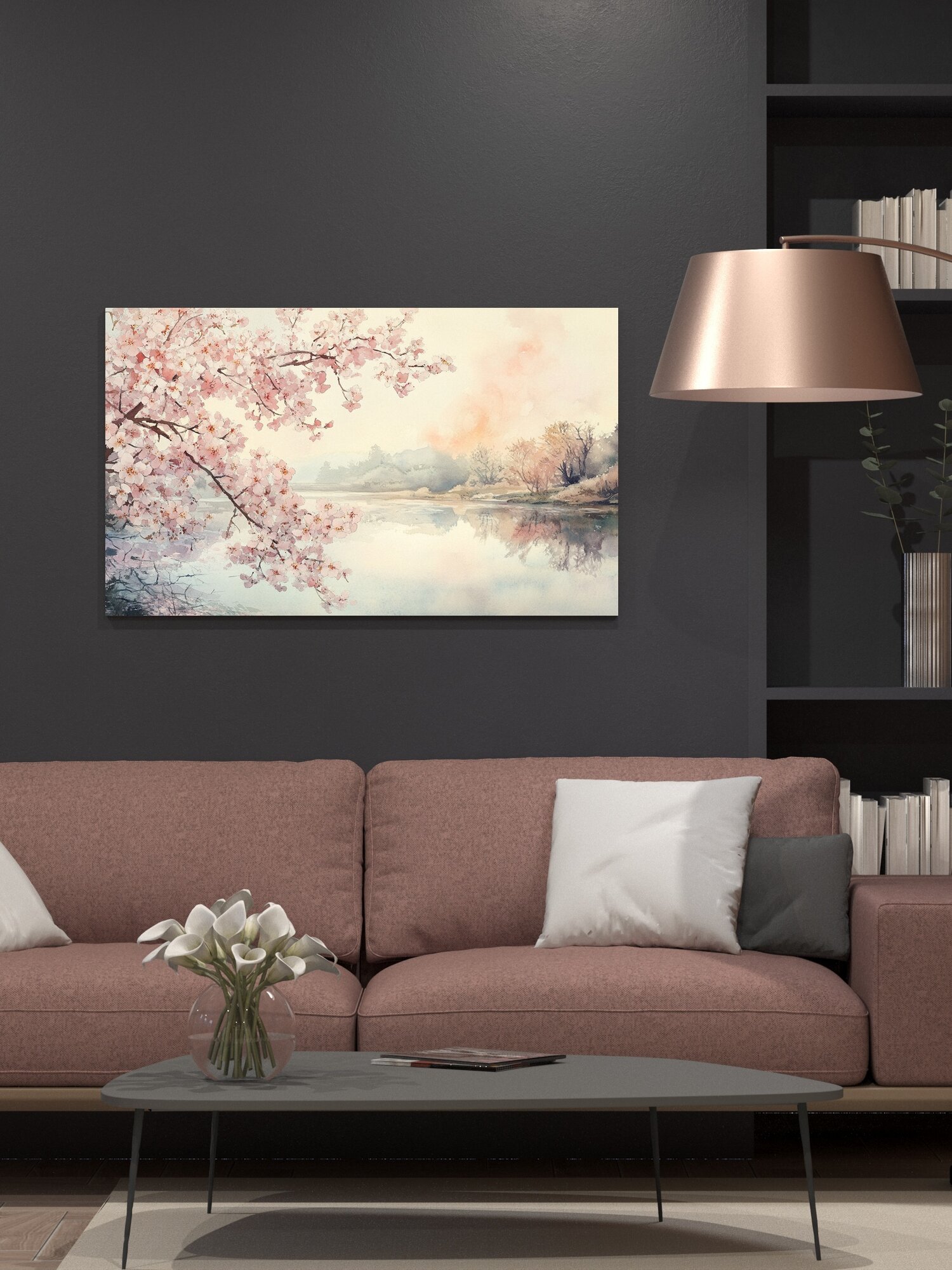 Купить Картина на холсте интерьерная 100х60 см, Сакура, цветение, акварель, река, розовые цветы, дымка, небо, пастельные тона