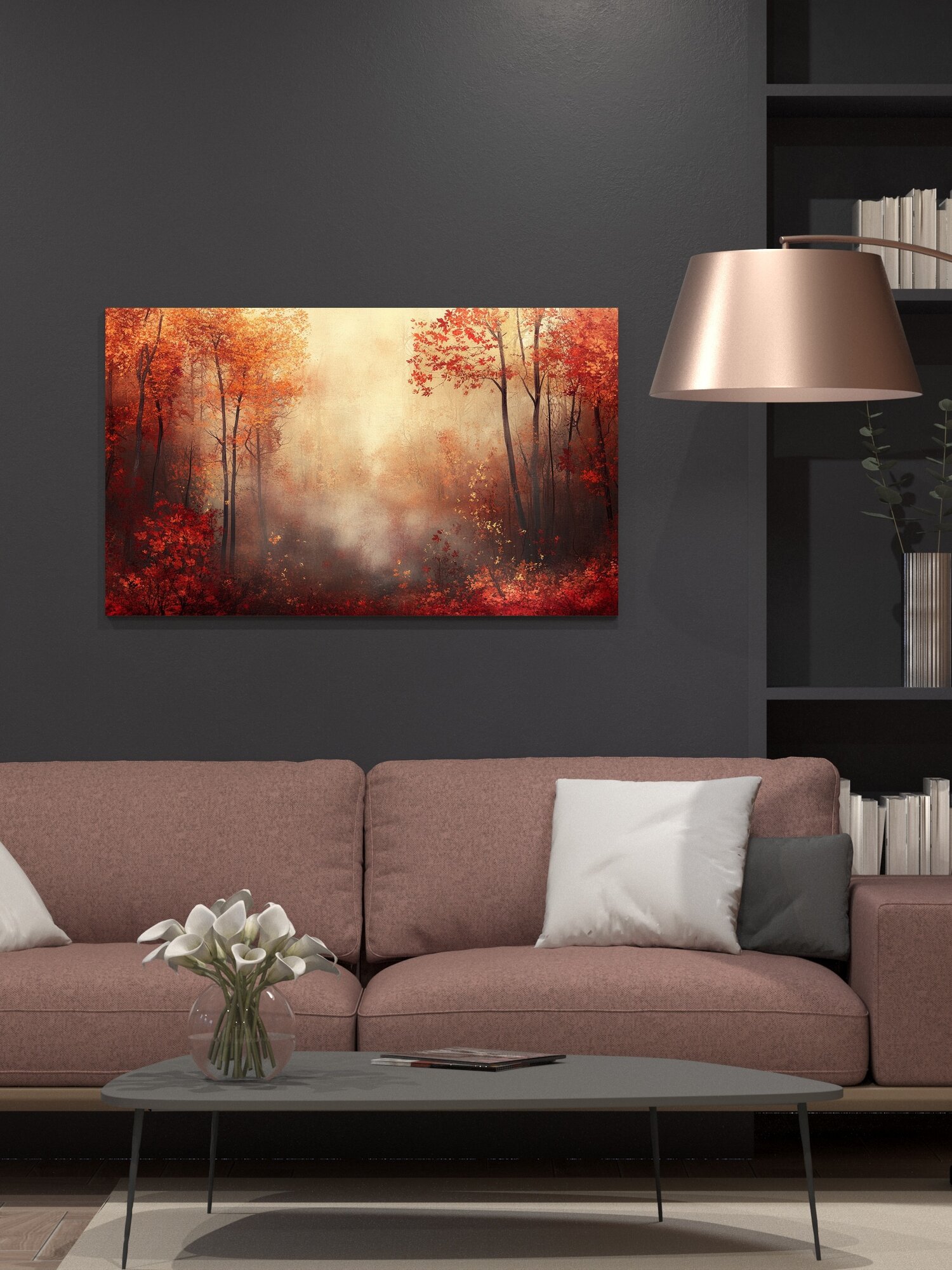 Купить Картина на холсте интерьерная 100х60 см, осенний лес, яркая листва, красный, оранжевый, золотой, туман, магия природы