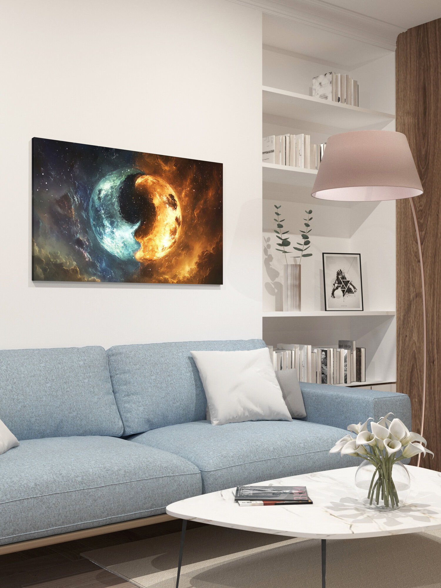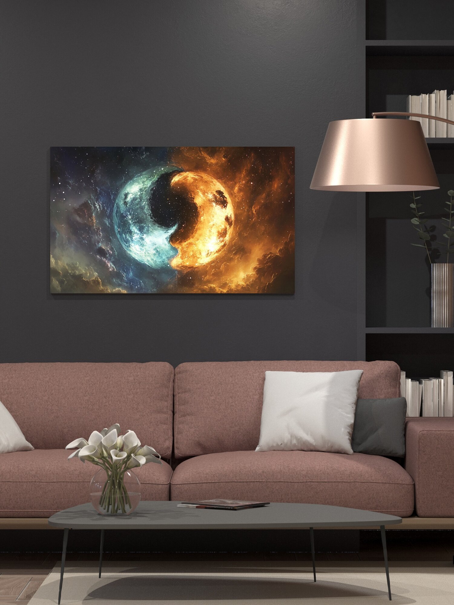 Картина на холсте интерьерная 100х60 см, Космический пейзаж, галактики, небесные тела, инь и Ян, цветовая палитра интересное: