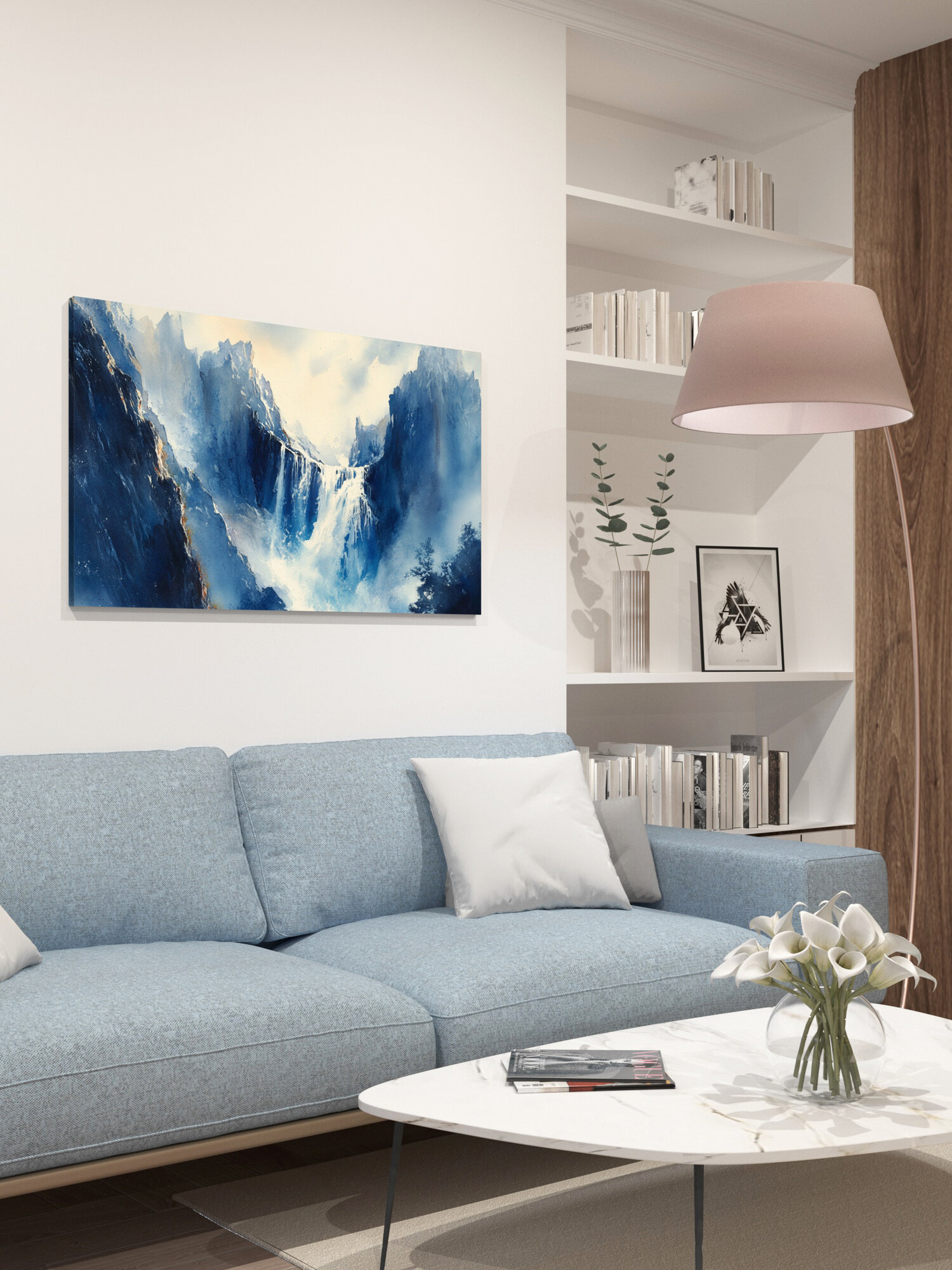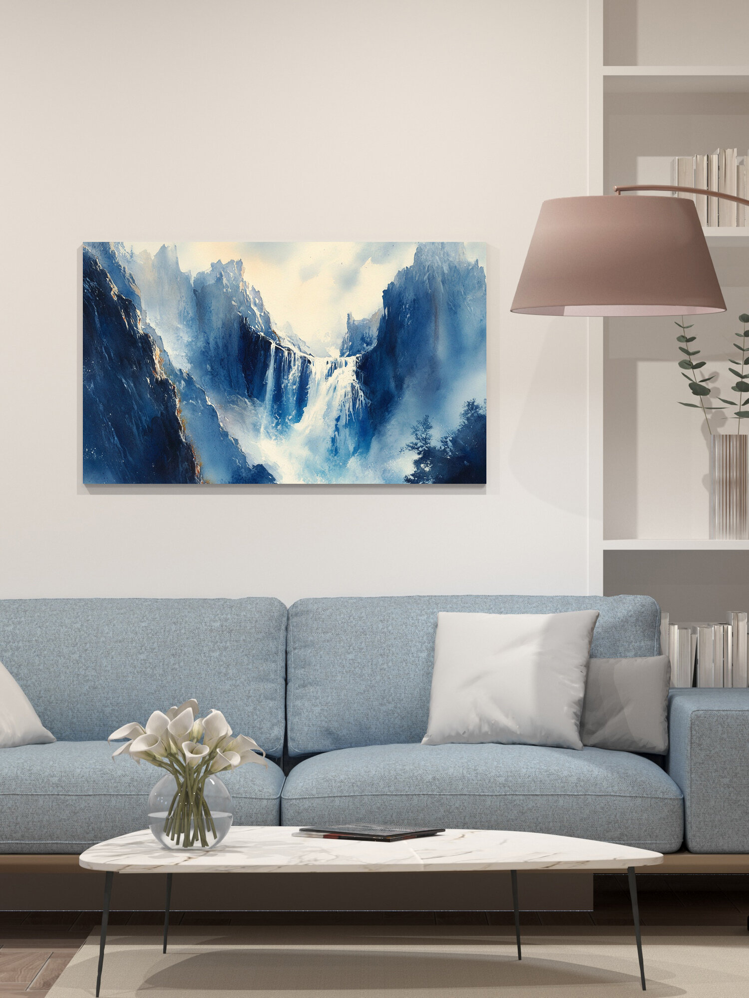 Картина на холсте интерьерная 100х60 см, Водопад, горные утесы, акварельная иллюстрация, скалистый фон, каскадный интересное: