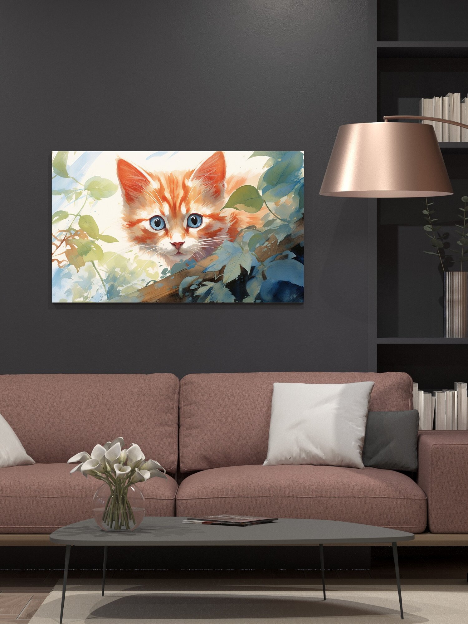 Купить Картина на холсте интерьерная 100х60 см, акварельная иллюстрация, озорная кошка, шерсть ярких красных отте