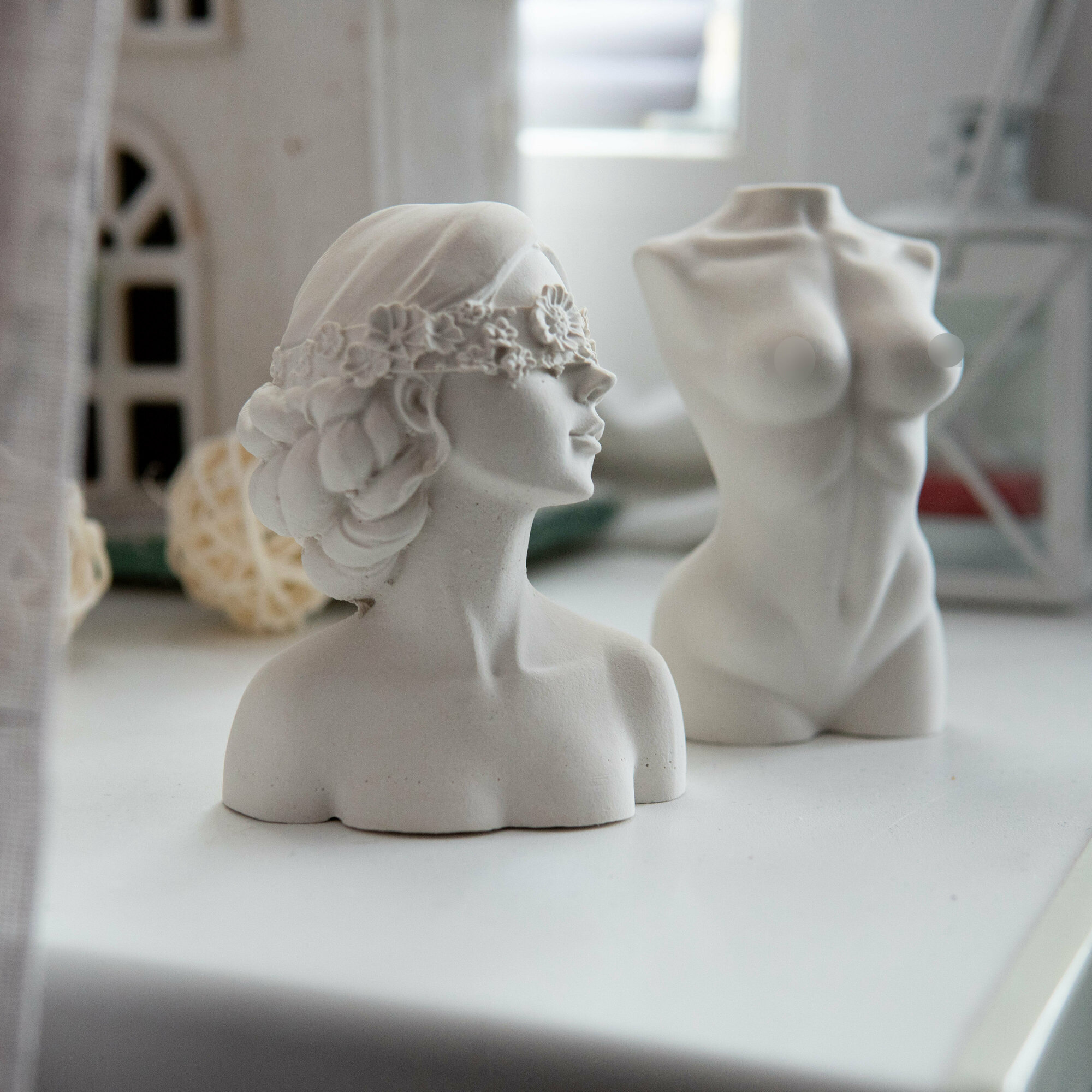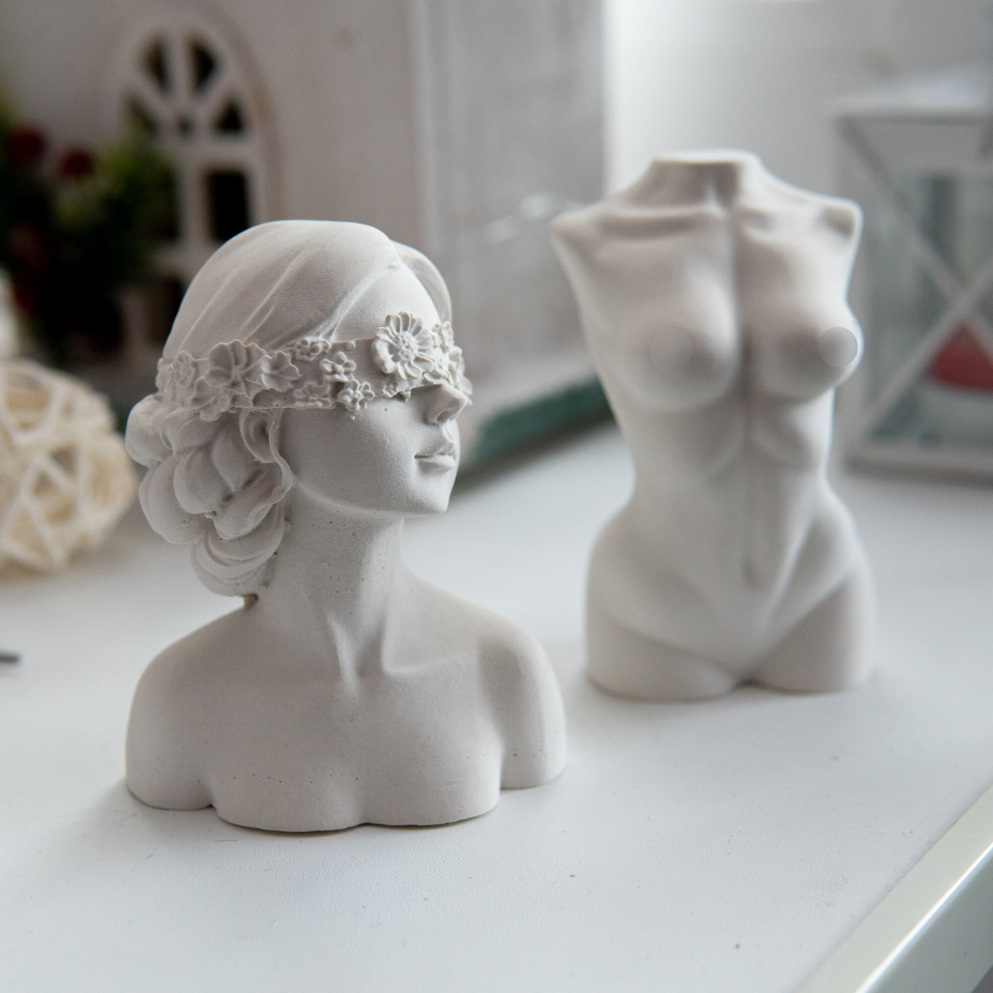 Купить Набор статуэток из гипса. Девушка с цветком на глазах и обнаженный торс статуэтки для интерьера