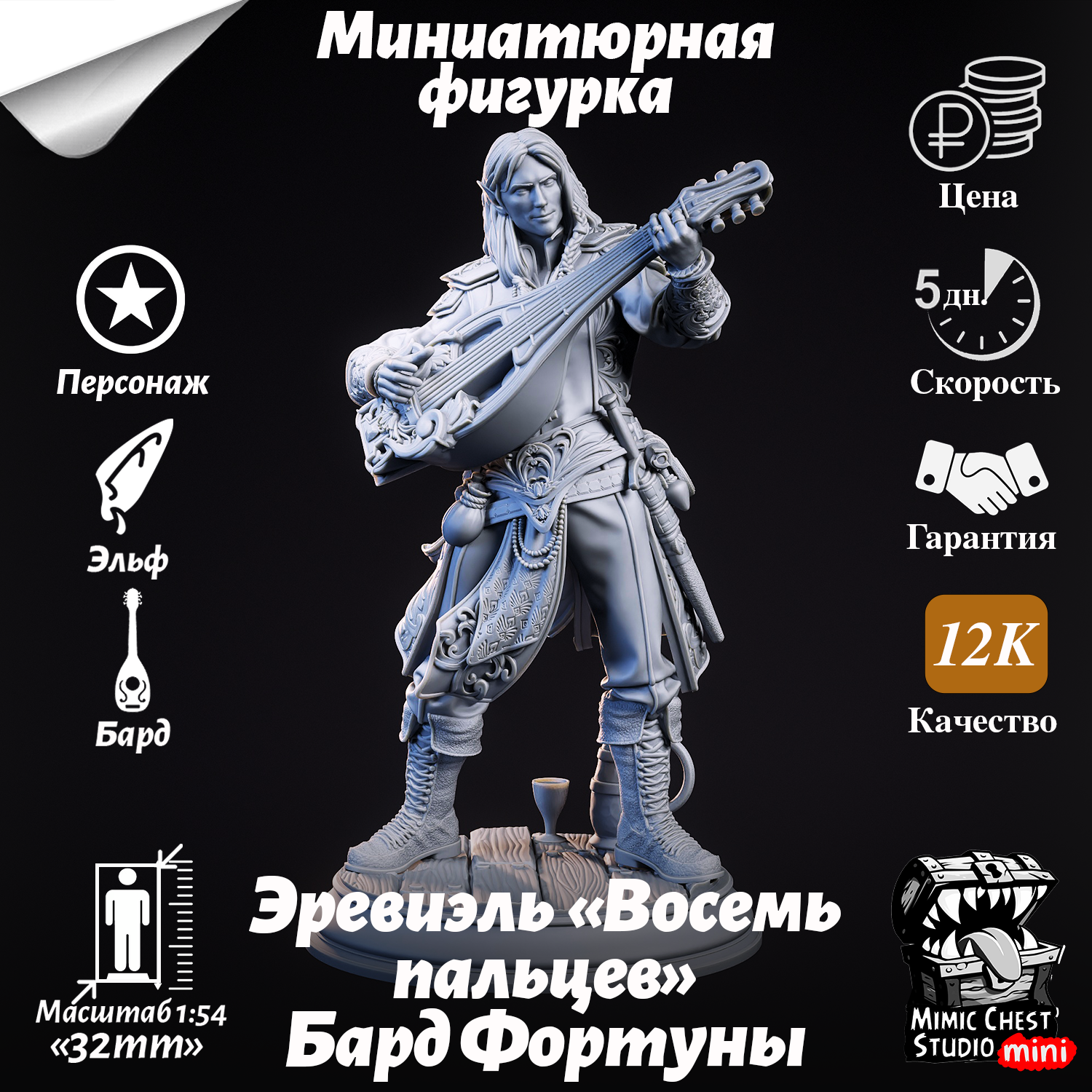 Миниатюрная фигурка эльф Эревиэль «Восемь пальцев» — Бард Фортуны (Неудачи) (Ereviel “Eight Toes” - Bard of (mis)Fortune) для игр DnD под покраску, 32mm интересное:
