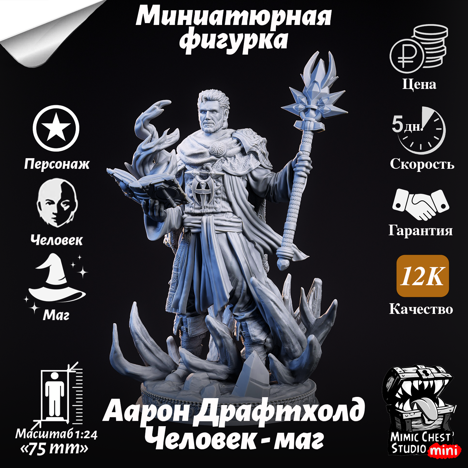 Миниатюрная фигурка человек-маг Аарон Драфтхолд (Aaron Drafthold) для игр DnD под покраску, 75mm интересное: