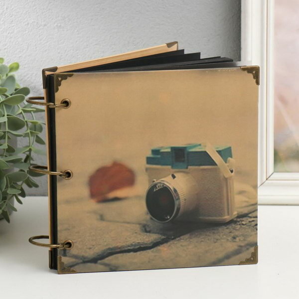Купить Фотоальбом на кольцах 30 листов "Фотоаппарат на плитке" чёрные листы 18х18 см