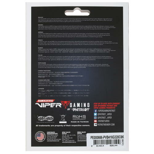 Patriot DDR4 16Gb (2x8Gb) 3200MHz pc-25600 Viper Blackout (pvb416g320c6k) Pvb416g320c6k .