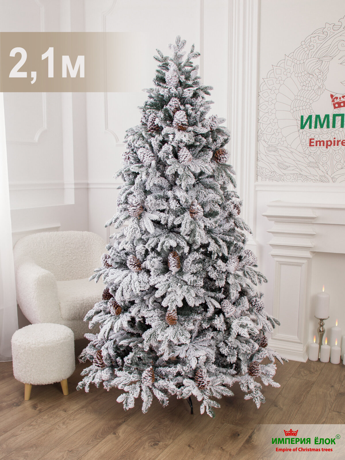 Купить Елка искусственная заснеженная с шишками литая+ПВХ 210 см, ель для помещений, Империя Ёлок
