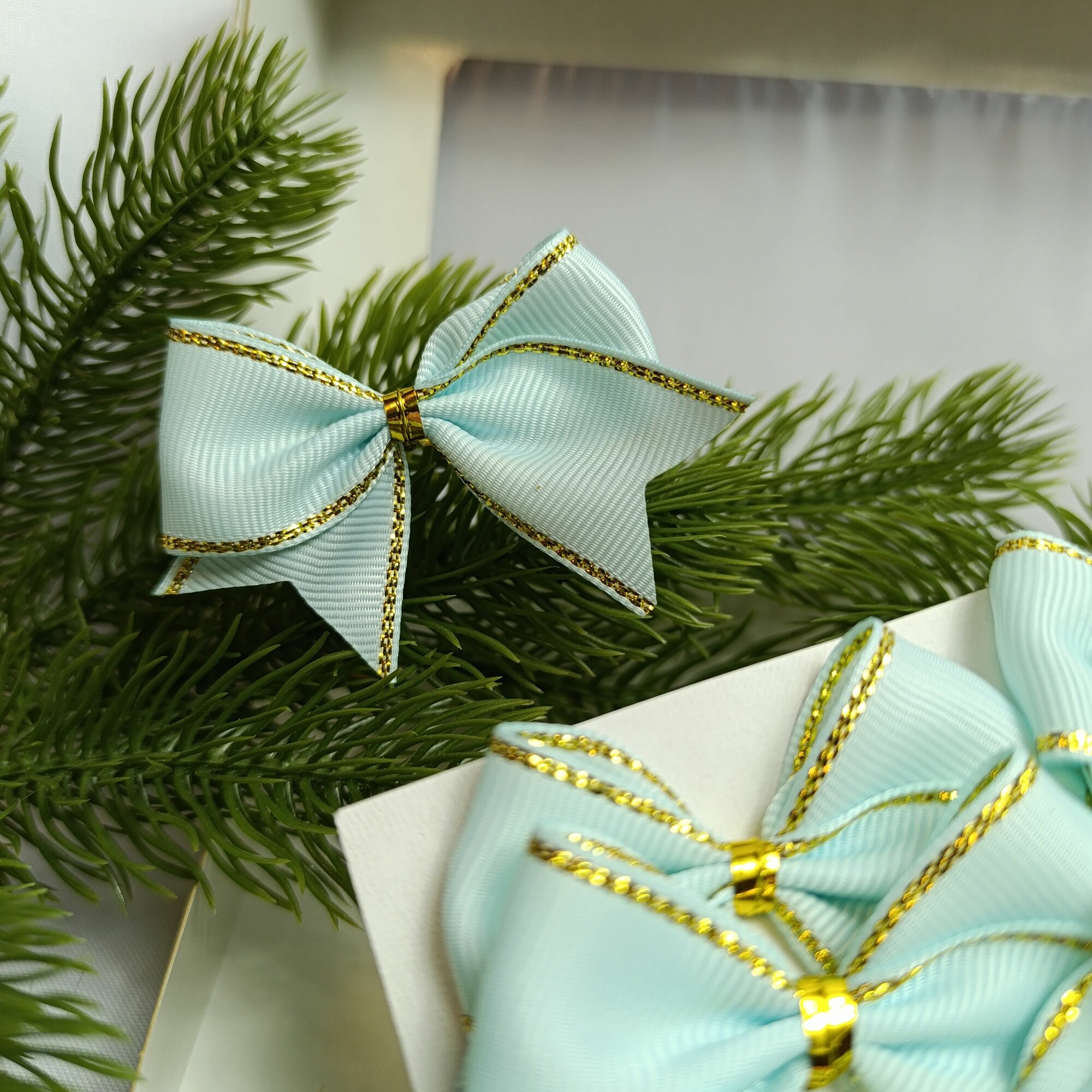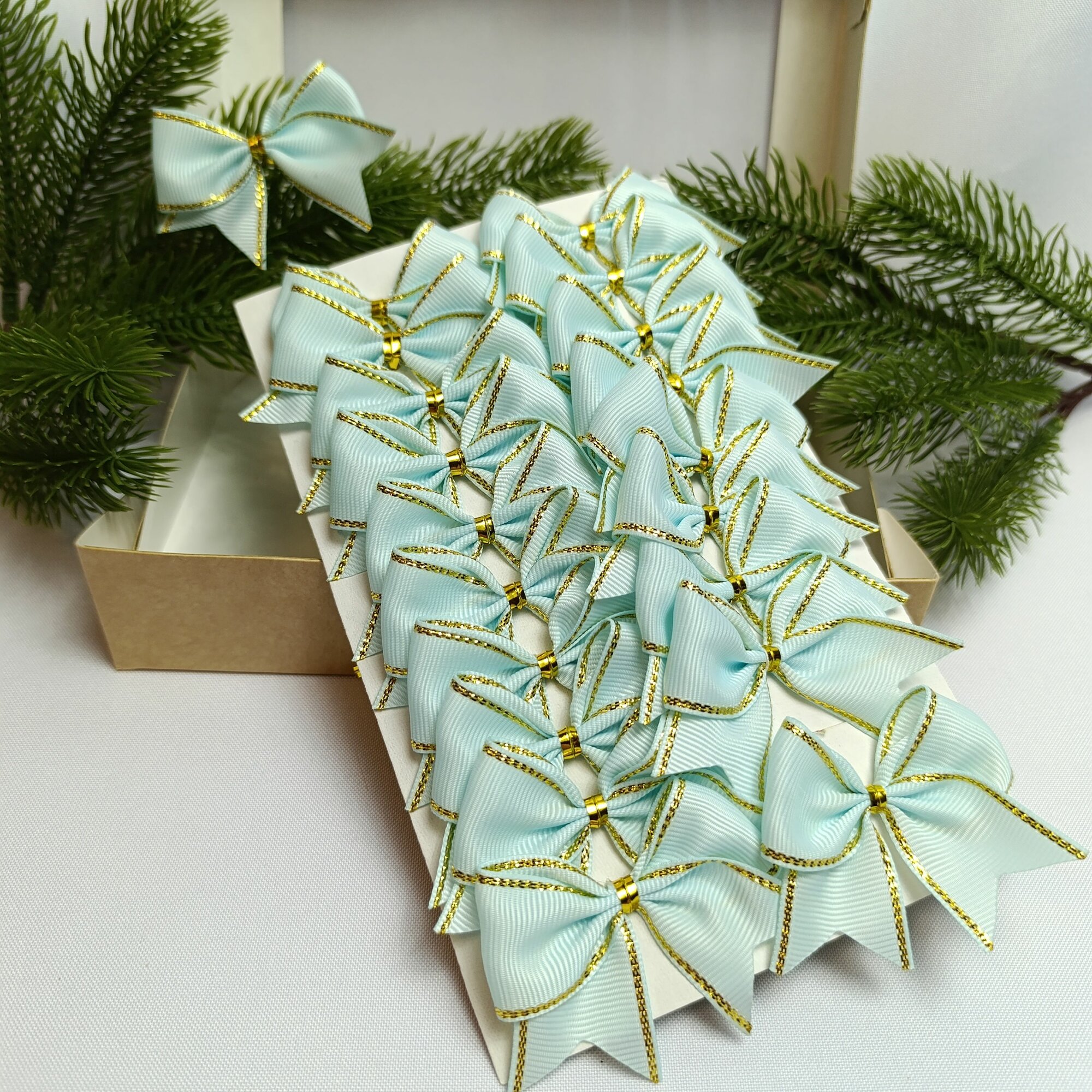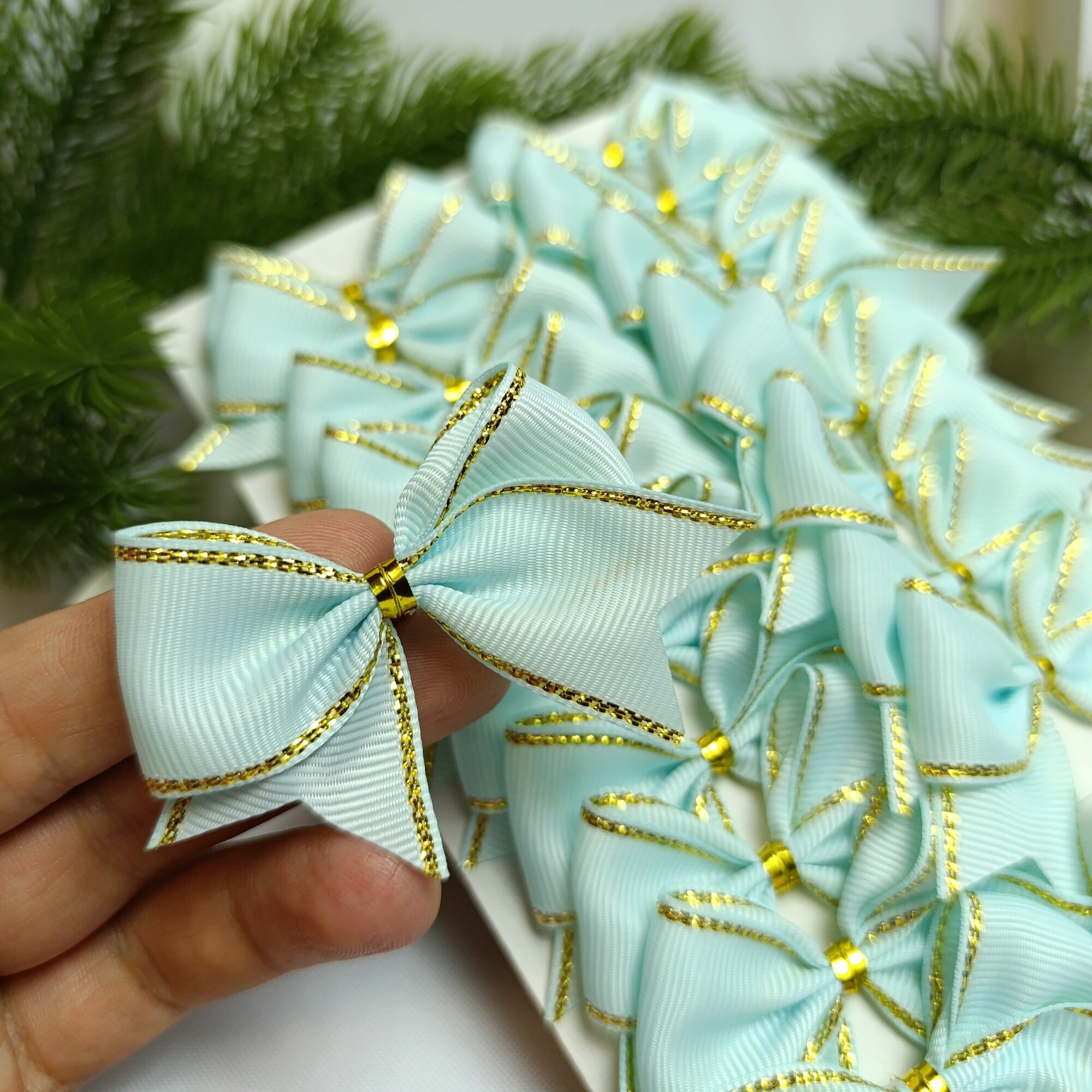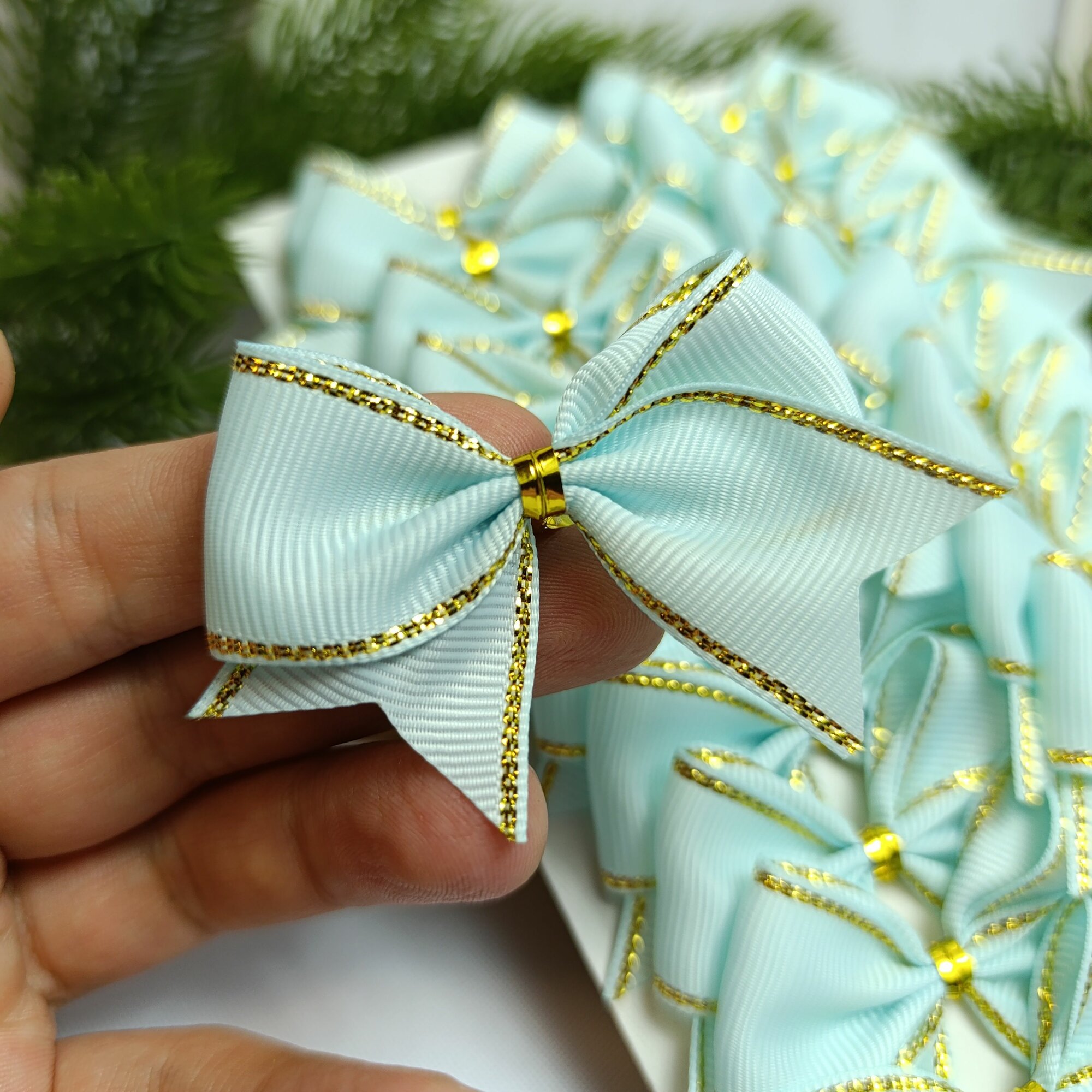 СохранитьБанты новогодние 20 шт, бирюзовый с золотым люрексом репсовые с люрексом, крепление твист интересное: