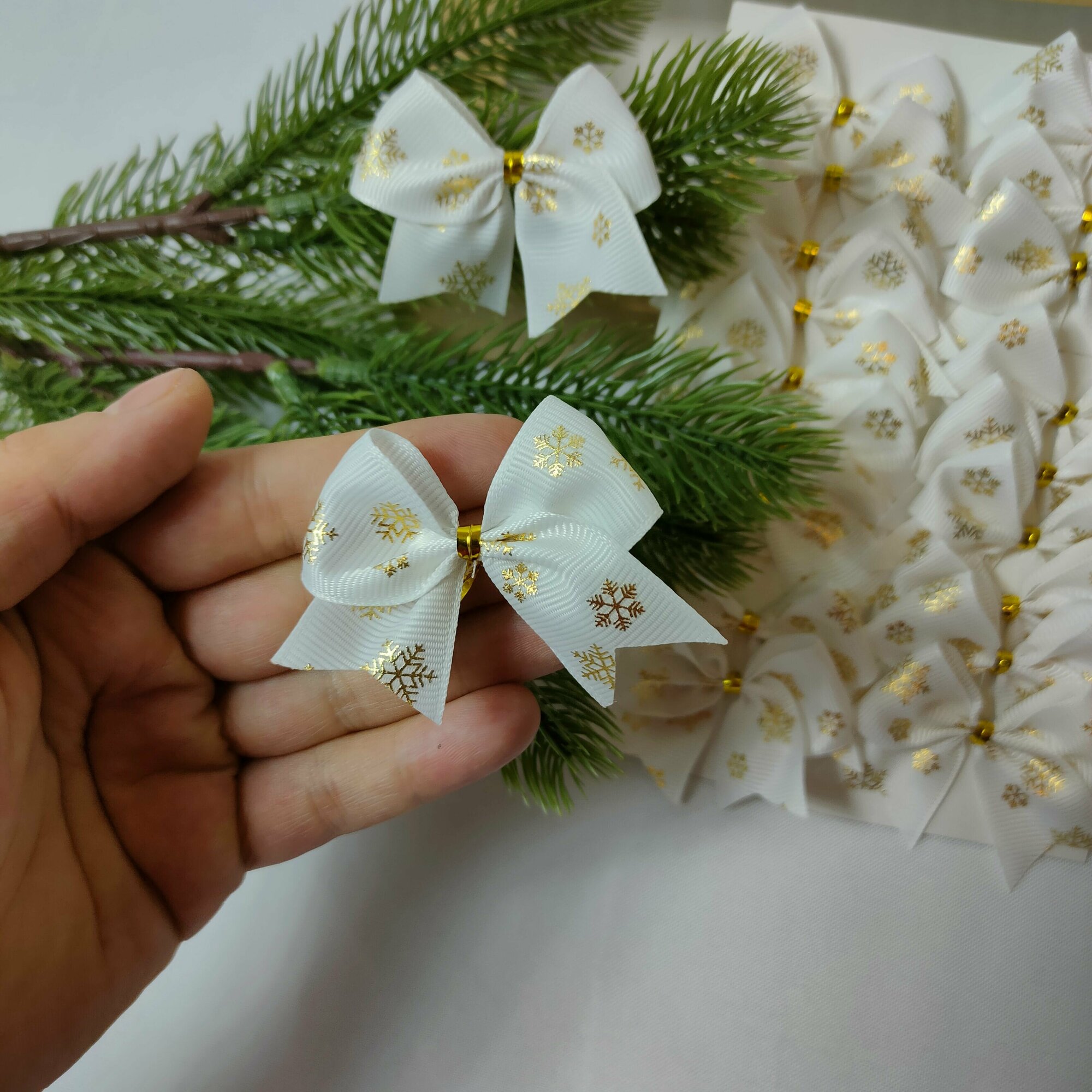 Бантики мини 5.5 см, новогодний декор 20 шт, репсовые, белые Снежинки, крепление твист