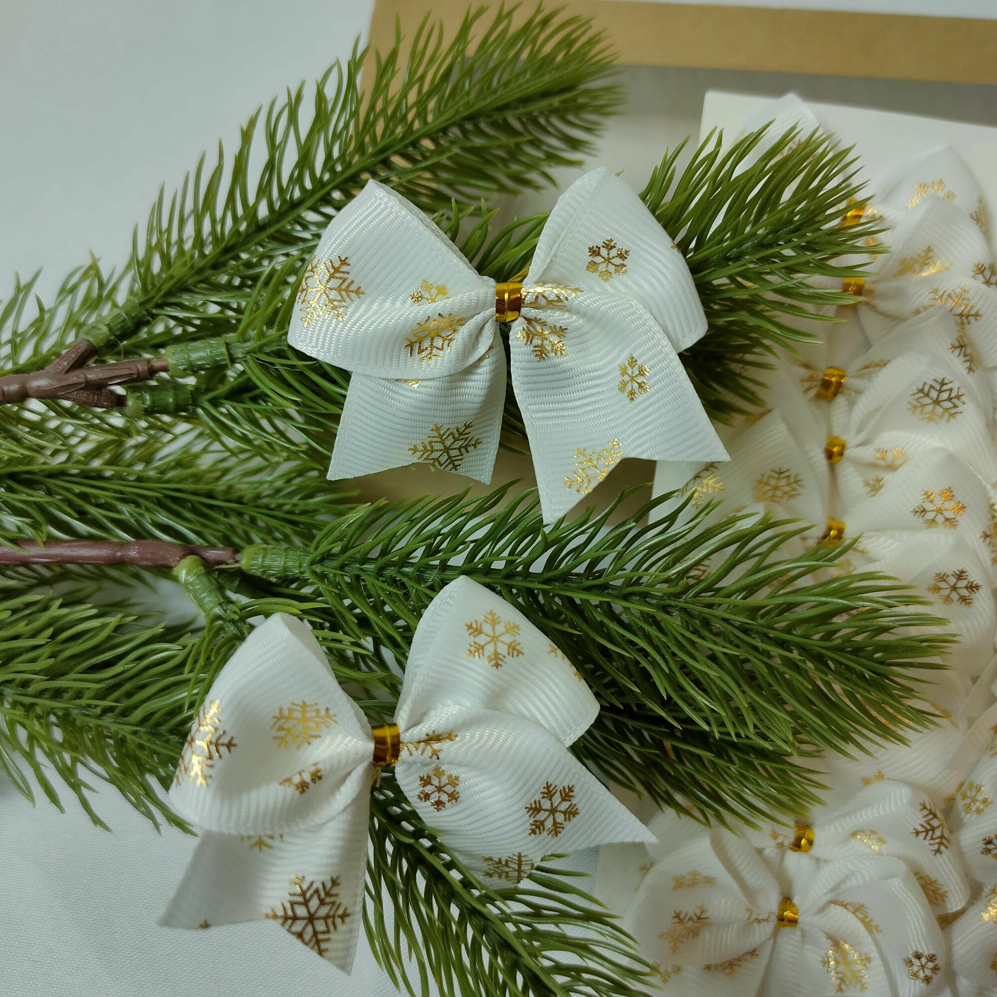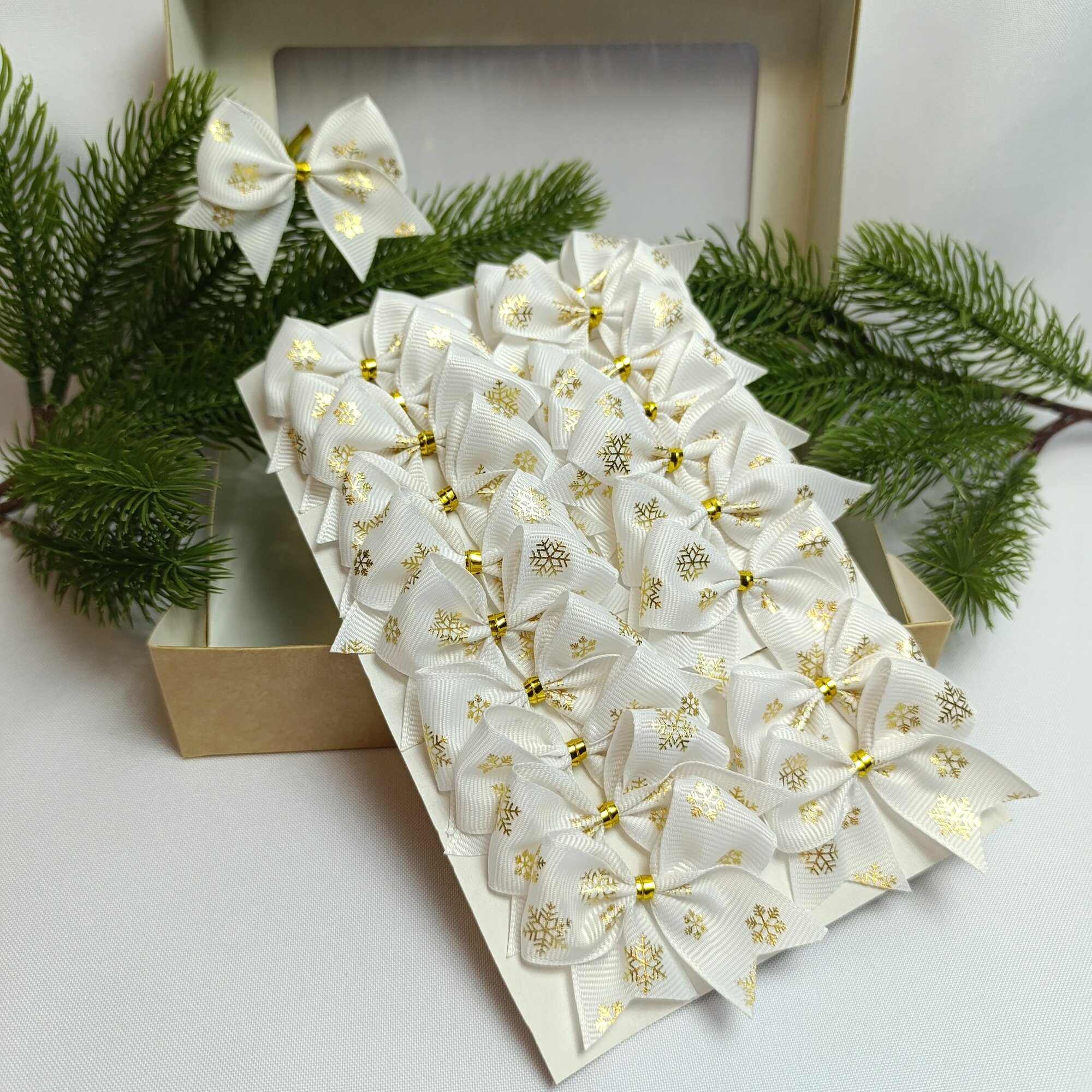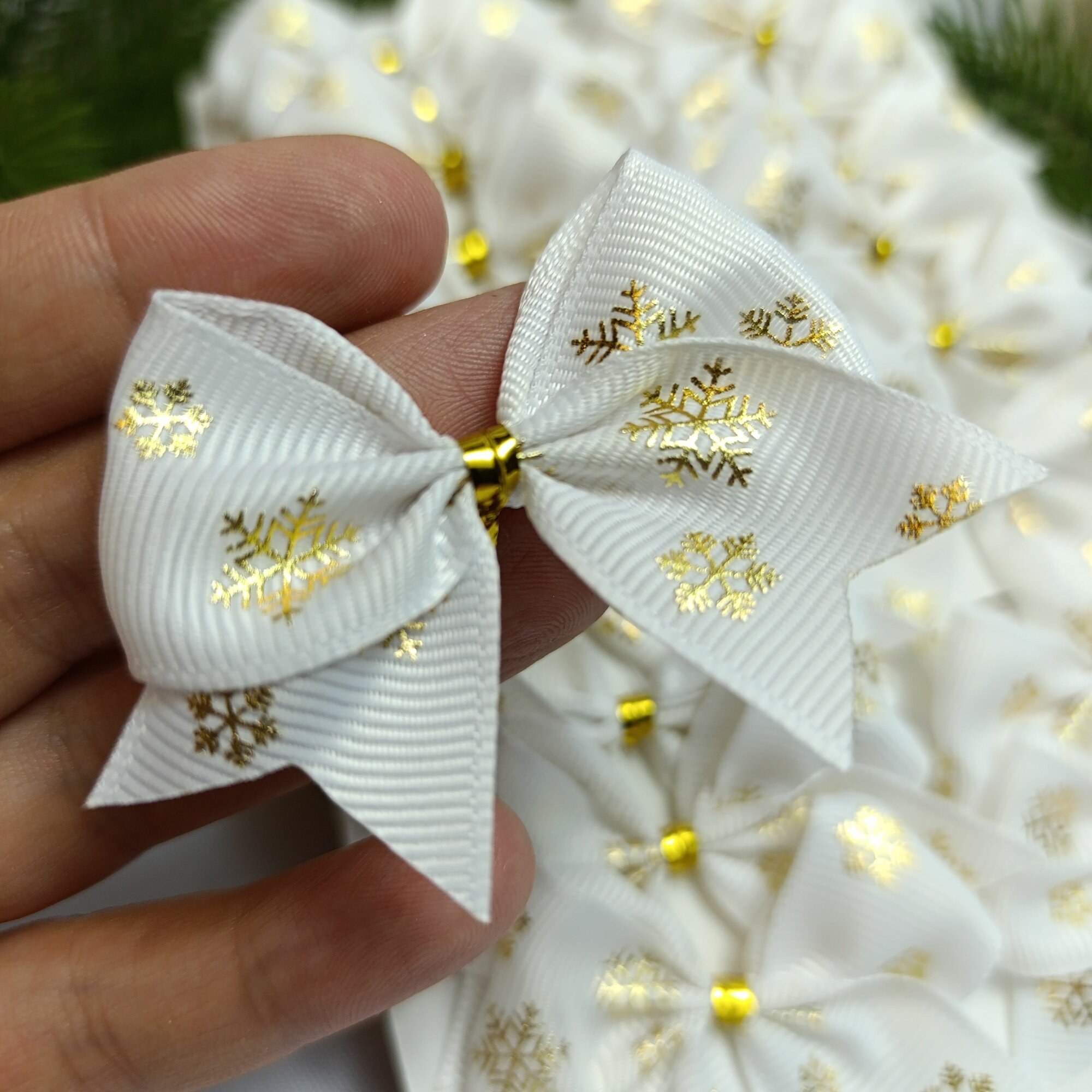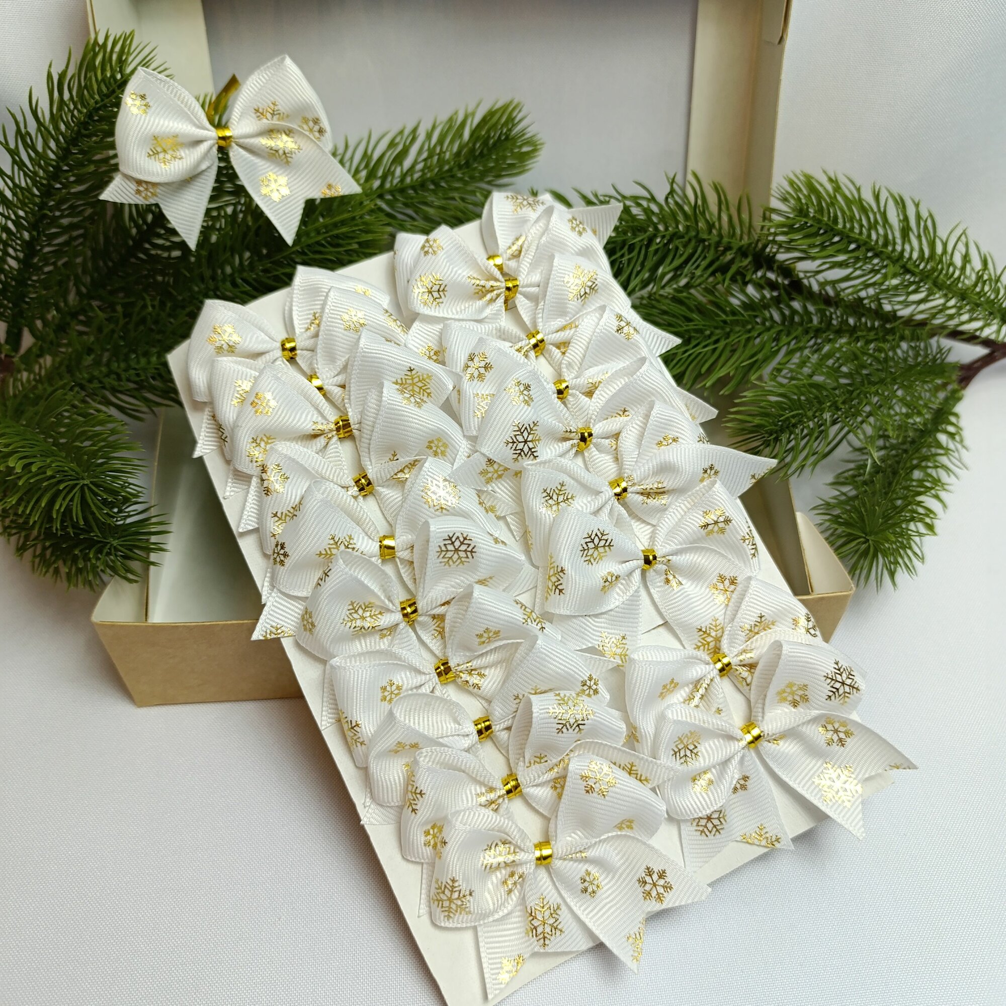 СохранитьБанты новогодние 20 шт, репсовые белый со снежинками золото, крепление твист интересное: