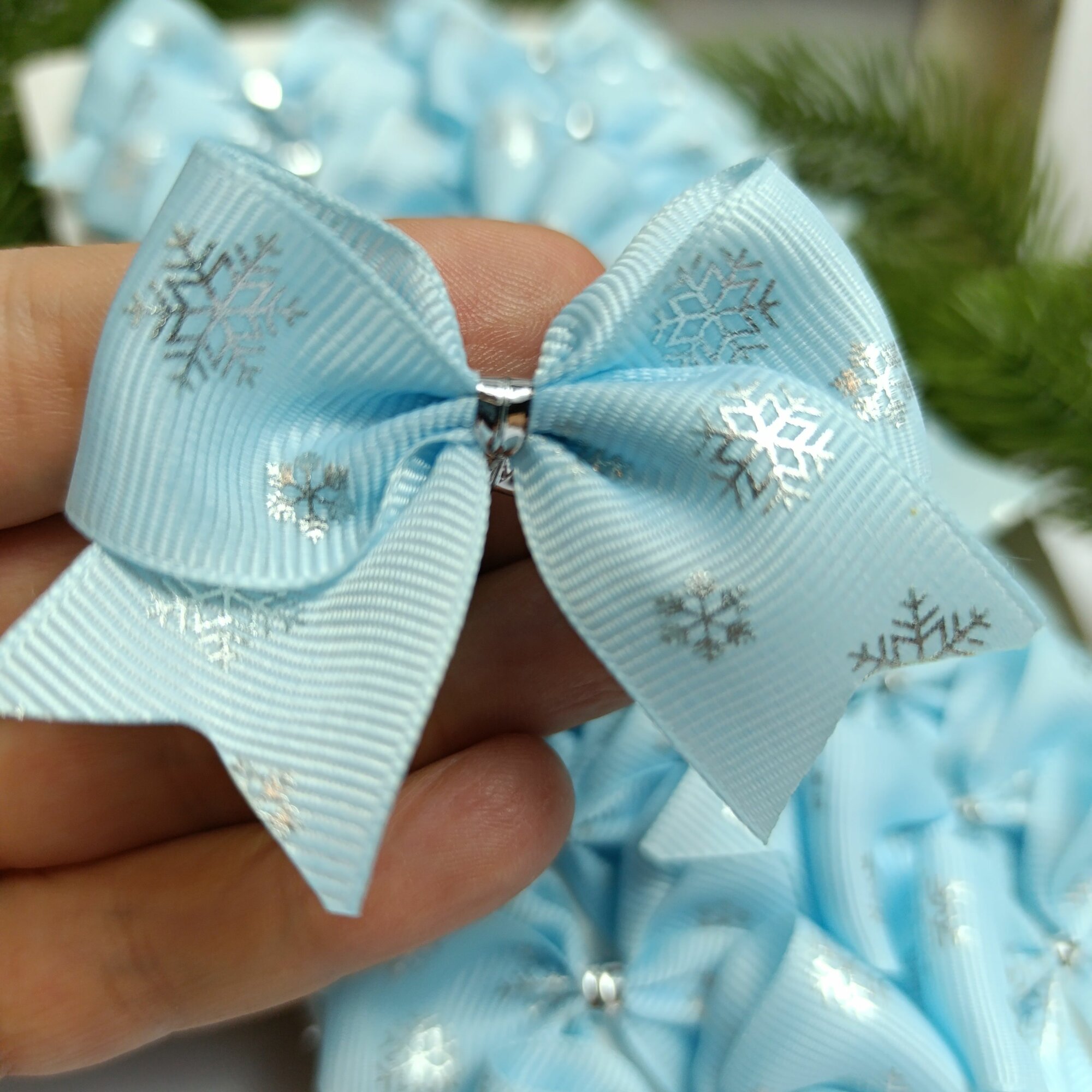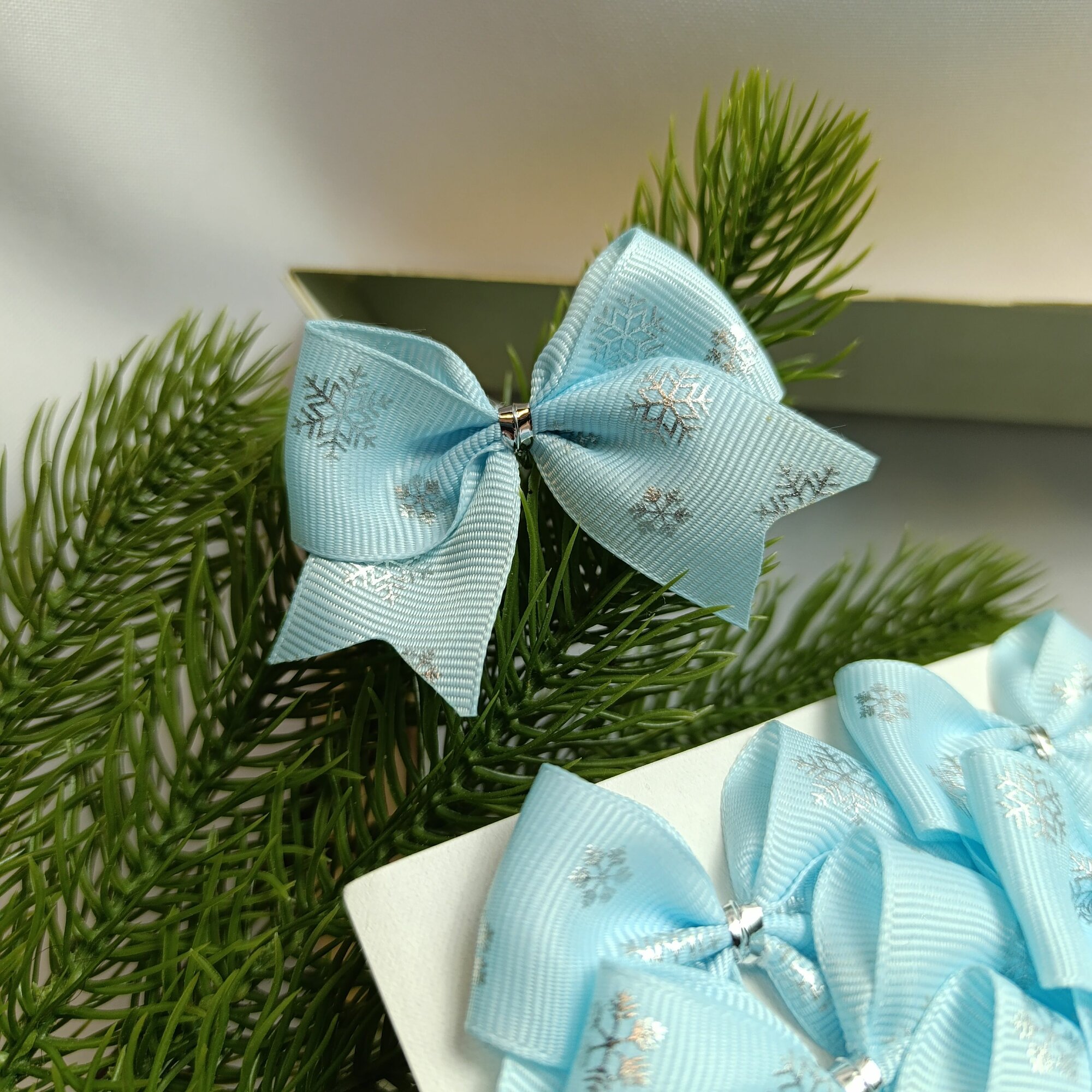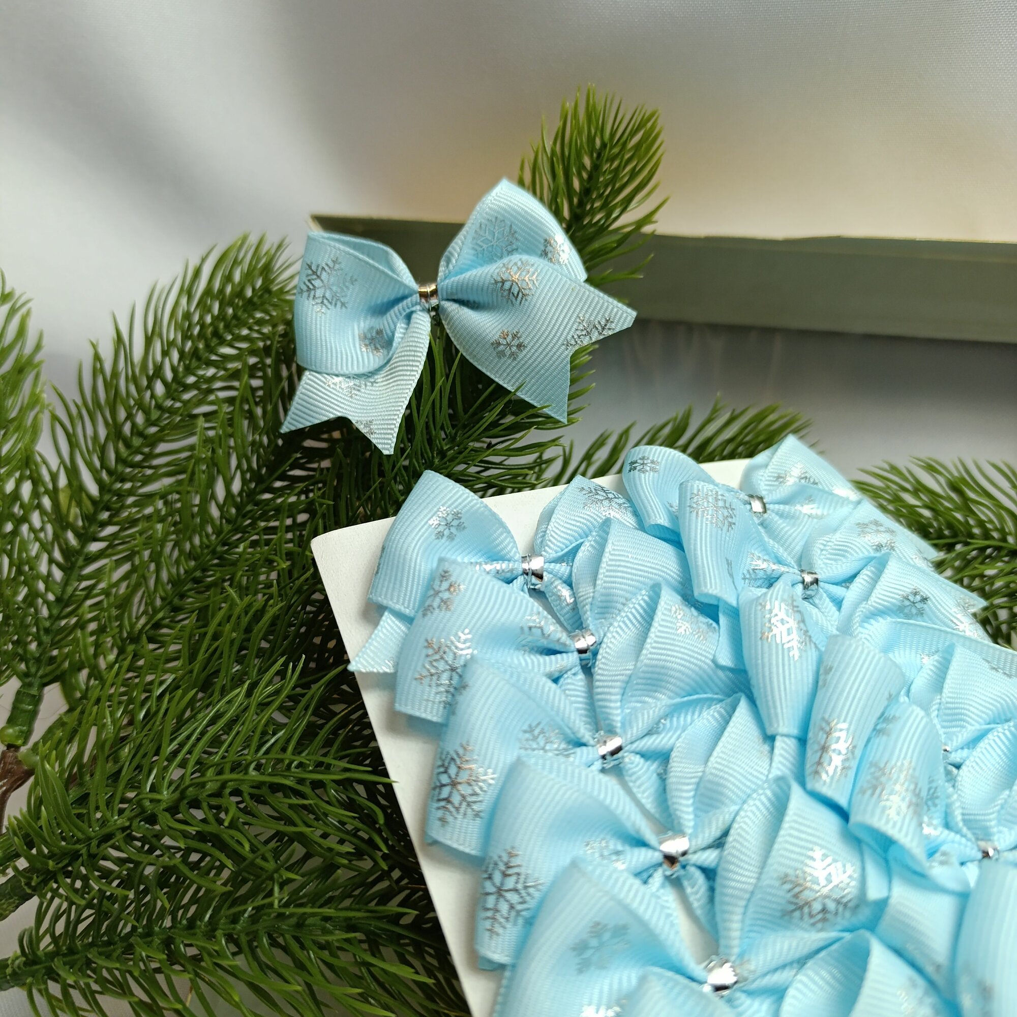 СохранитьБантики мини 5.5 см, новогодние 20 шт, репсовые, в голубом цвете с серебряными снежинками, крепление твист интересное: