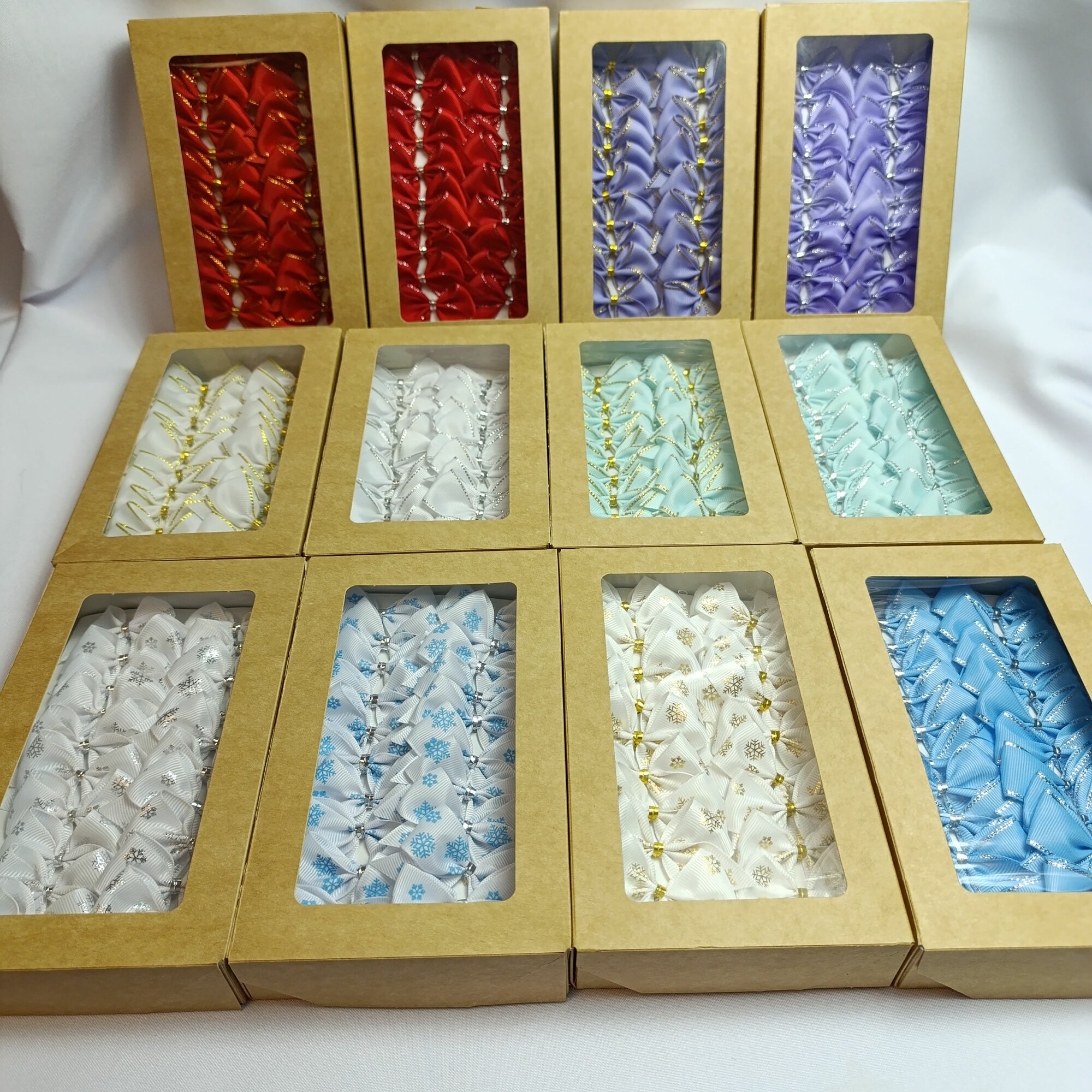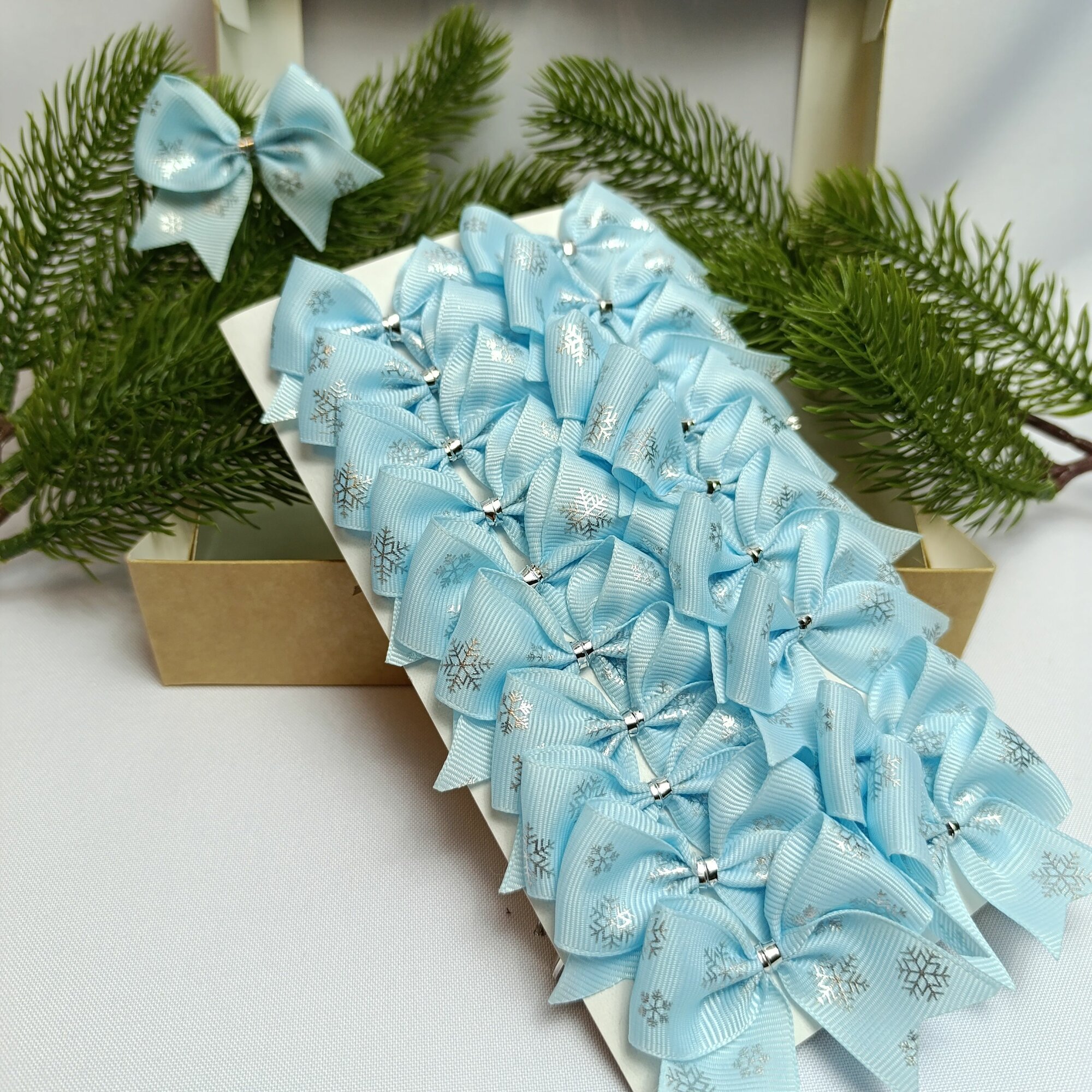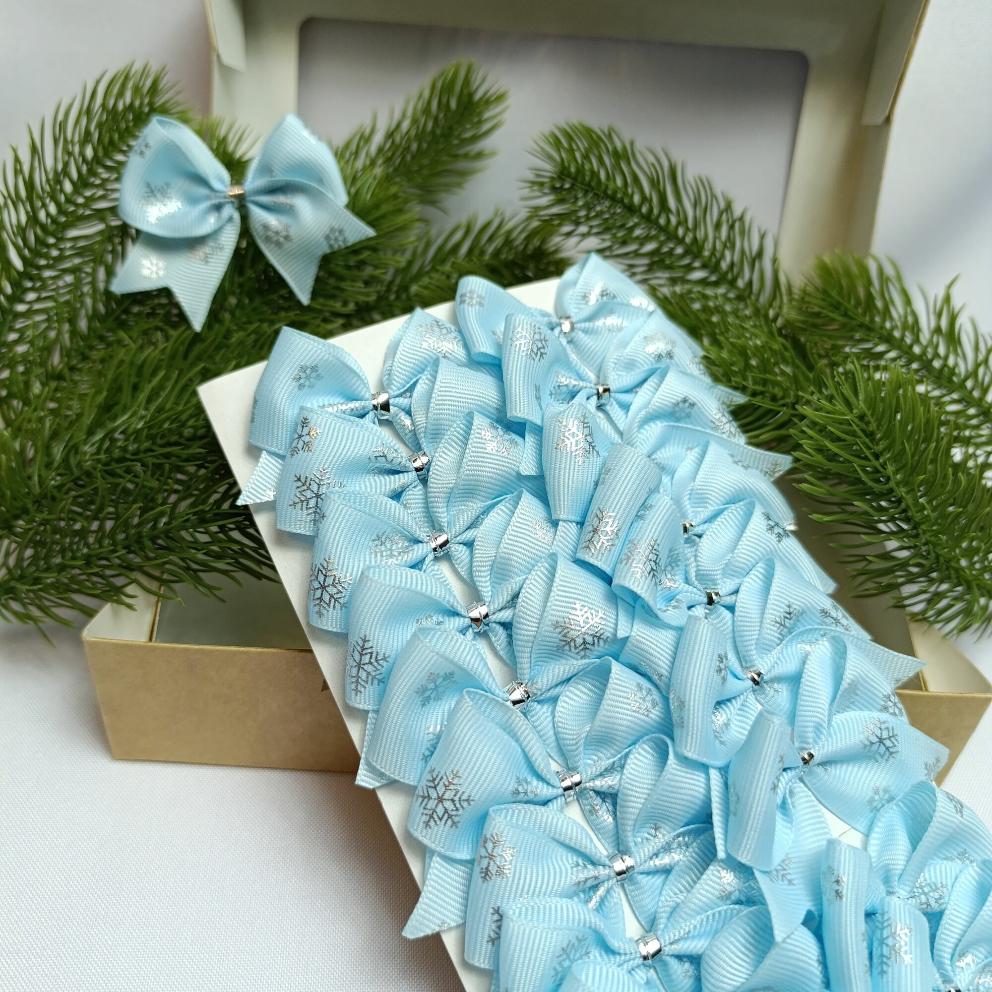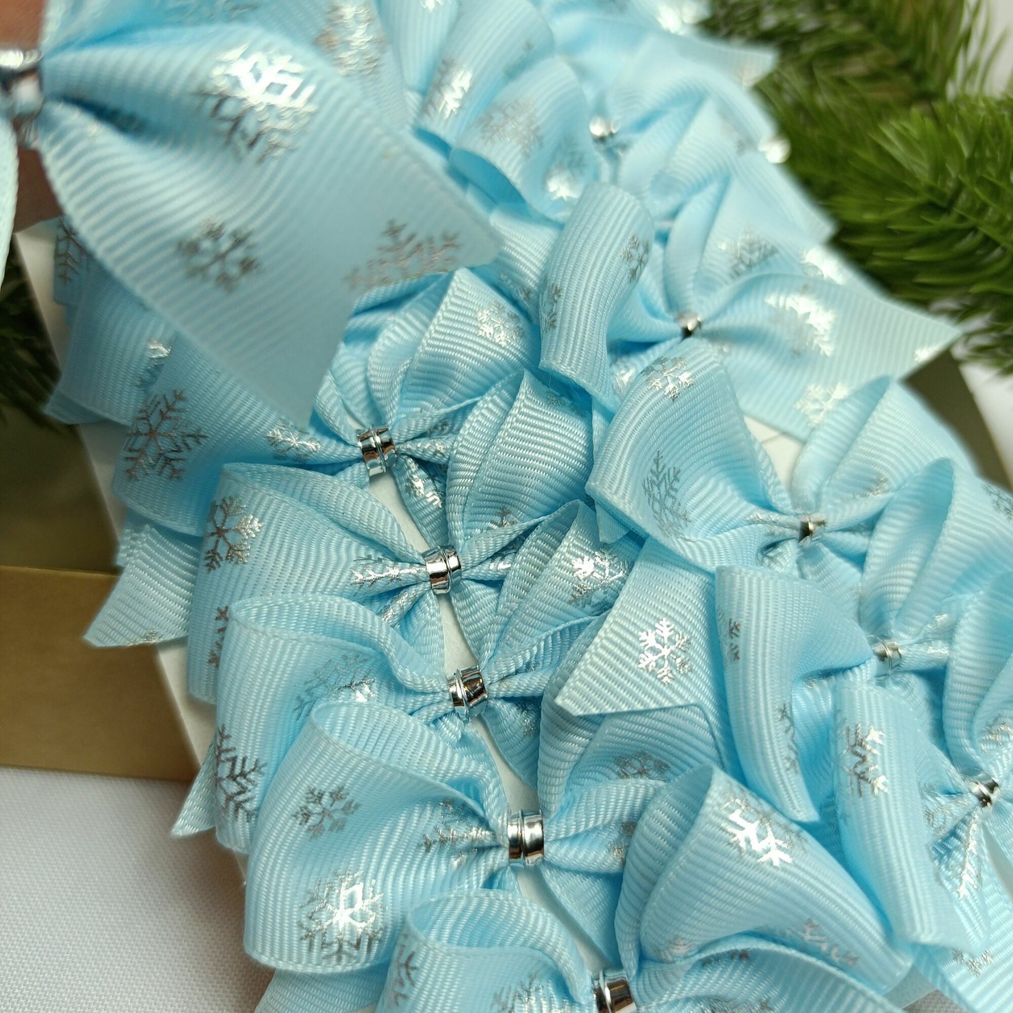 Банты новогодние 20 шт, репсовые белые с голубыми снежинками, крепление твист