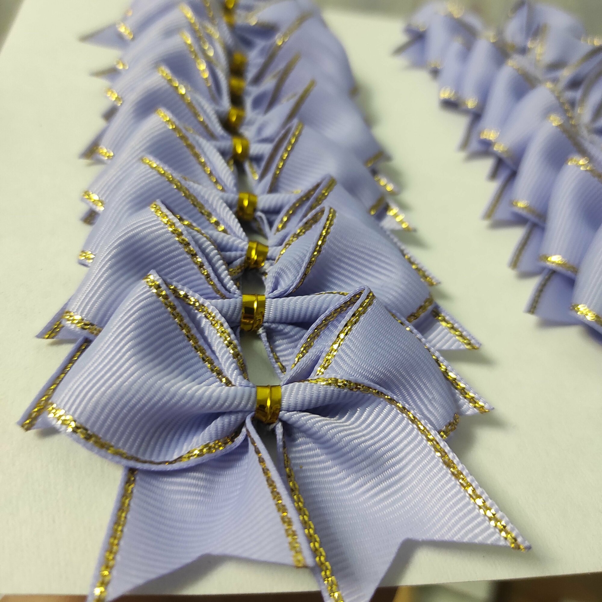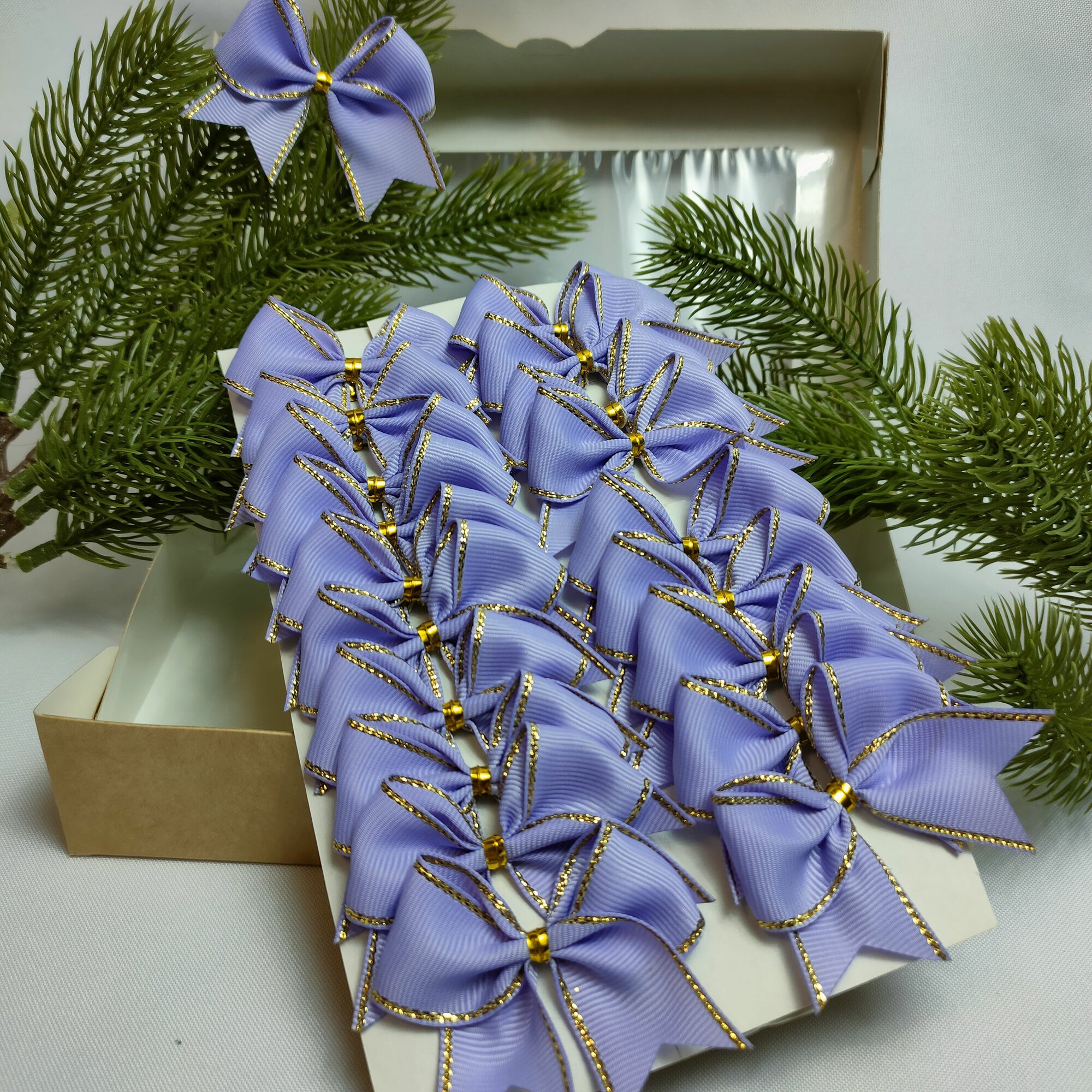 СохранитьБанты новогодние 20 шт, репсовые, в сиреневом цвете с золотым люрексом, крепление твист интересное: