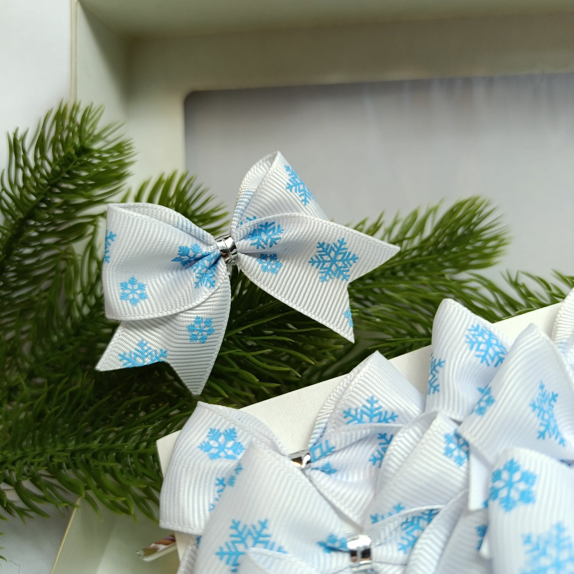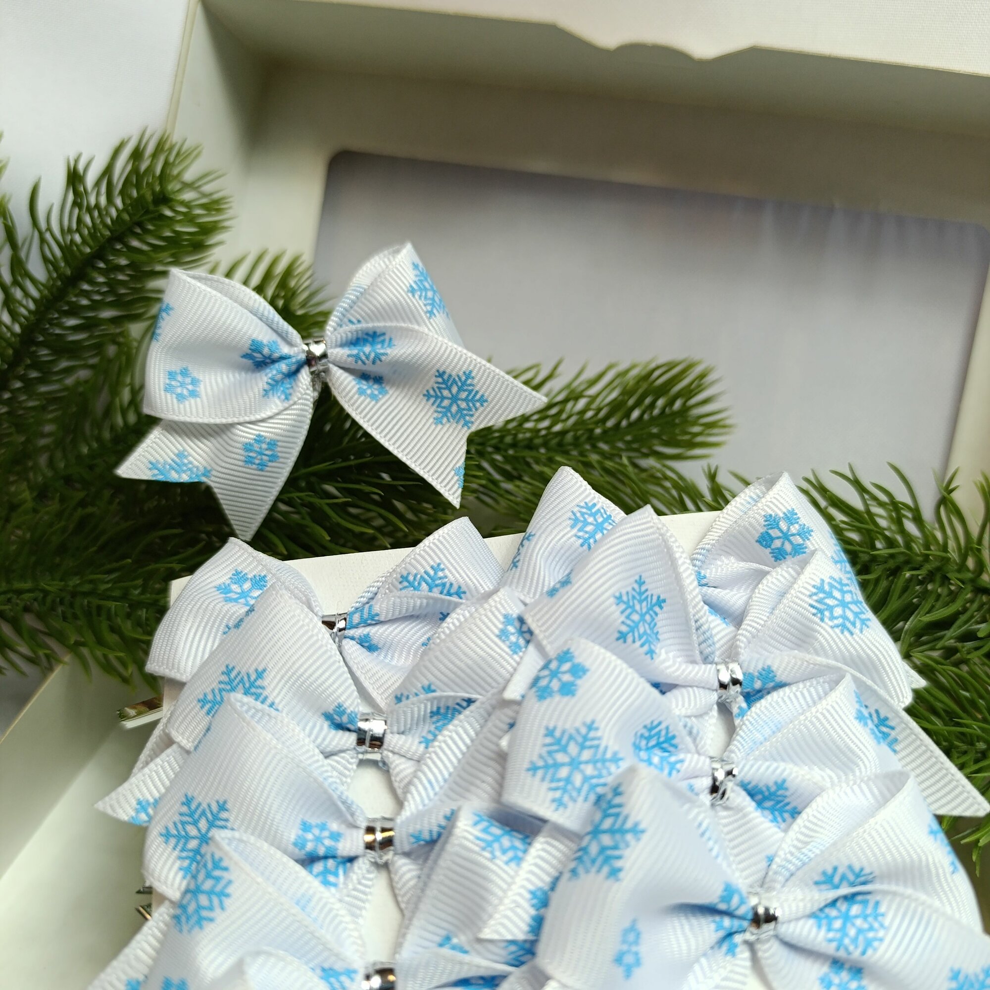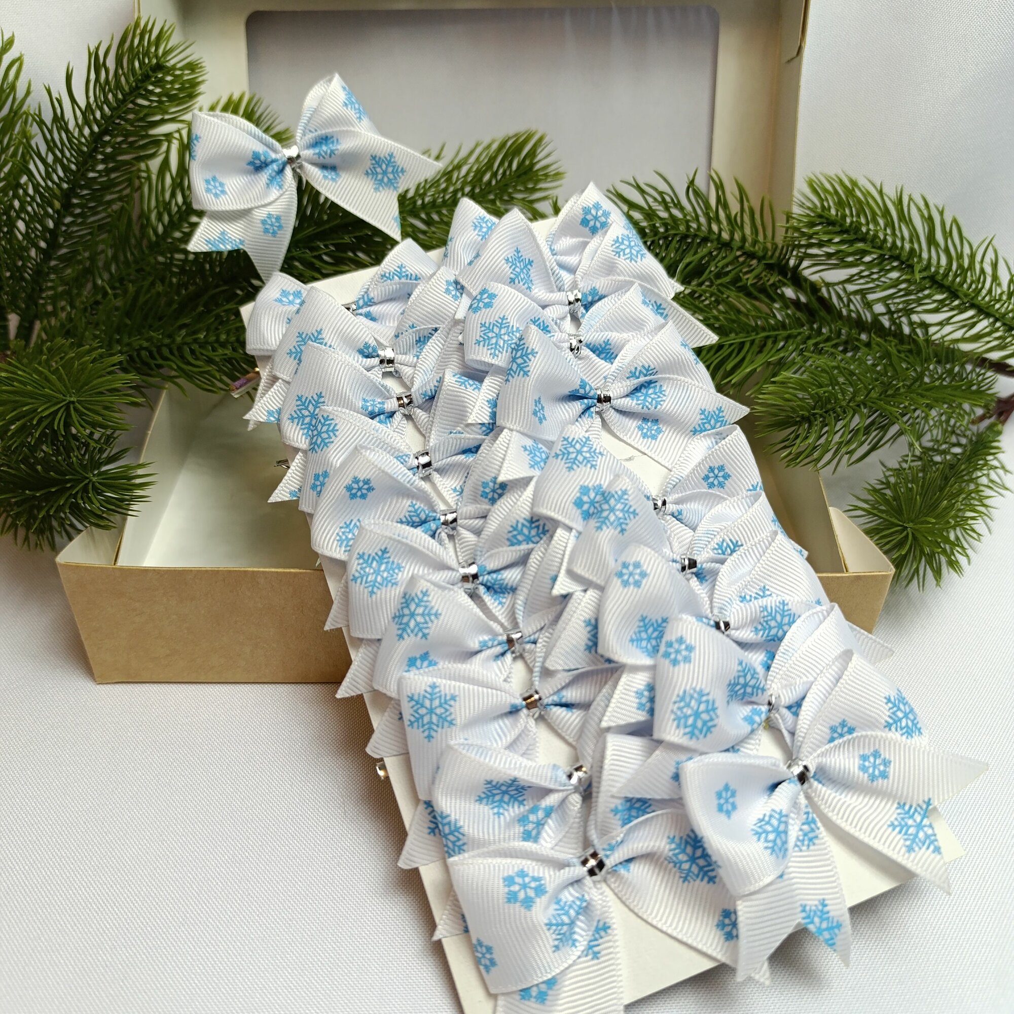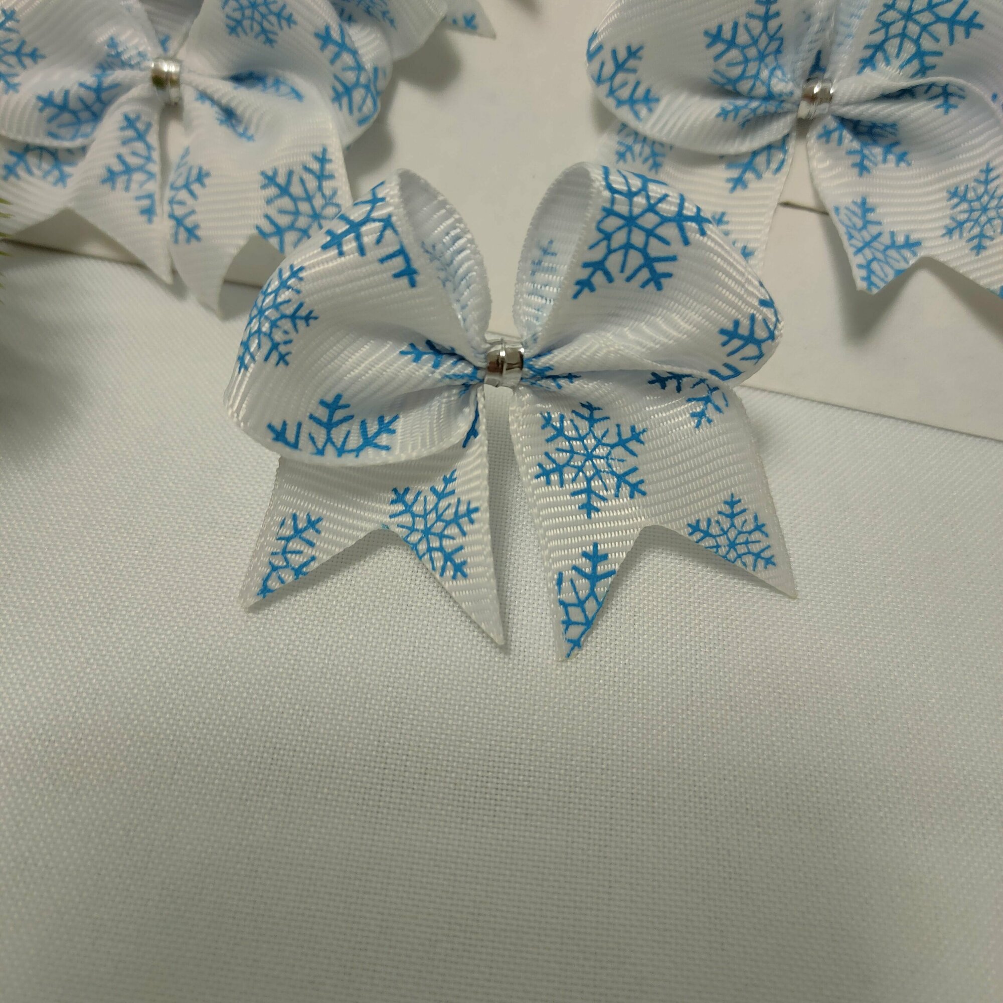 СохранитьБанты новогодние 20 шт, репсовые белые с голубыми снежинками, крепление твист интересное: