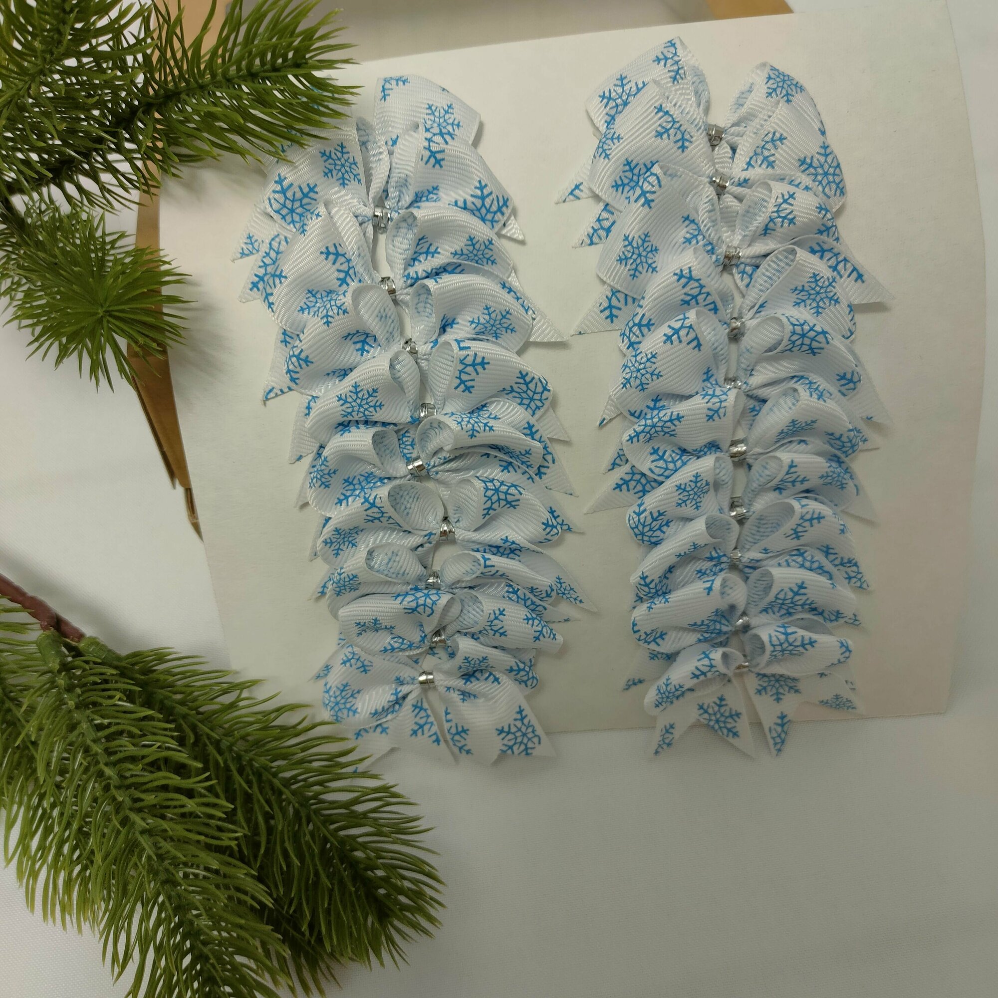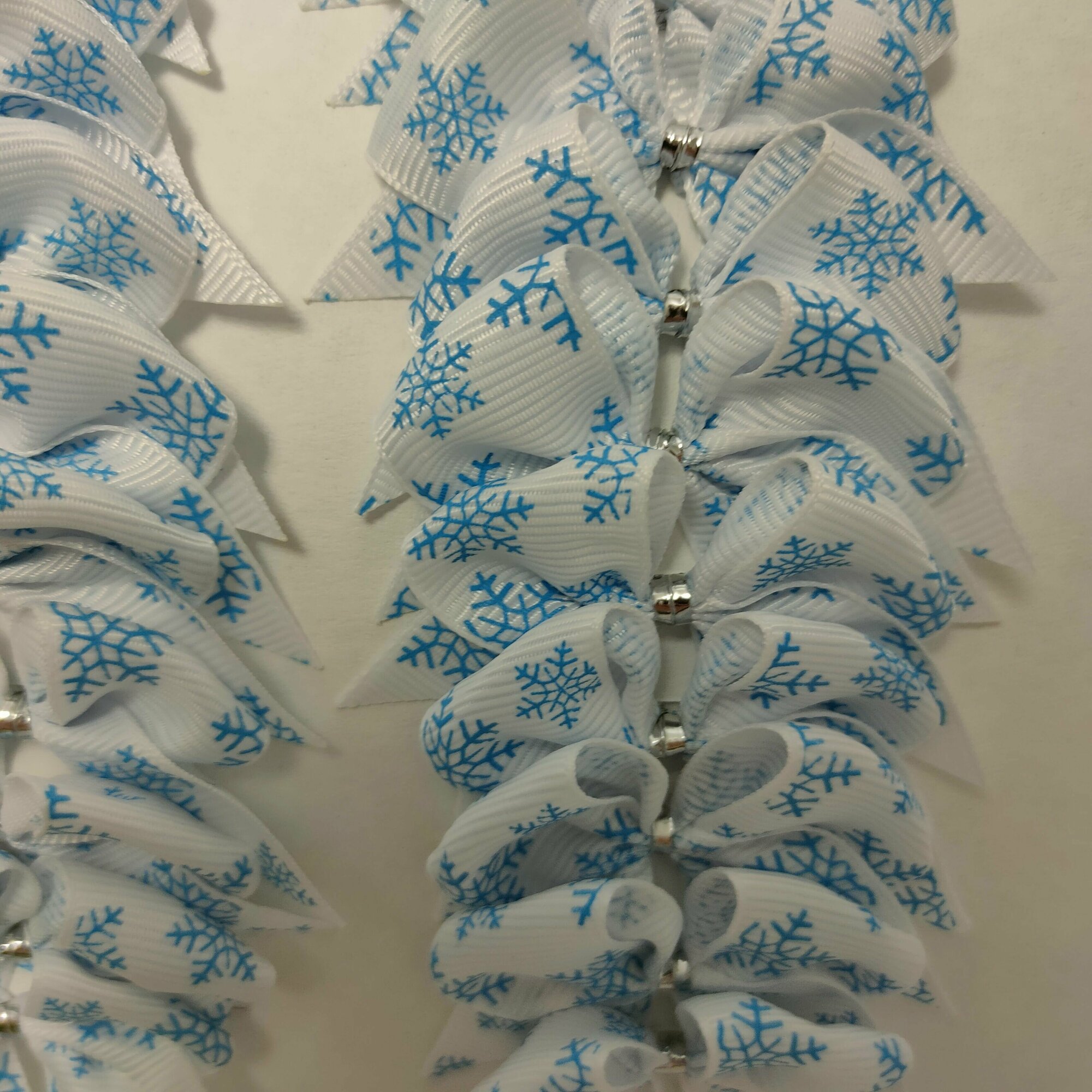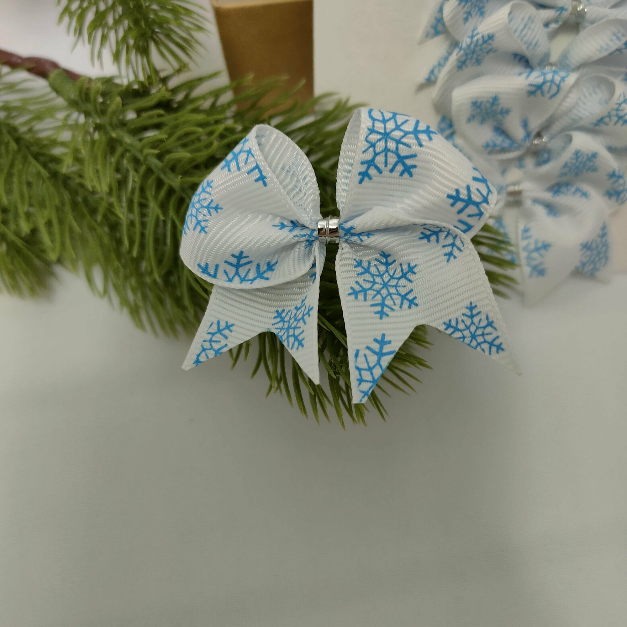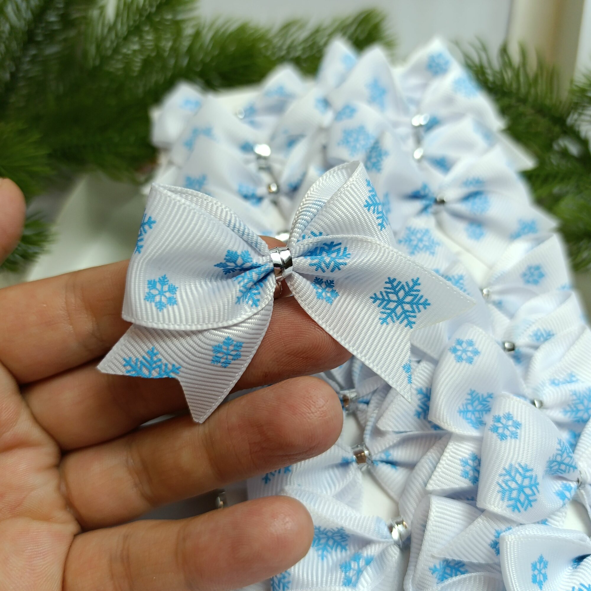 СохранитьБанты новогодние 20 шт, репсовые белые с голубыми снежинками, крепление твист интересное: