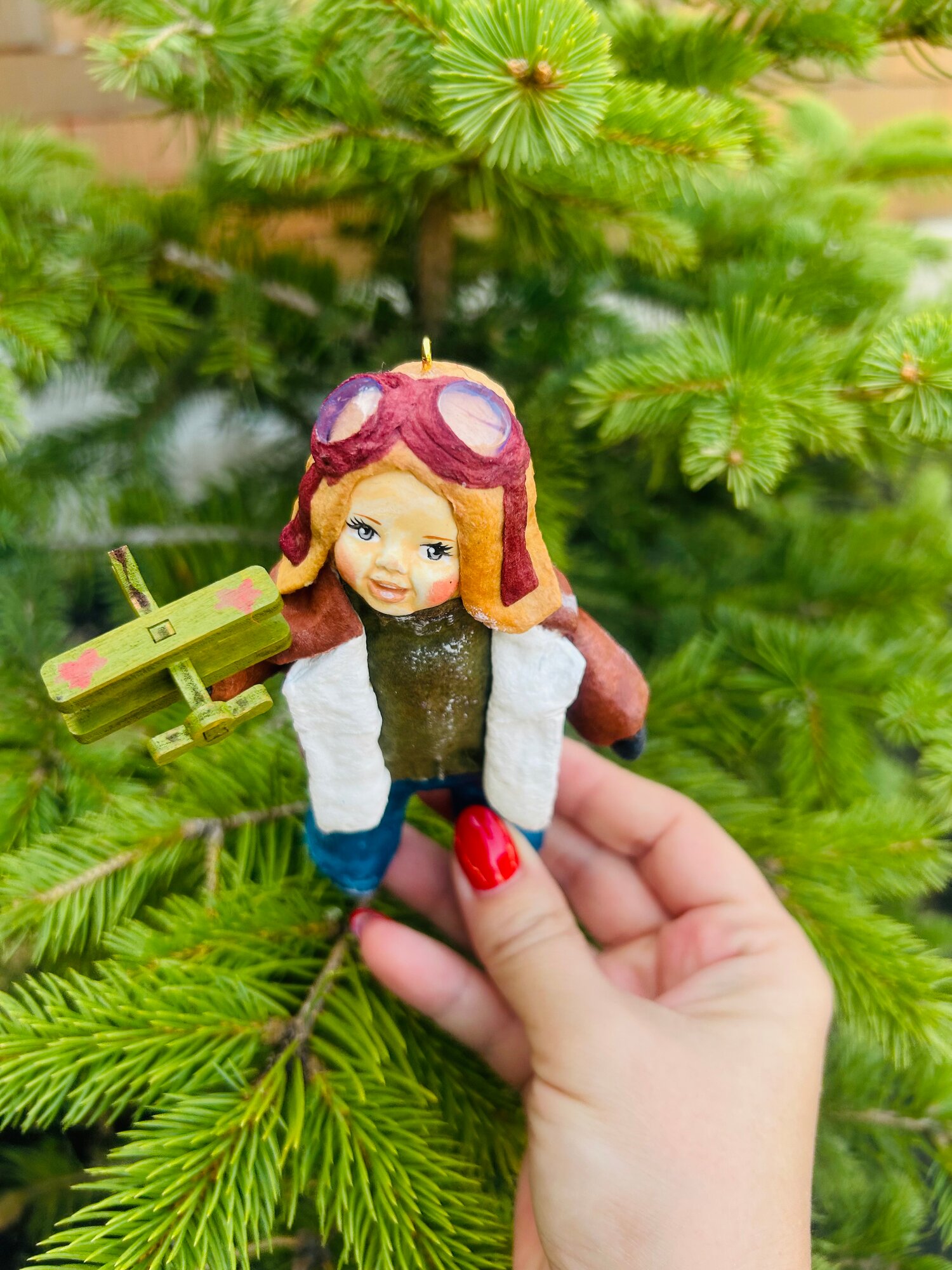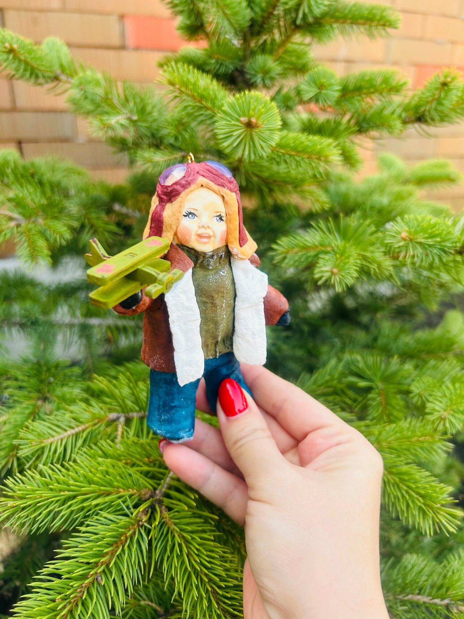 Купить Ватная елочная игрушка "Мальчик с самолетом", ручная работа, акрил, вата