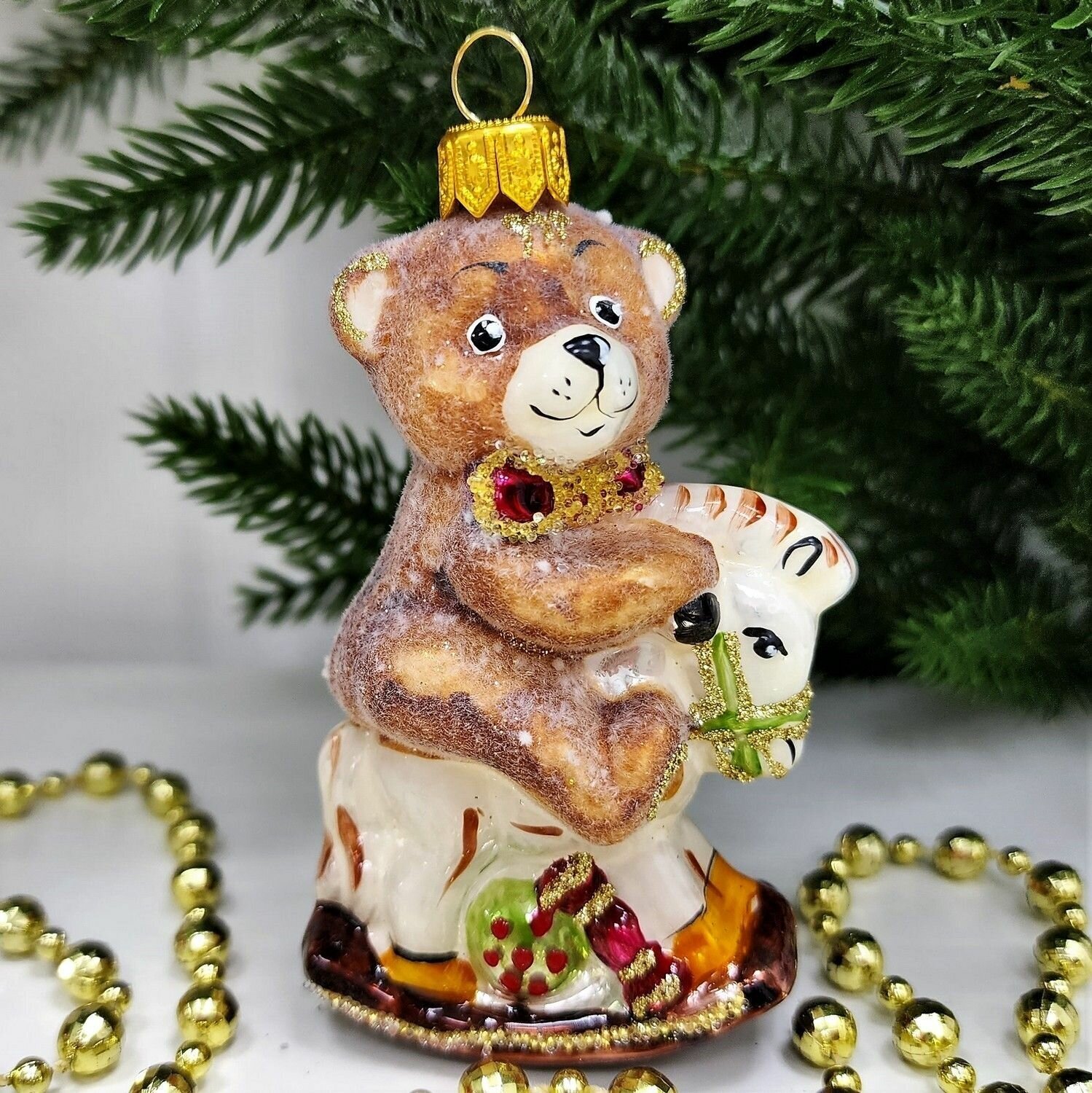 Купить Irena-Co елочная игрушка, стекло Мишка на лошадке качалке (8,5х6х5см)