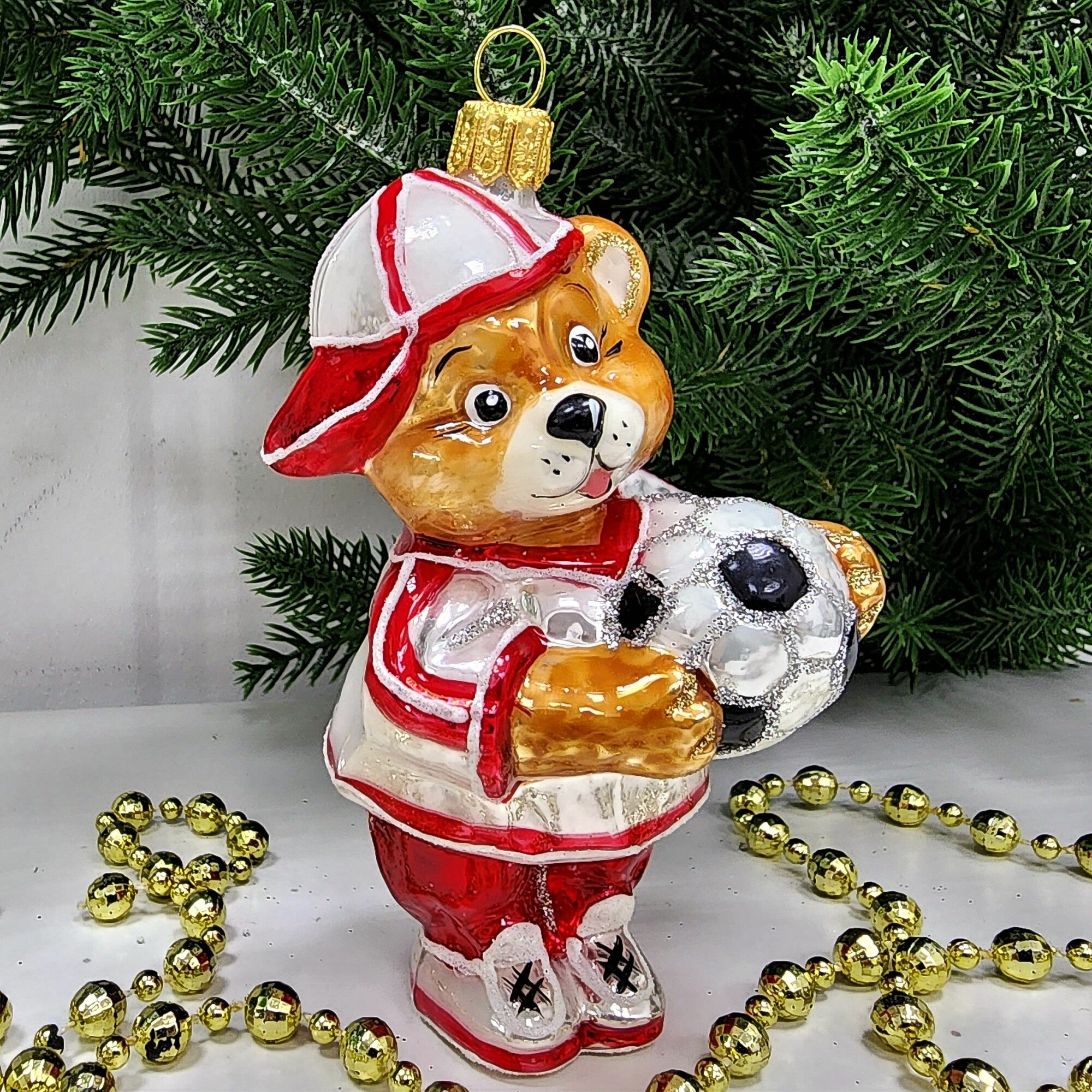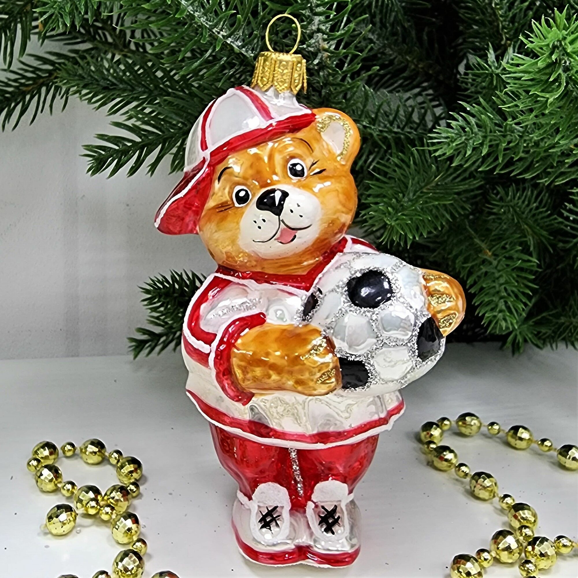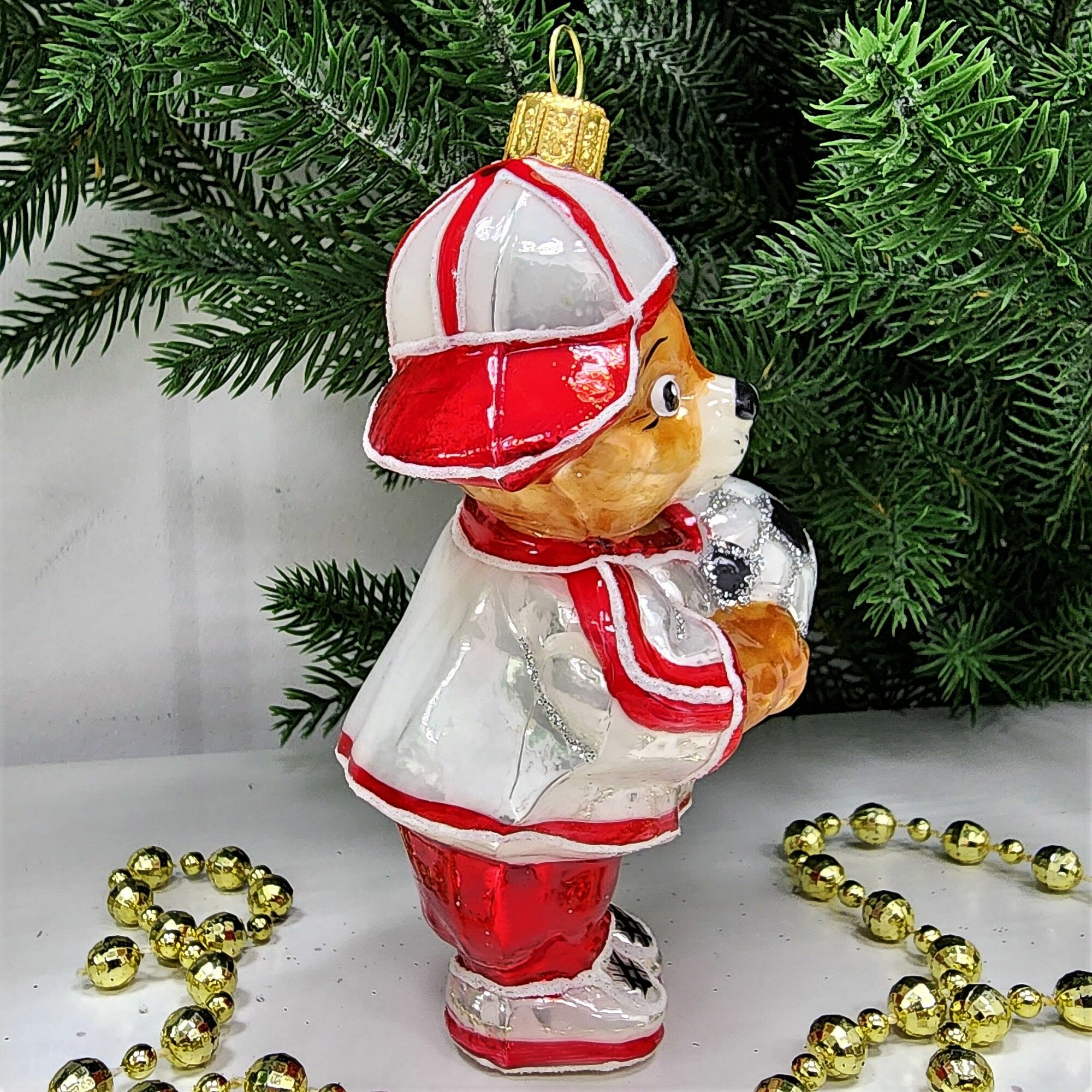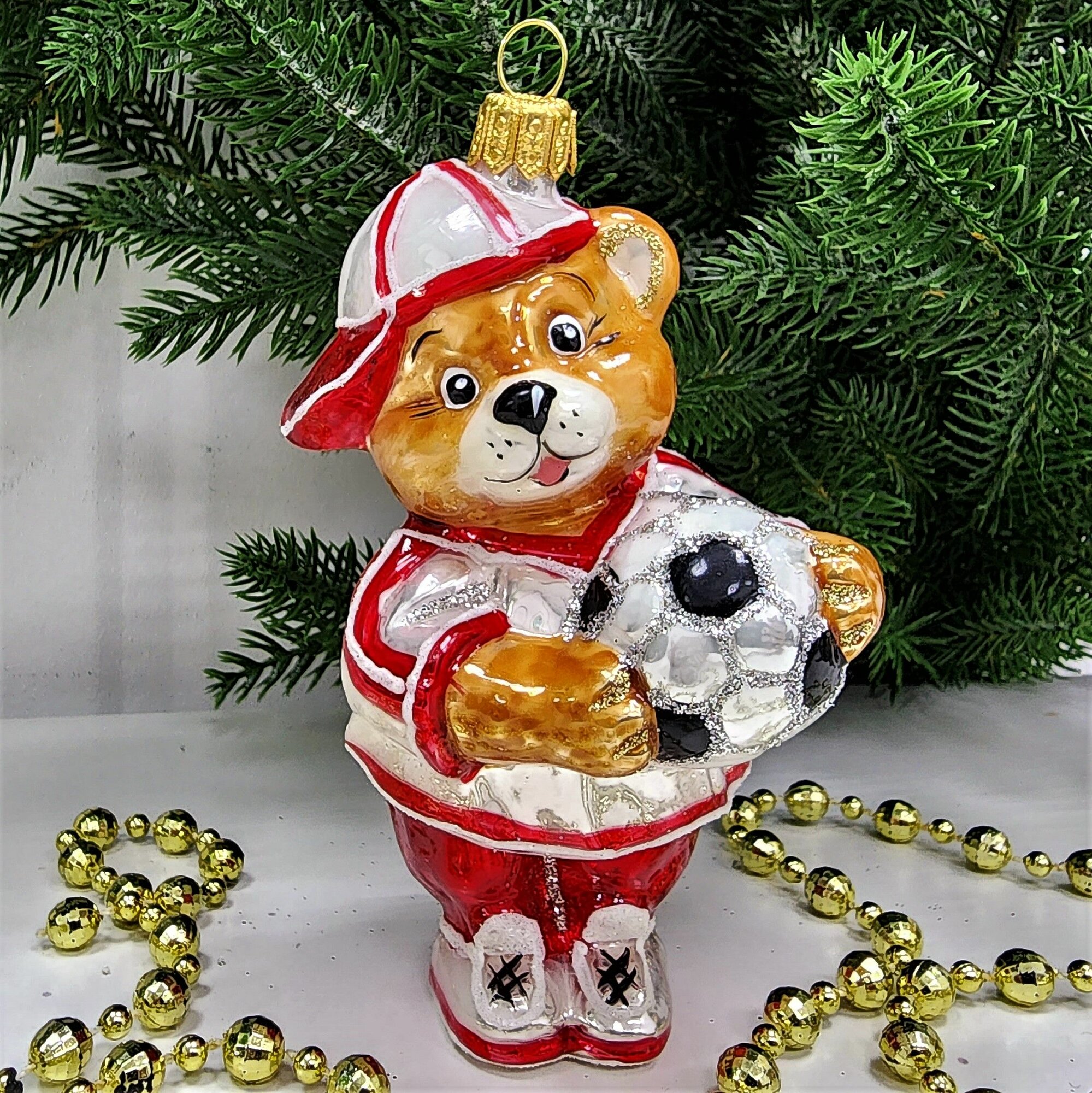 Irena-Co елочная игрушка, стекло Мишка футболист (9х5,5х5см)