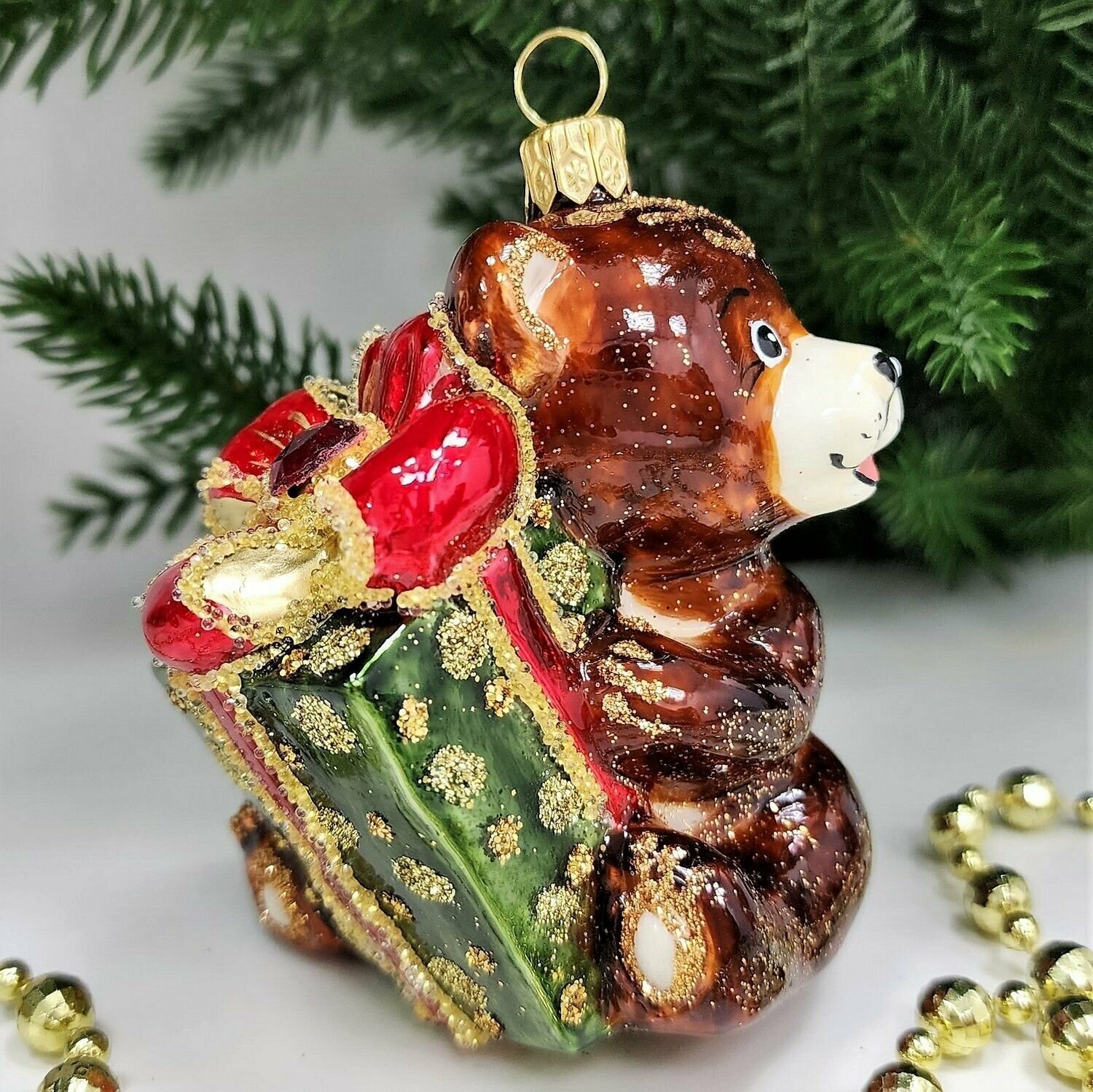 Купить Irena-Co елочная игрушка, стекло Мишка с подарком (9,5х7,5х7см)