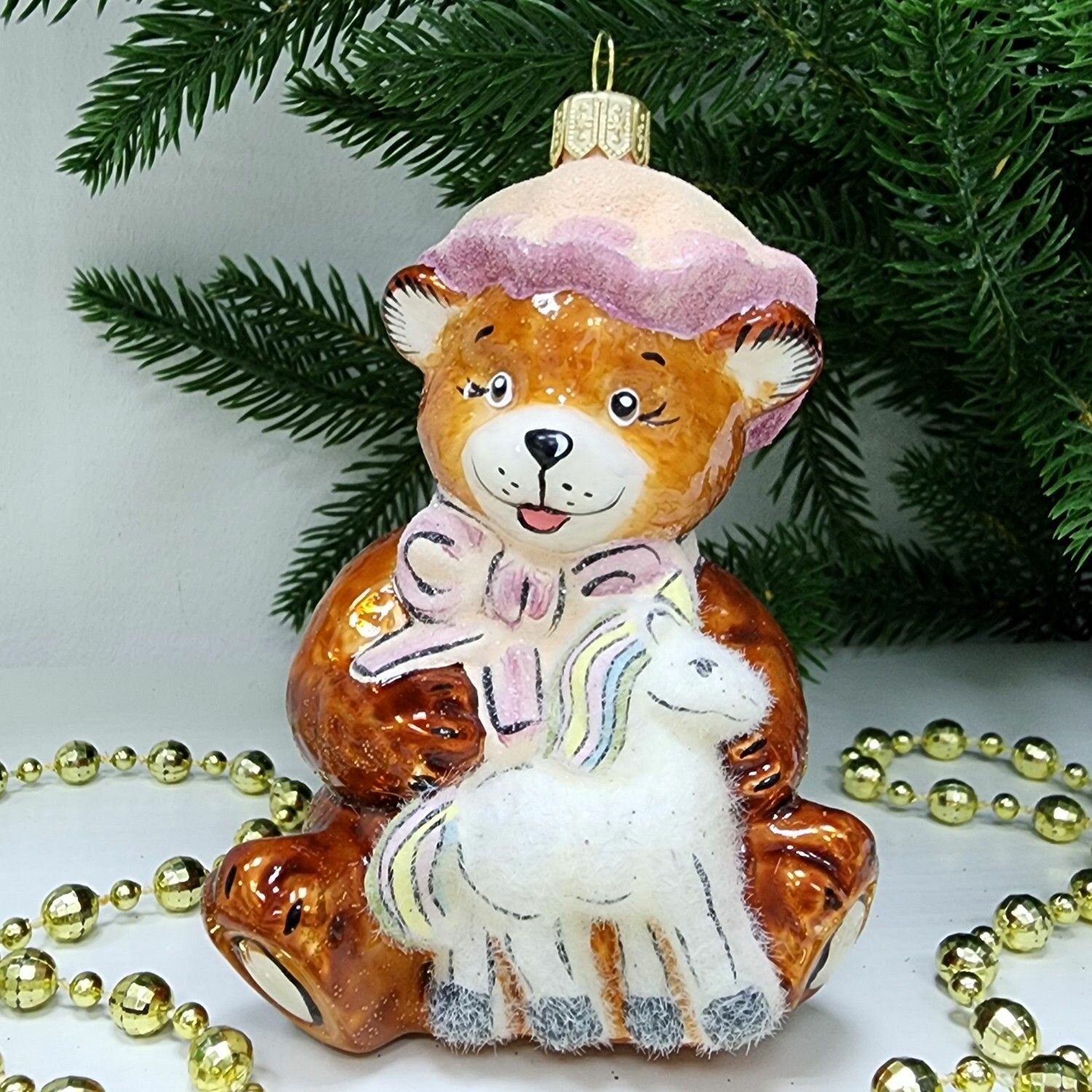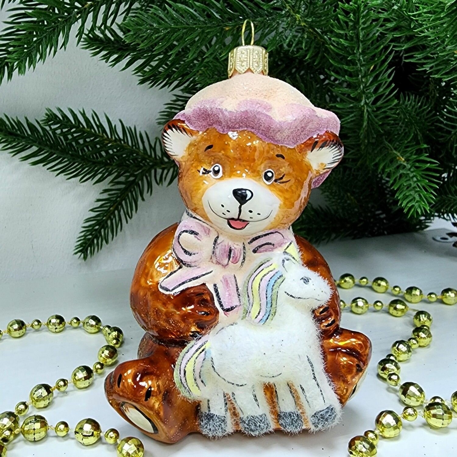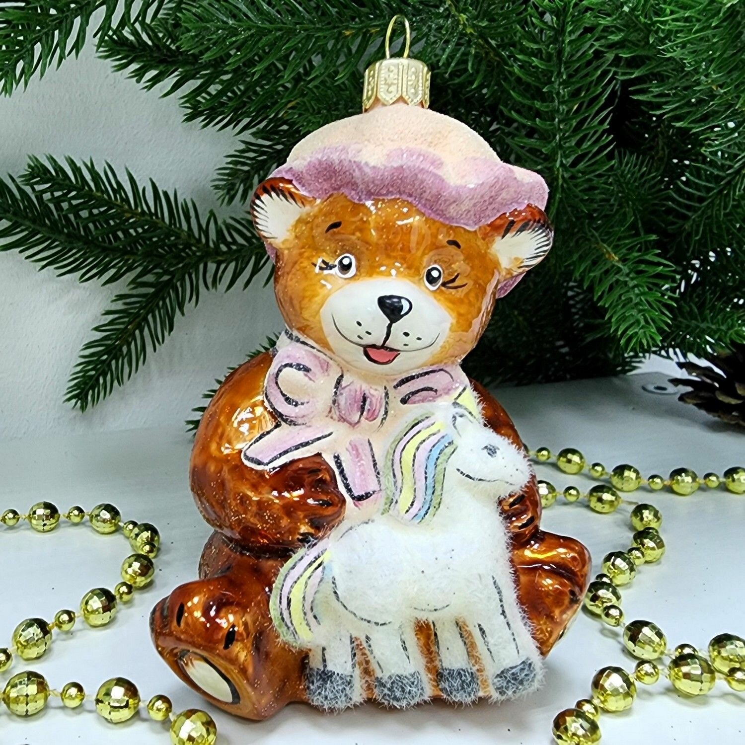 Купить Irena-Co елочная игрушка, стекло Мишка с лошадкой (10,5х7,5х6см)