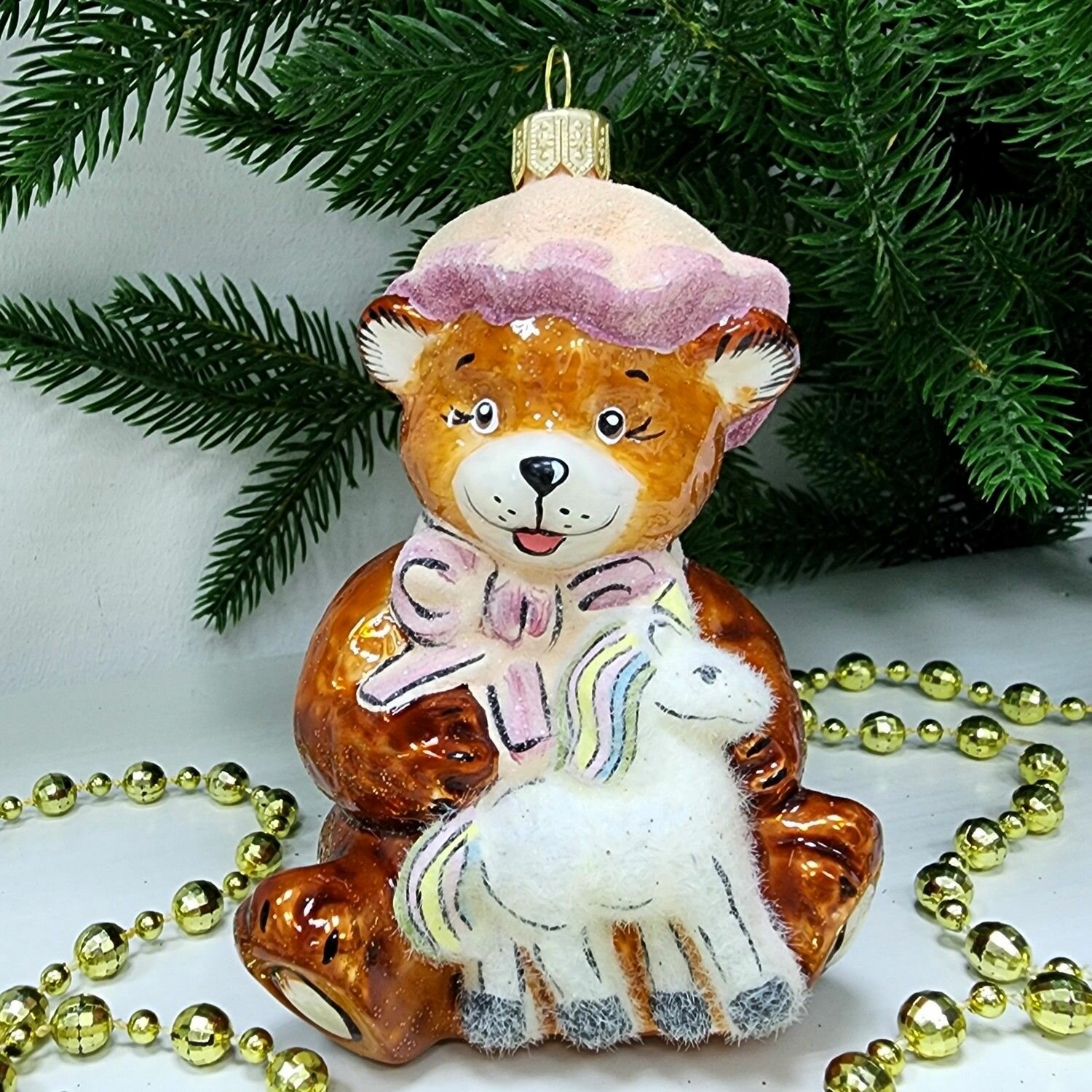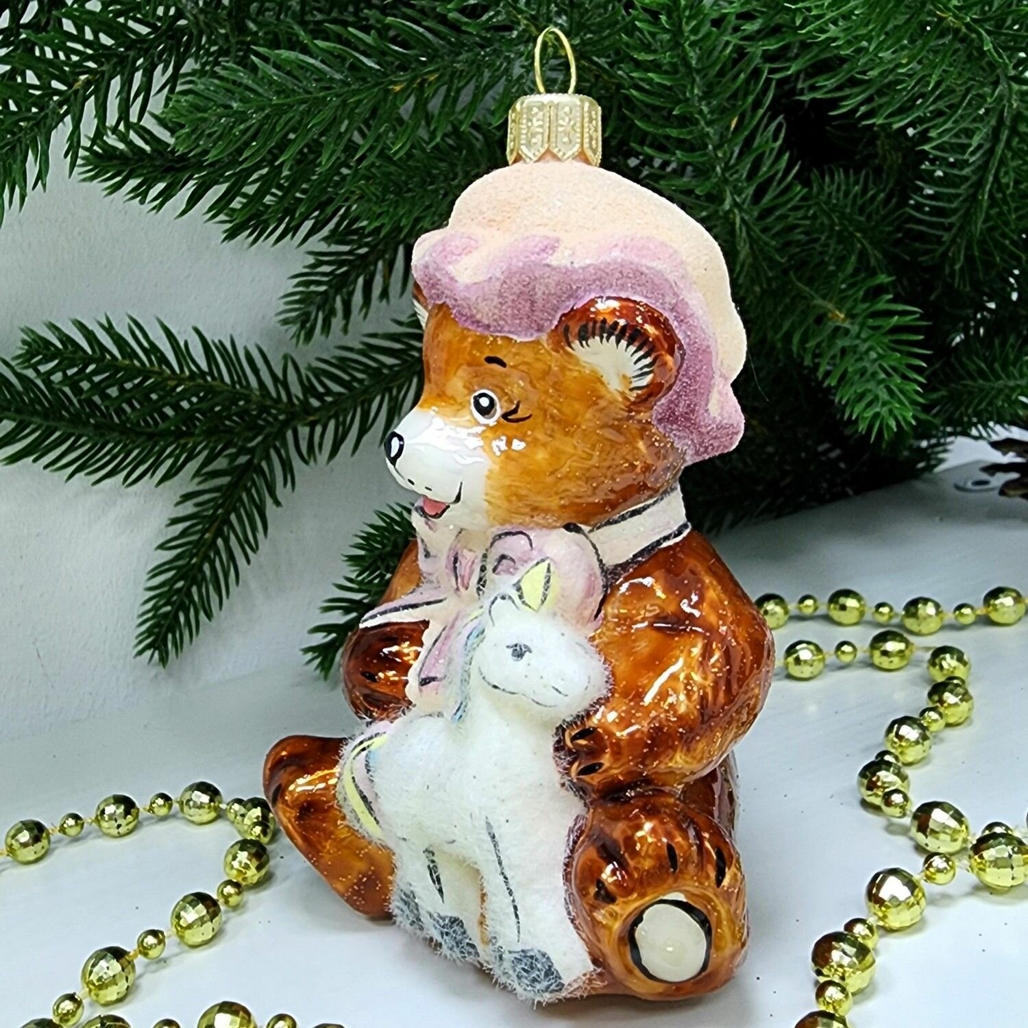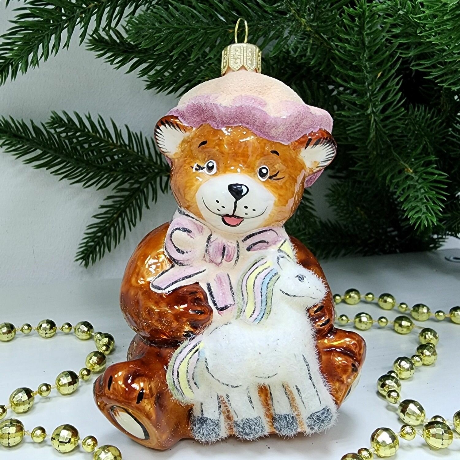 Купить Irena-Co елочная игрушка, стекло Мишка с лошадкой (10,5х7,5х6см)