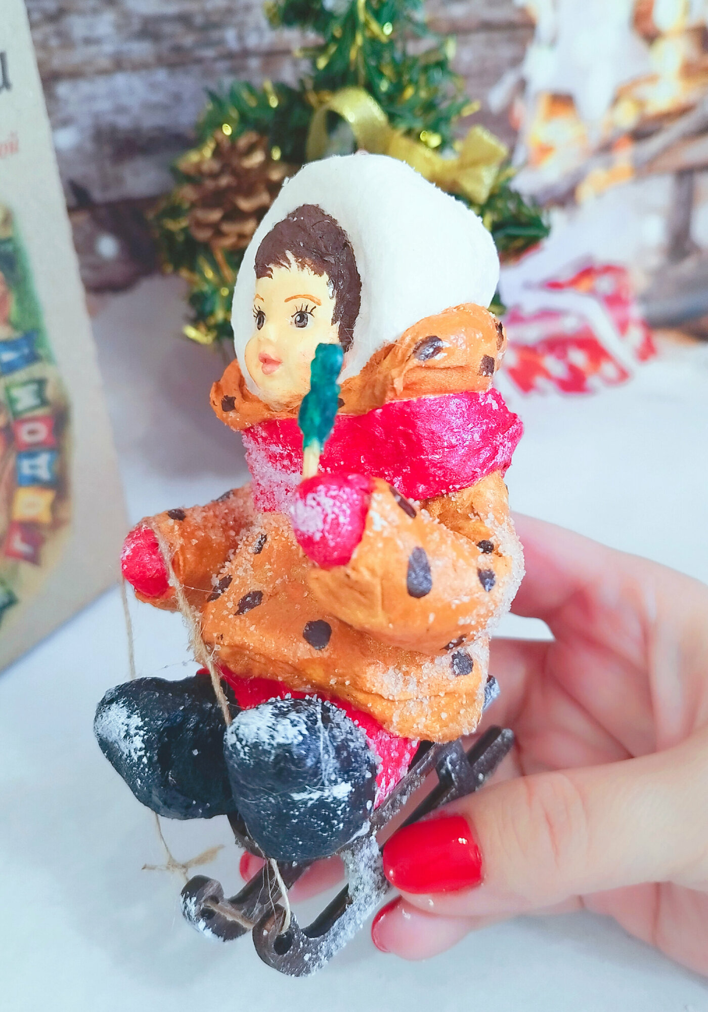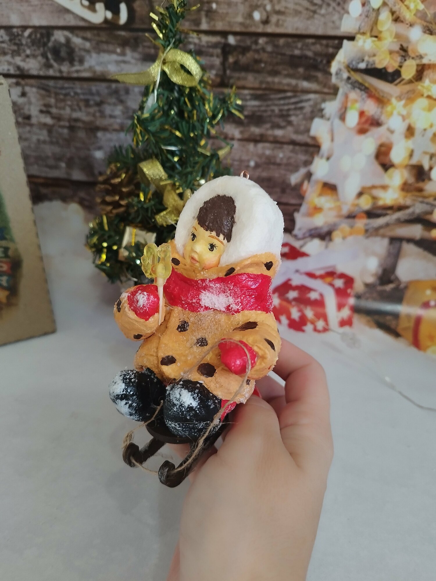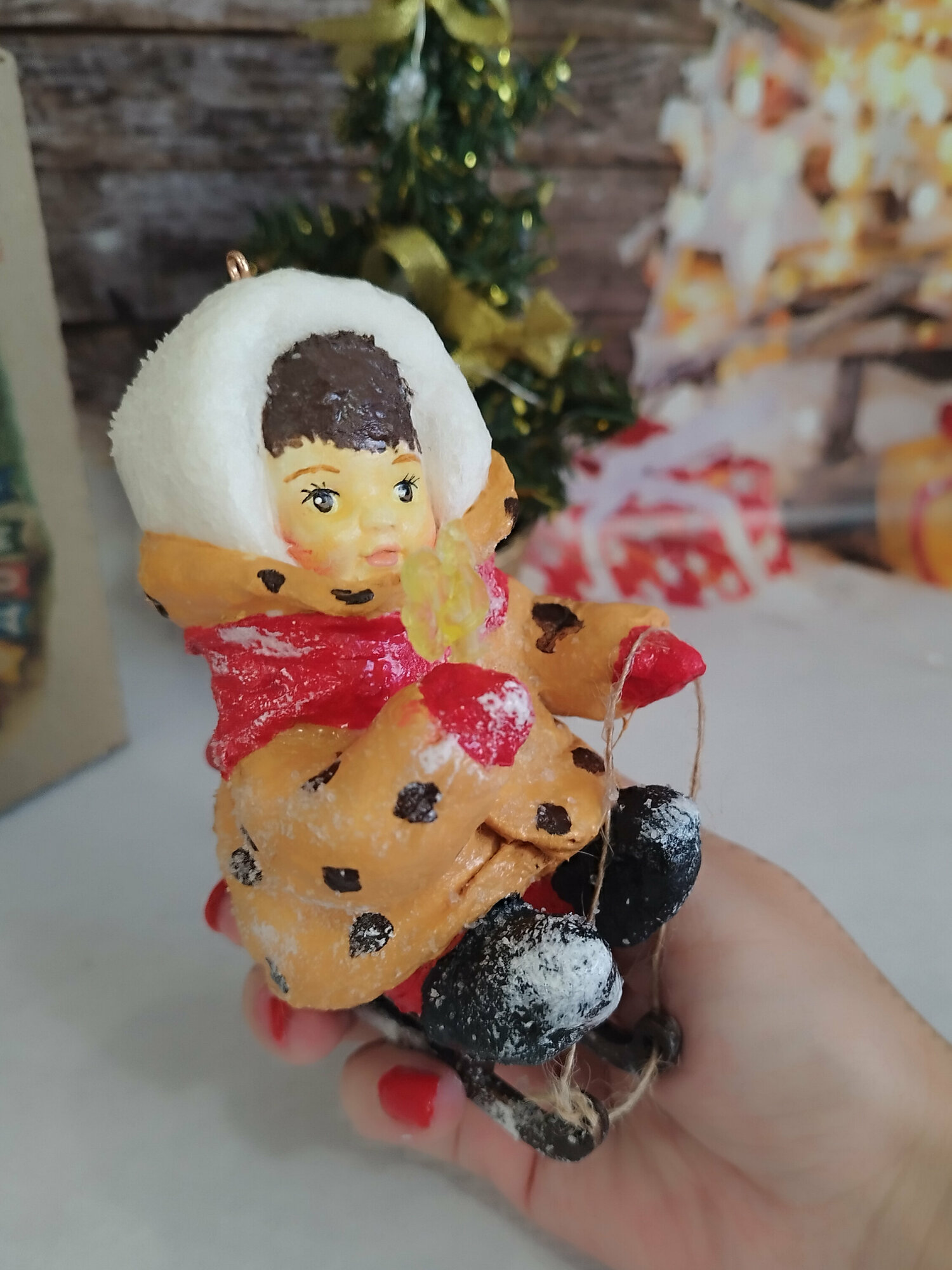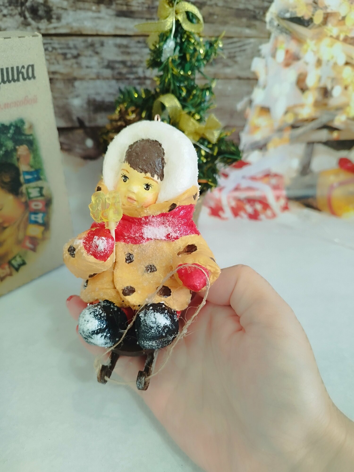 Ватная елочная игрушка - малышка на санках с крендельком , с леденцом интересное: