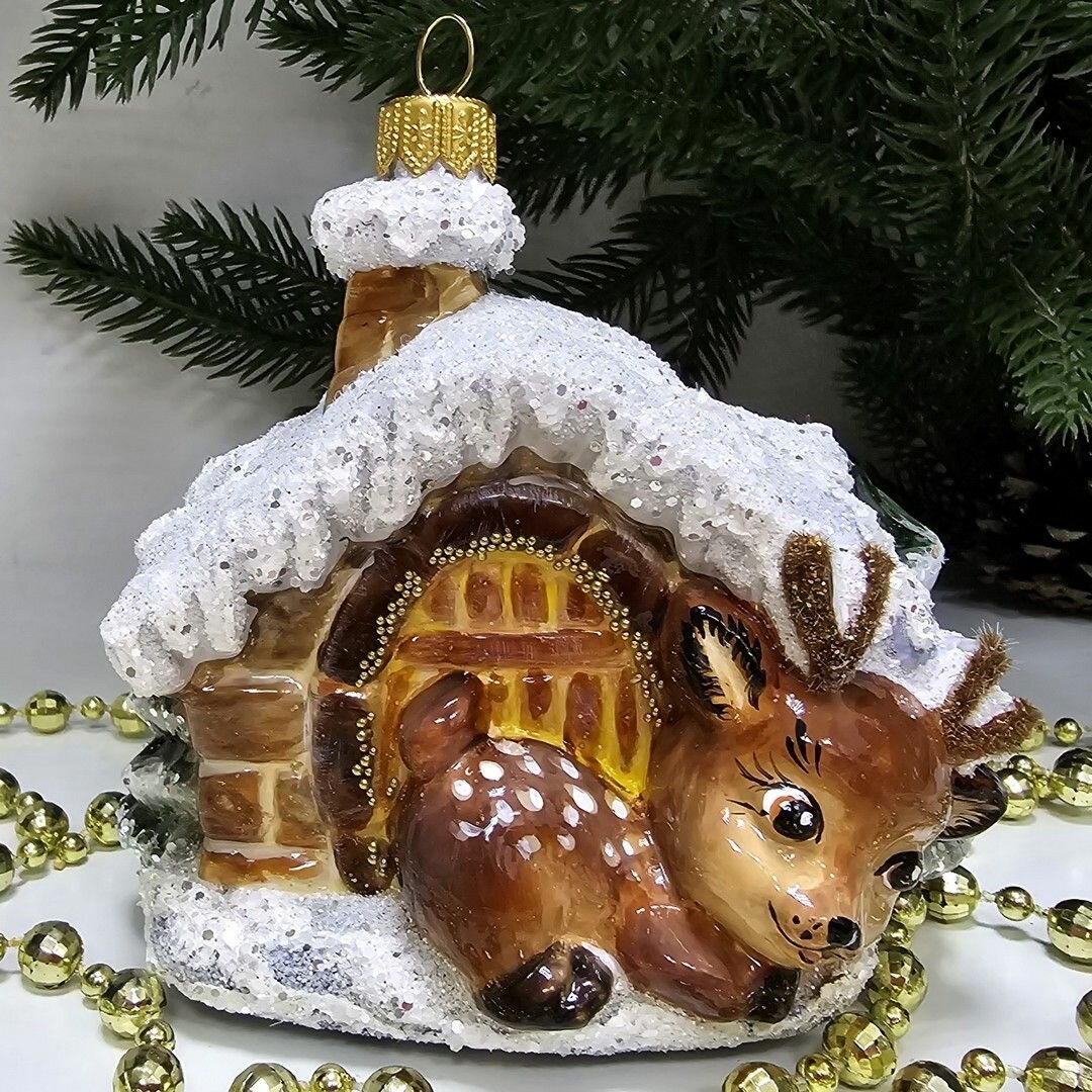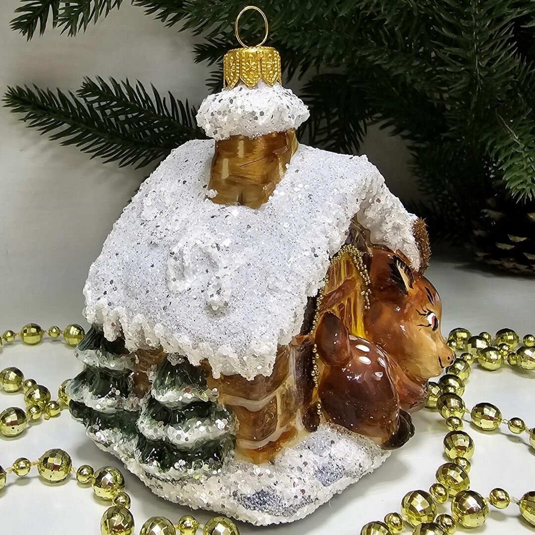 Купить Irena-Co елочная игрушка, стекло Домик с олененком (9,5х10х7см)