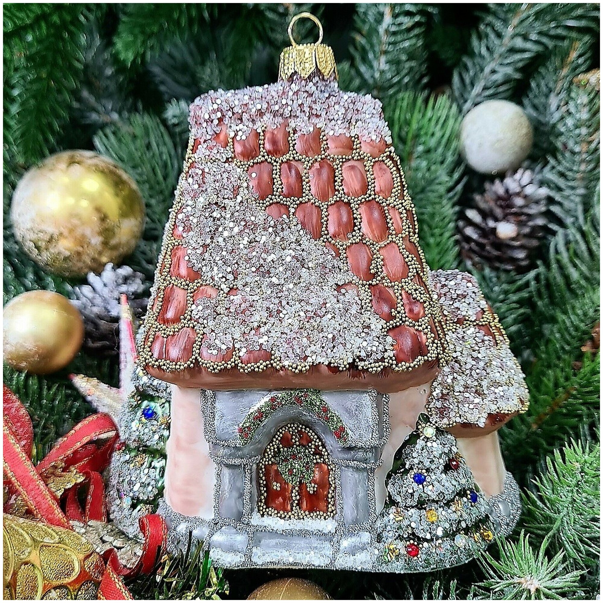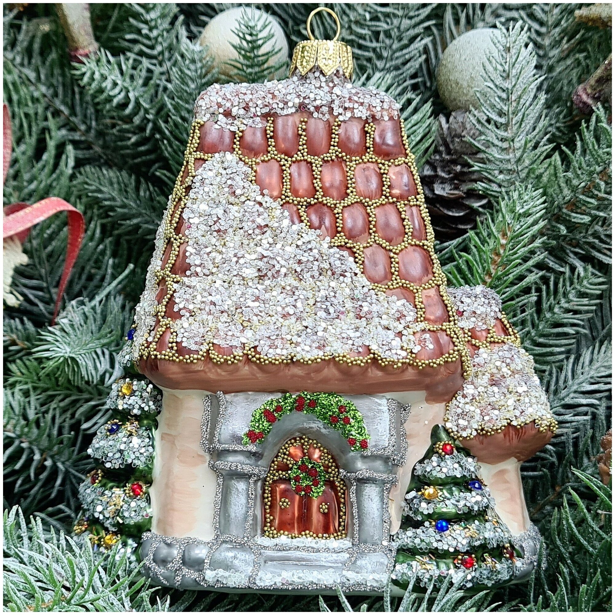Irena-Co елочная игрушка, стекло Домик с острой крышей винтаж (12,5х7,5х5,5см)