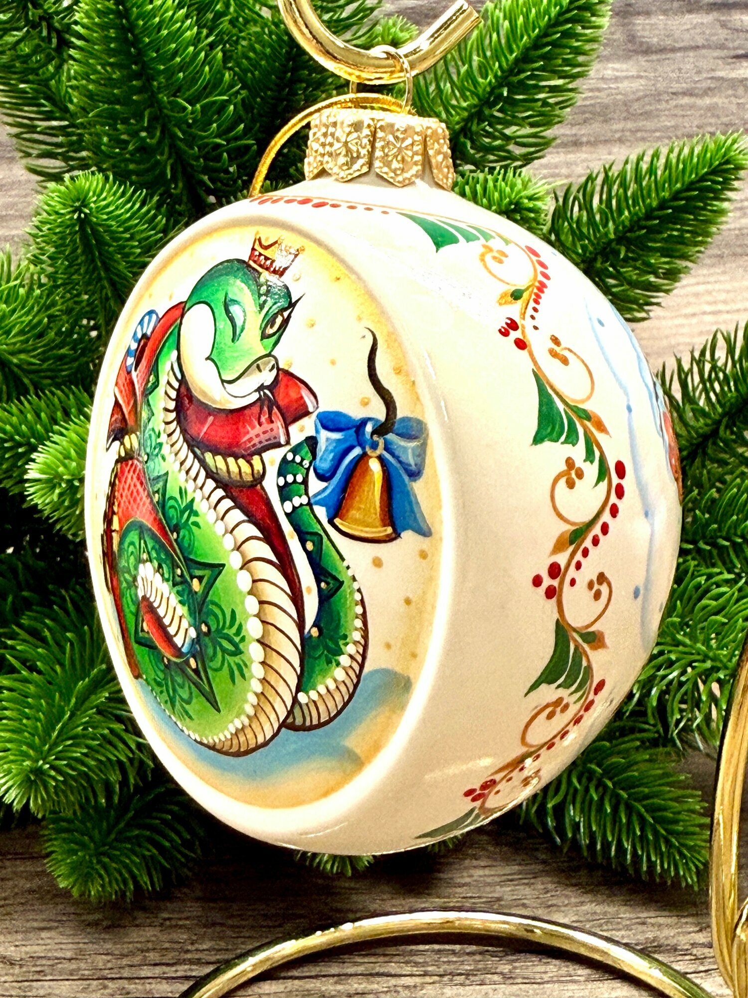 Елочный шар плоский "Змея-царевна", фарфор, ручная роспись, диаметр 8см интересное: