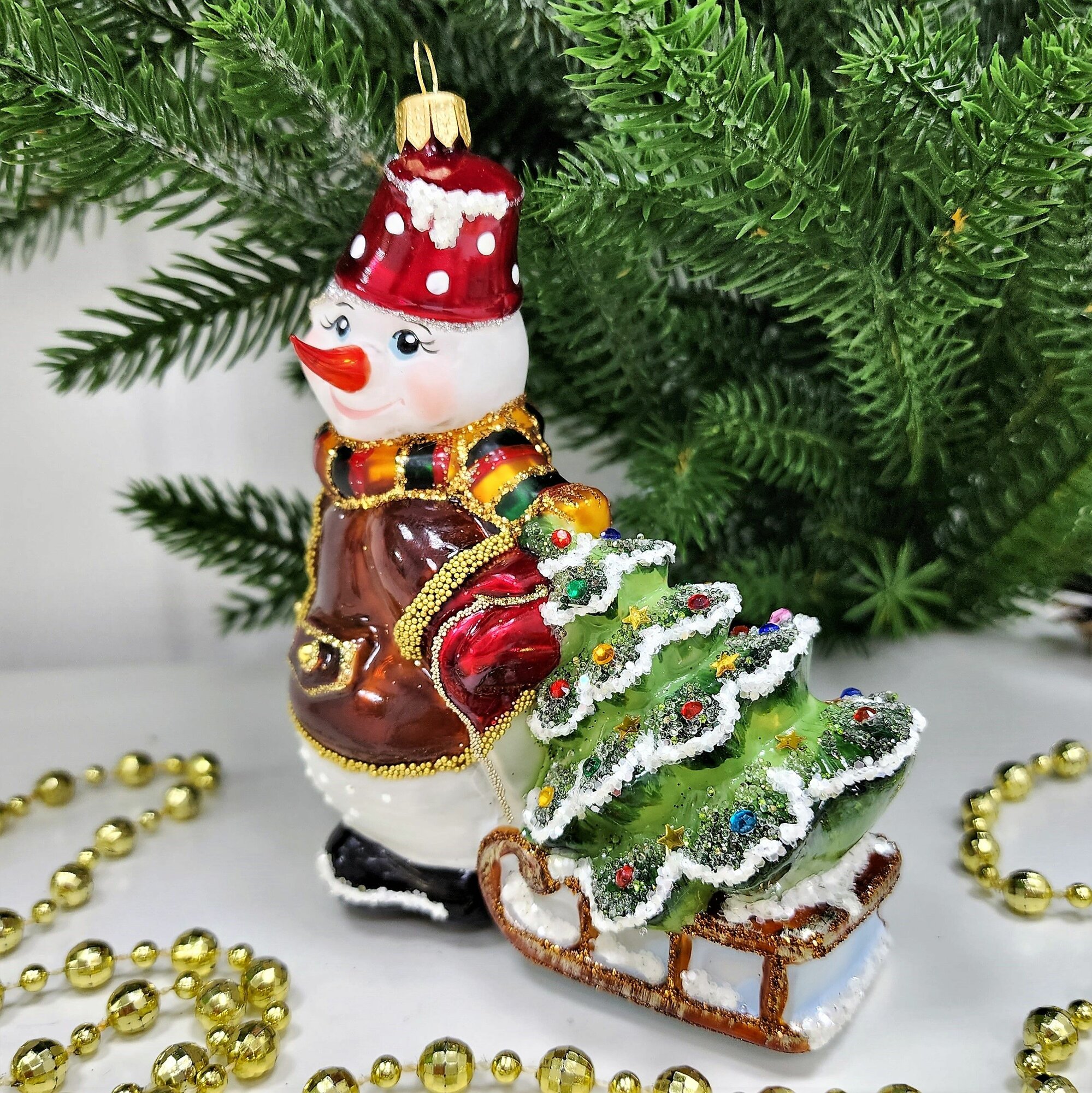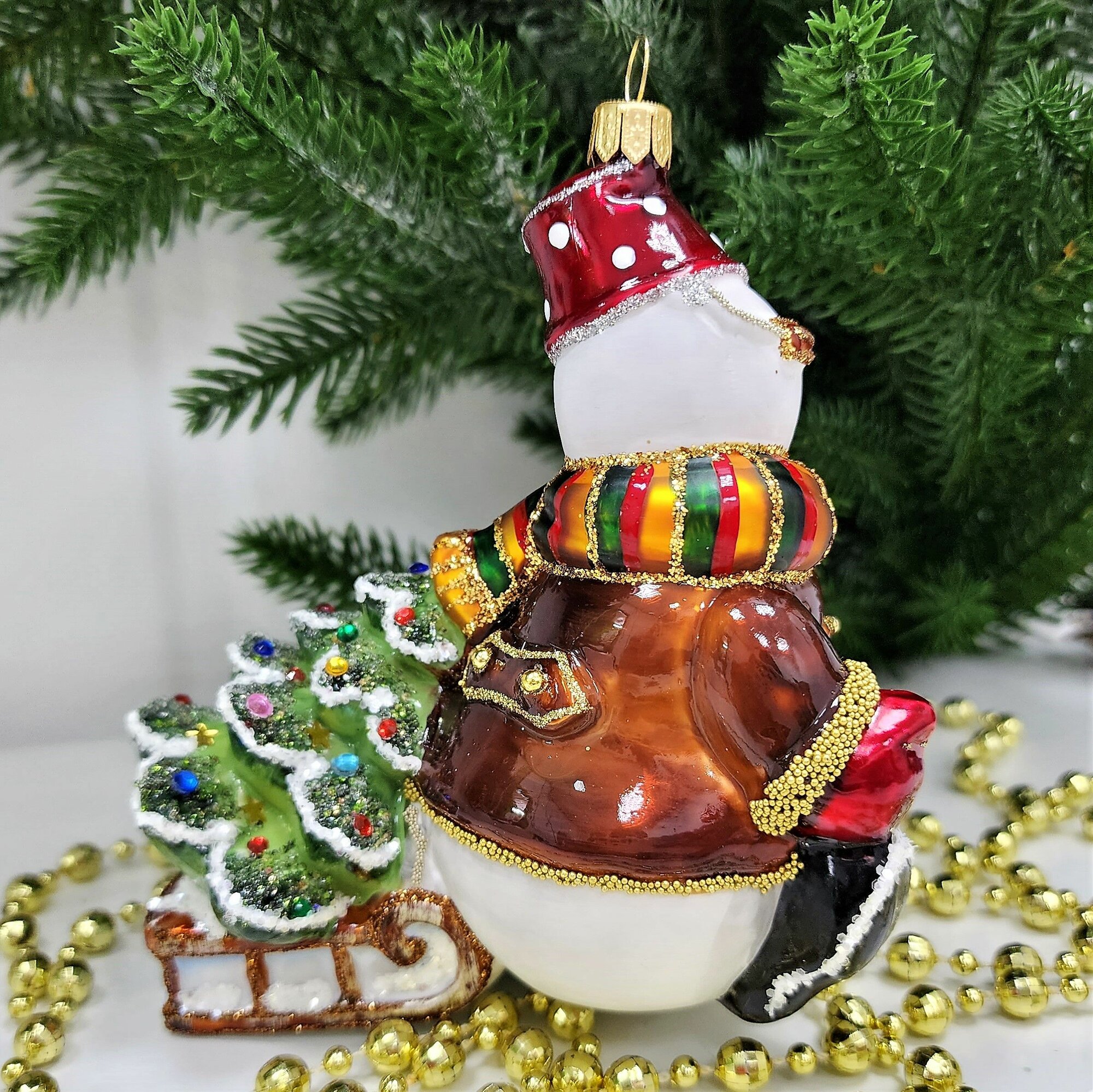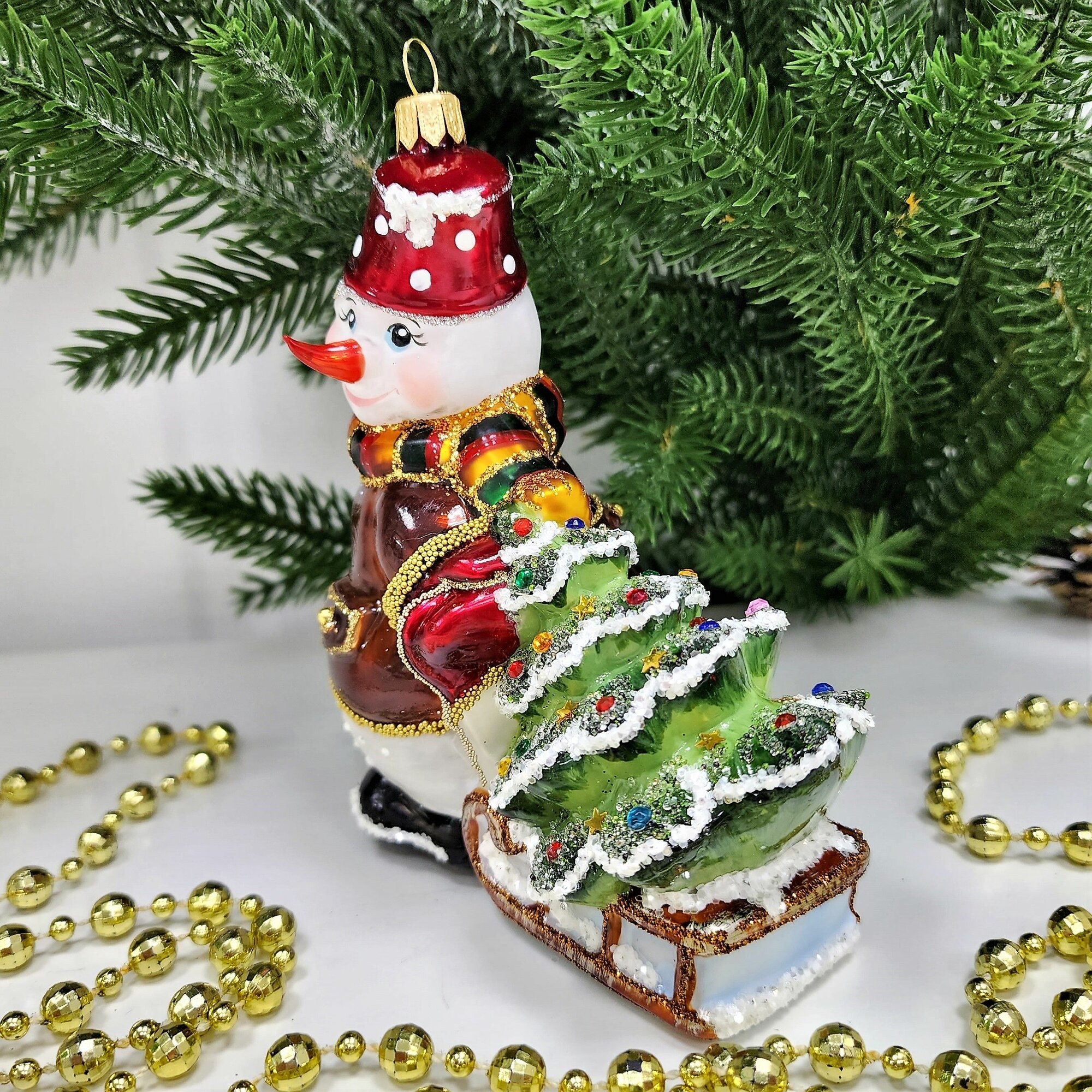 Купить Irena-Co елочная игрушка, стекло Снеговик тянет саночки (12х11,5х6см)
